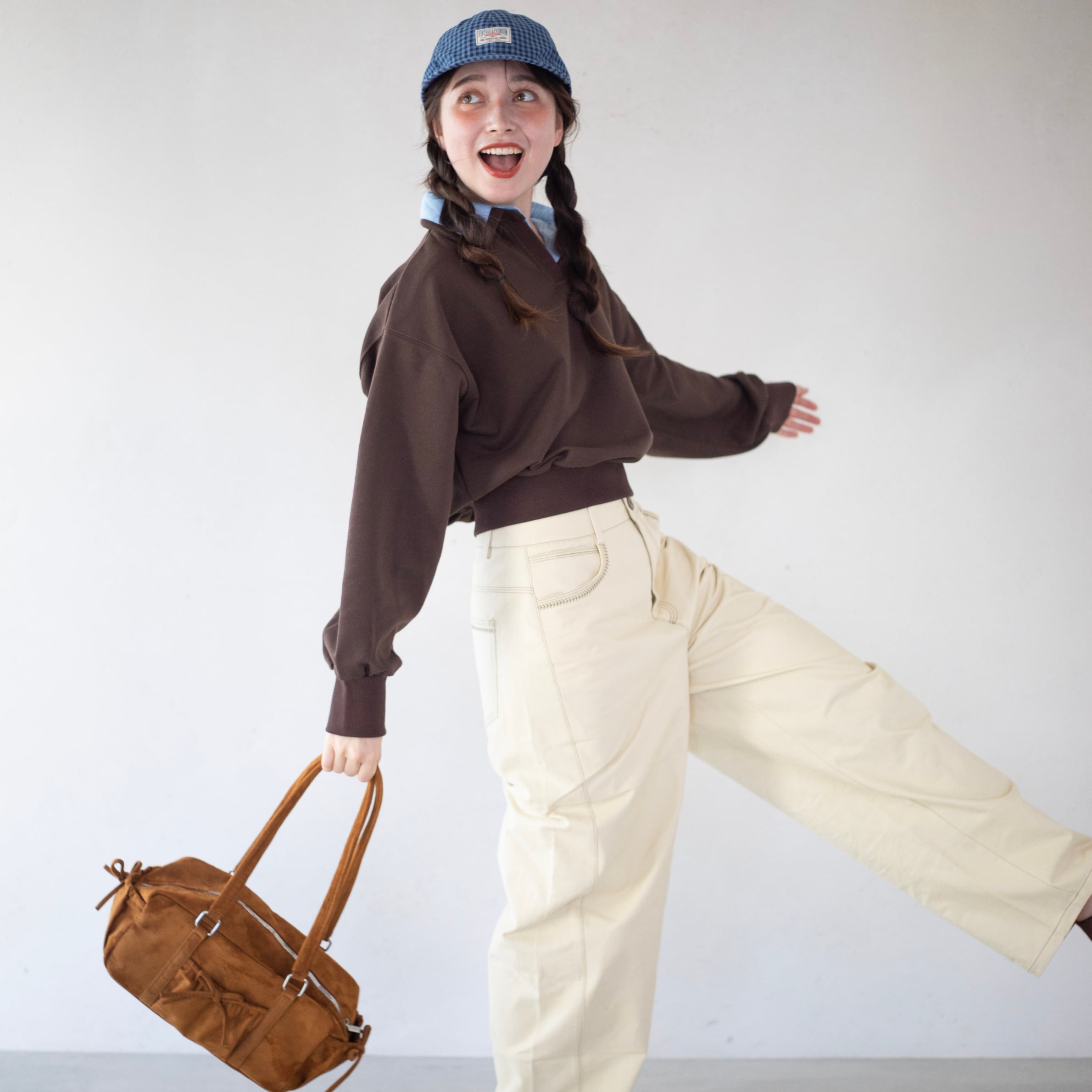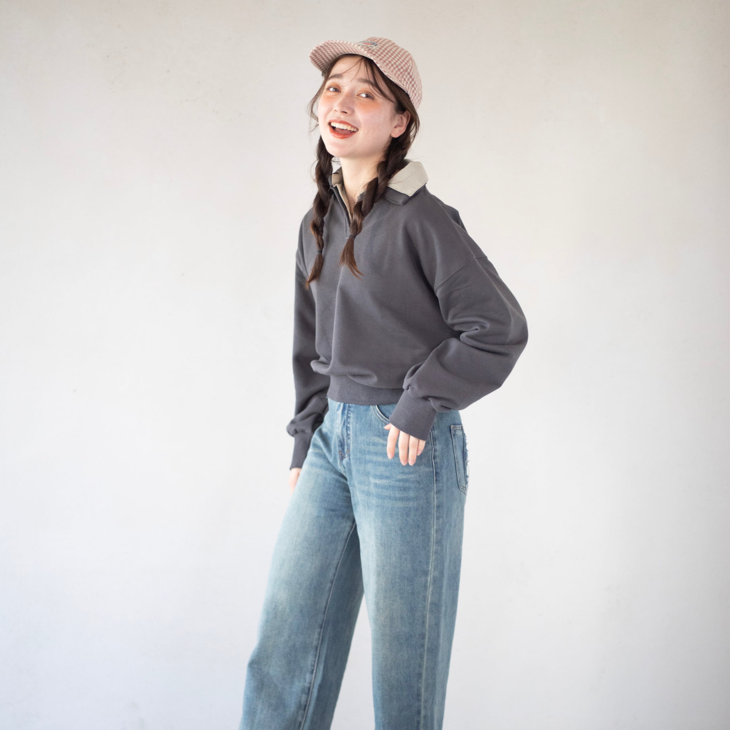 襟部分のバイカラーデザインが目を引くスウェットトップス。
