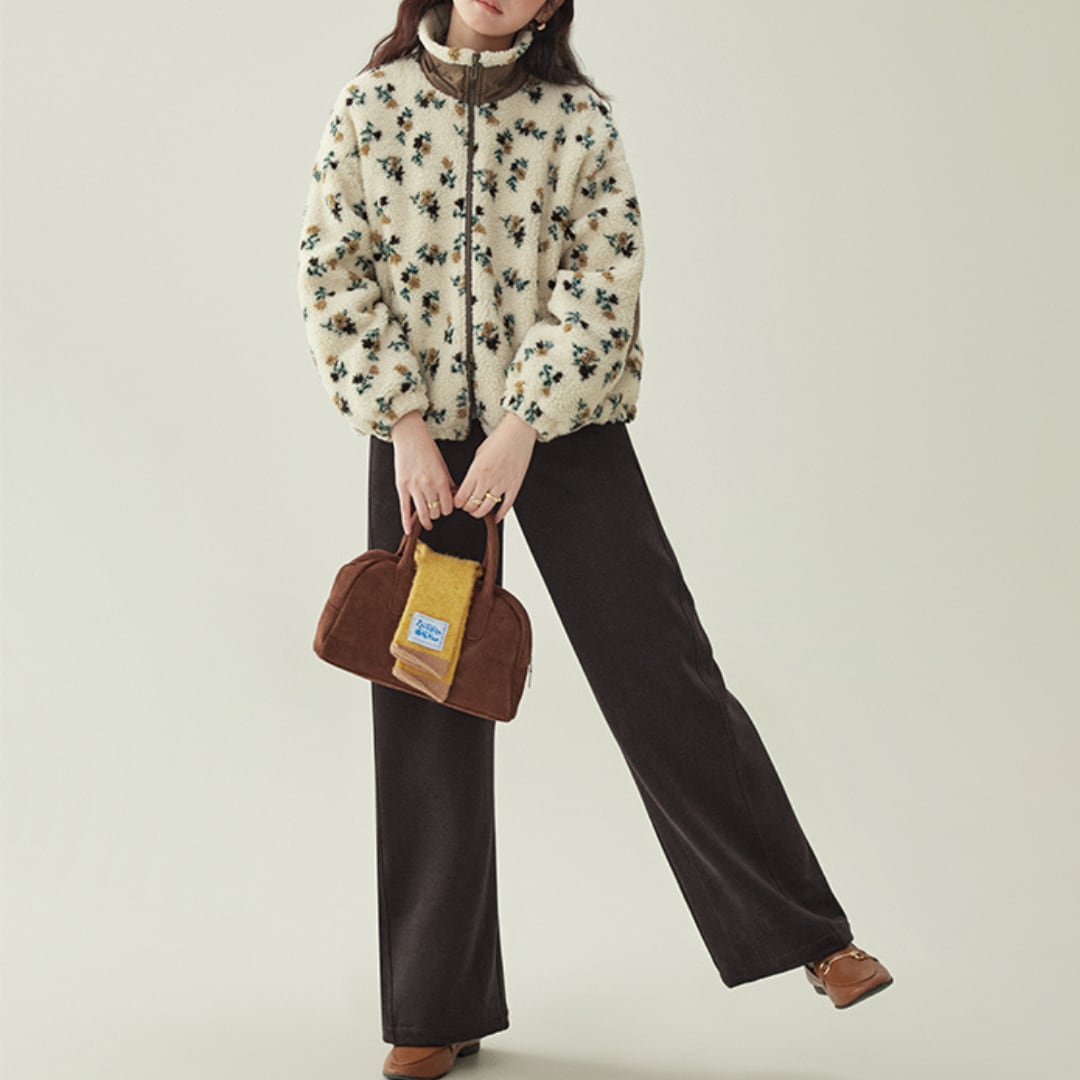 ふんわりとしたボア素材に小花柄がちりばめられた、やさしい雰囲気のスタンドカラーブルゾン。