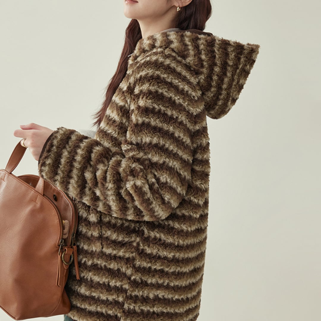 ふんわりとした起毛感と立体的なストライプ柄が魅力のフェイクファーブルゾン。