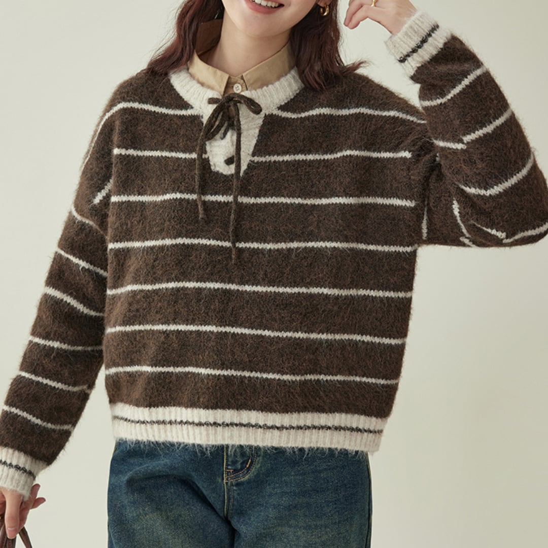 ふんわりとした質感とボーダー柄がやさしい印象を与える、リボン付きのニットプルオーバー。