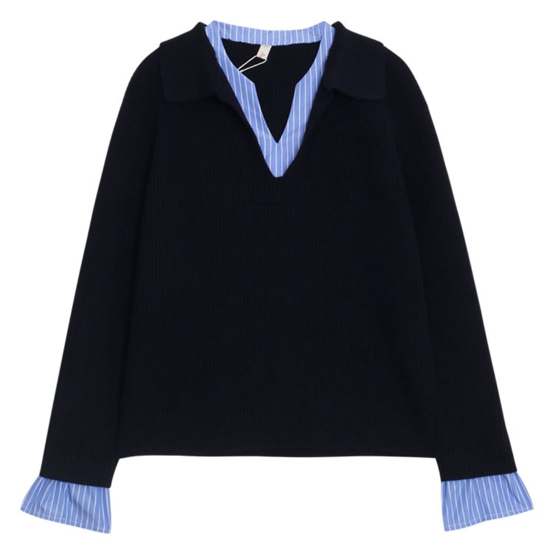 シャツのような襟元が特徴的なレイヤード風デザインのニットトップス。