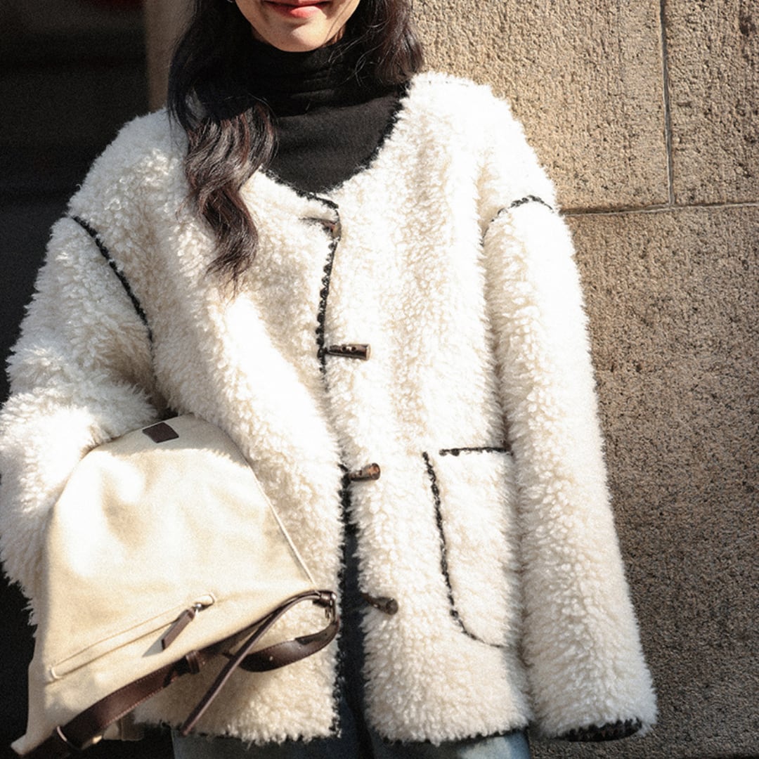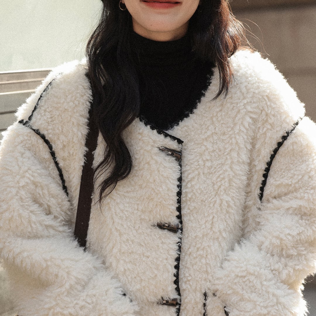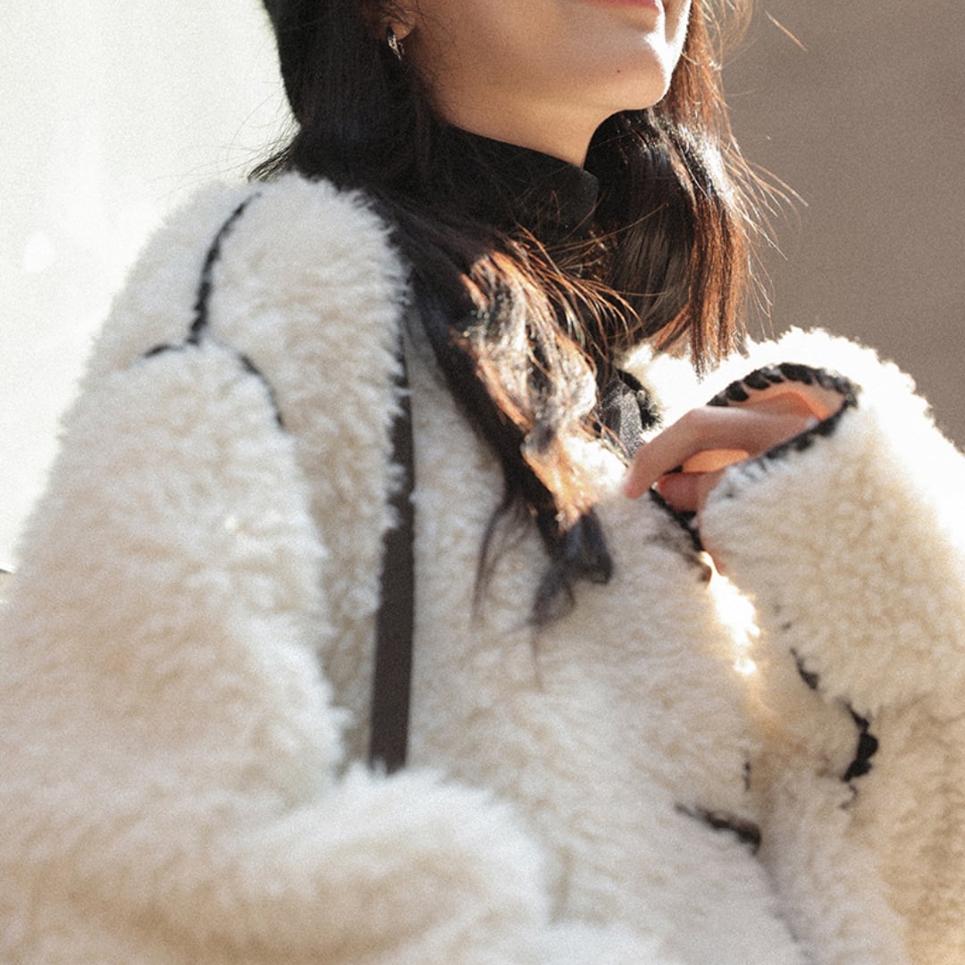 立体感のあるふわふわのボア素材に、縁取りデザインがアクセントになった存在感のあるアウター。