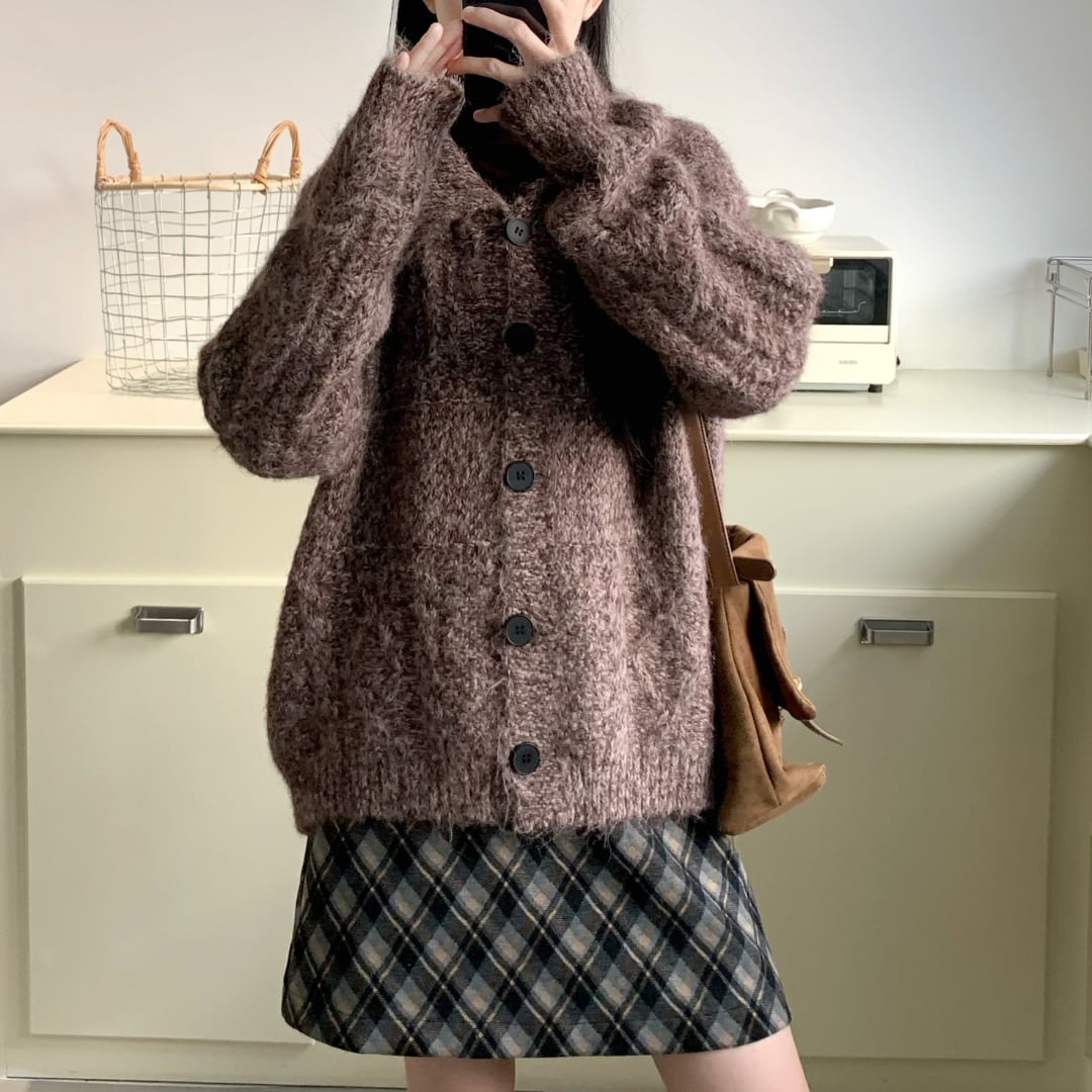 起毛感のあるやわらかな風合いと、ゆったりシルエットが魅力のニットカーディガン。