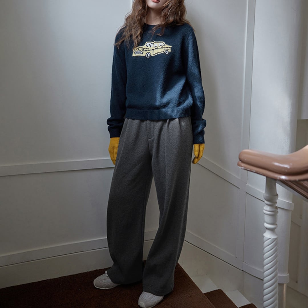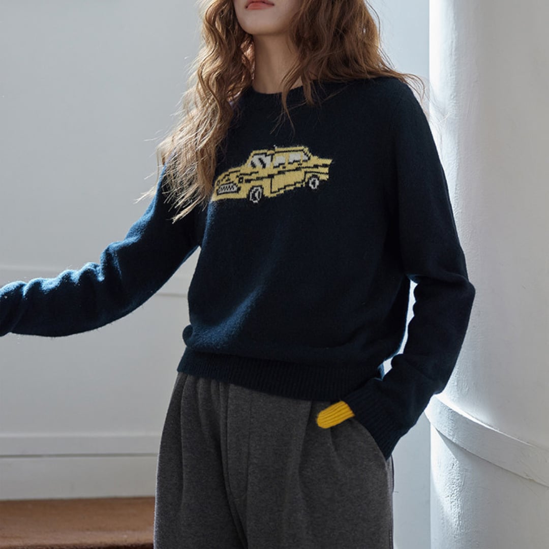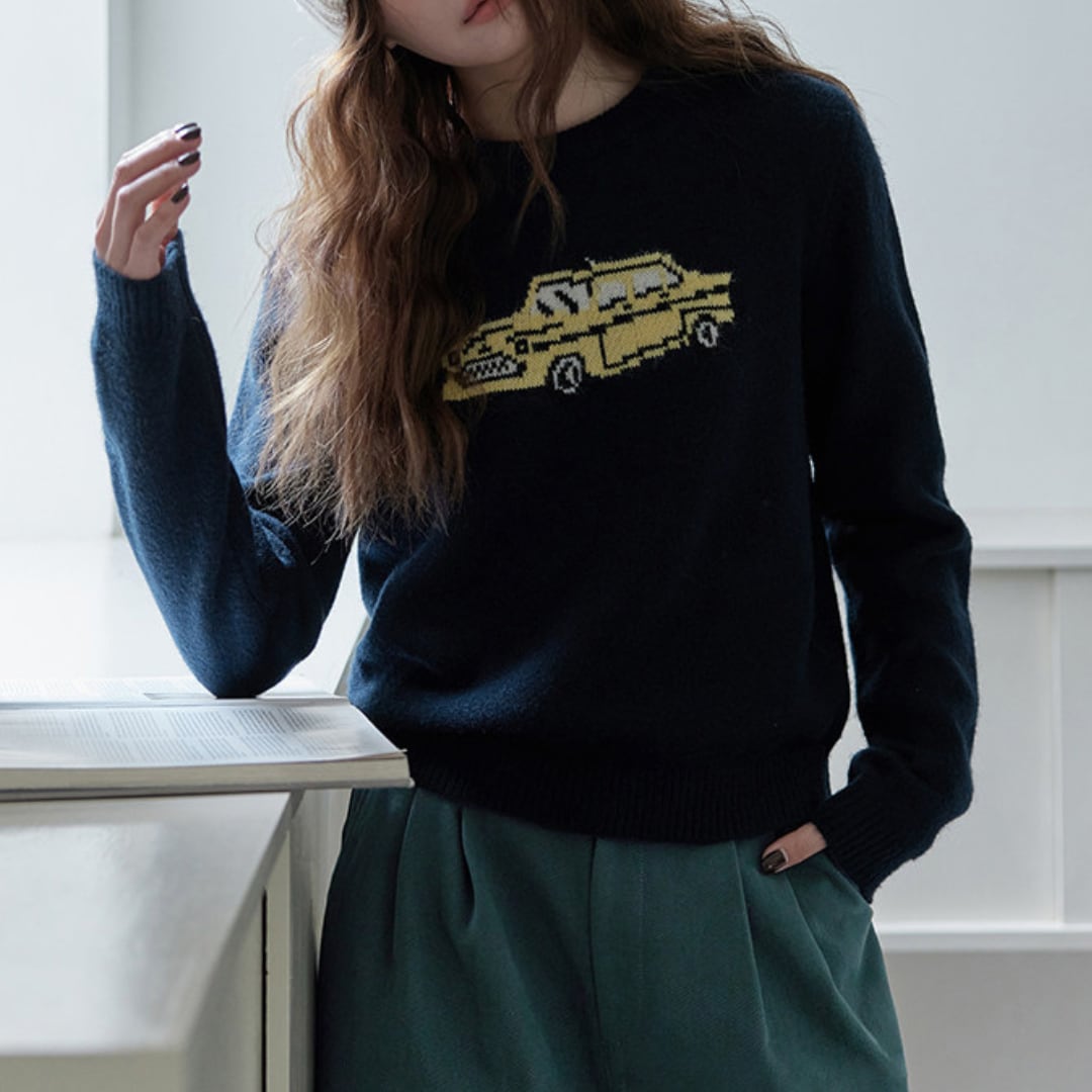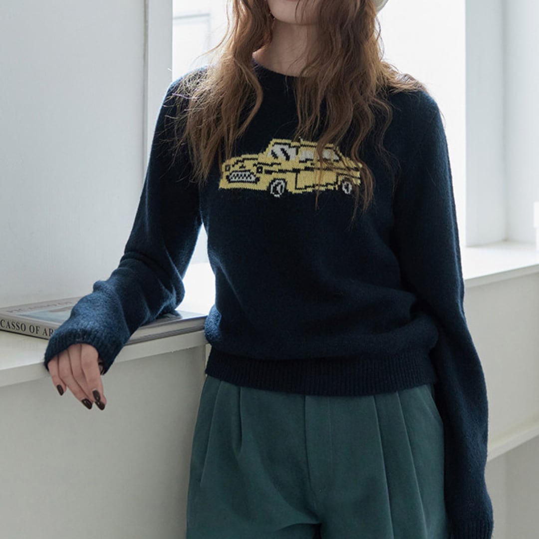 クラシックなカーデザインが胸元に施された、遊び心あふれるラウンドネックニット。