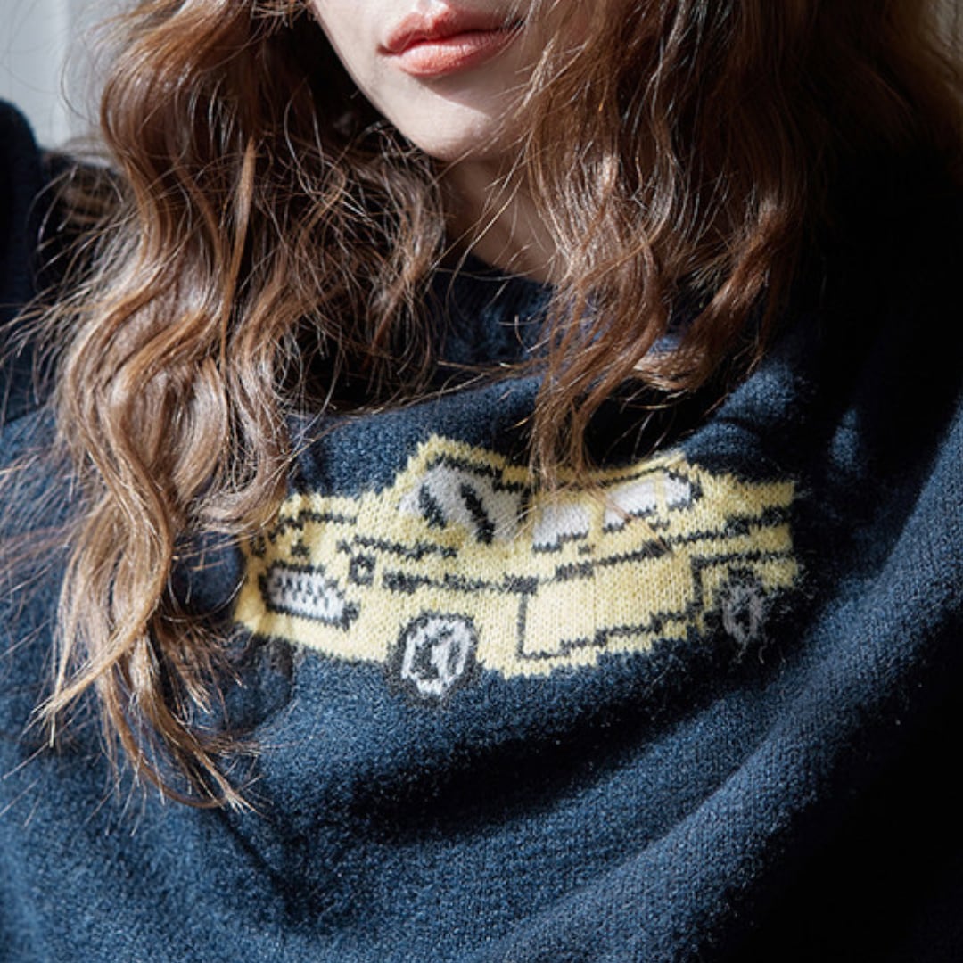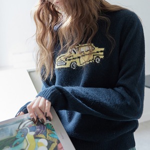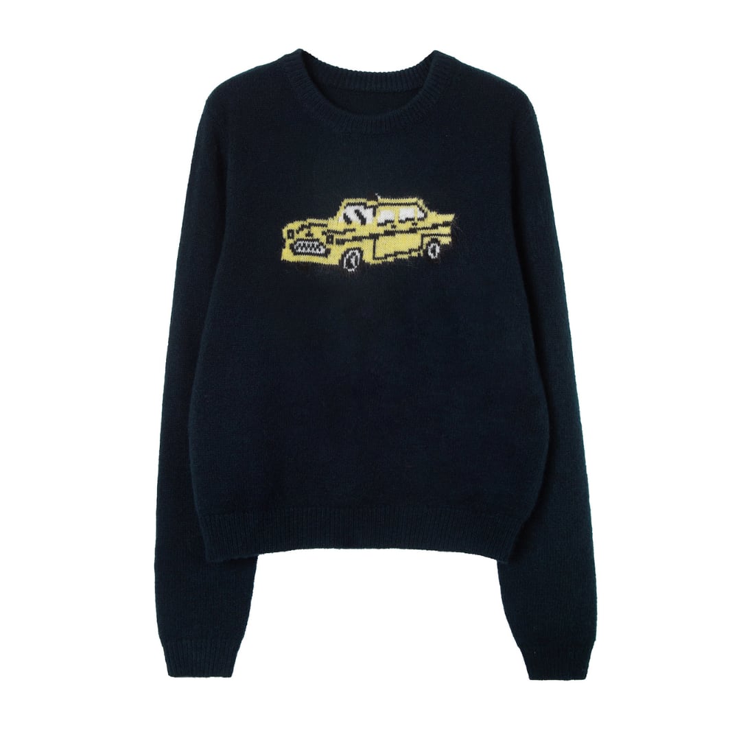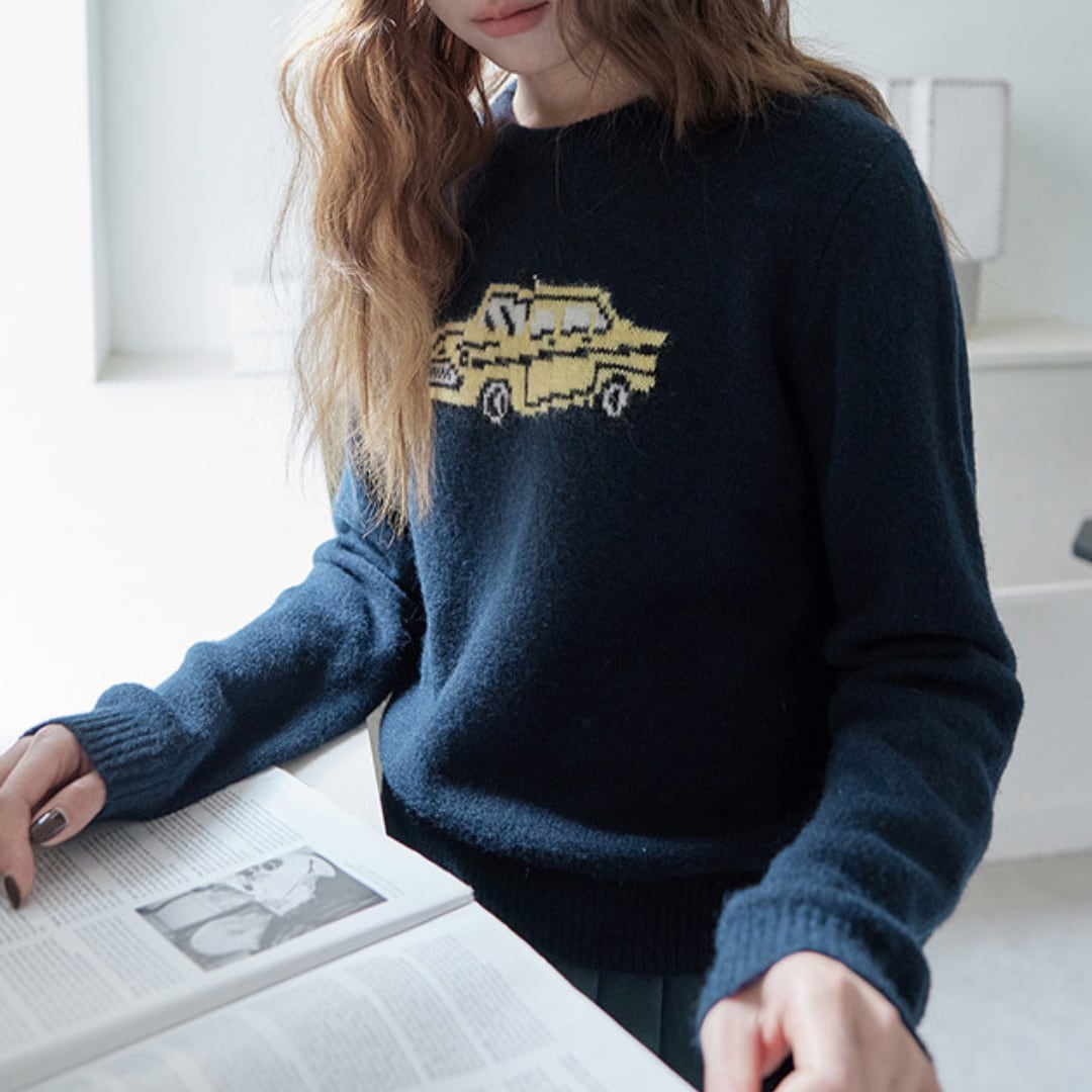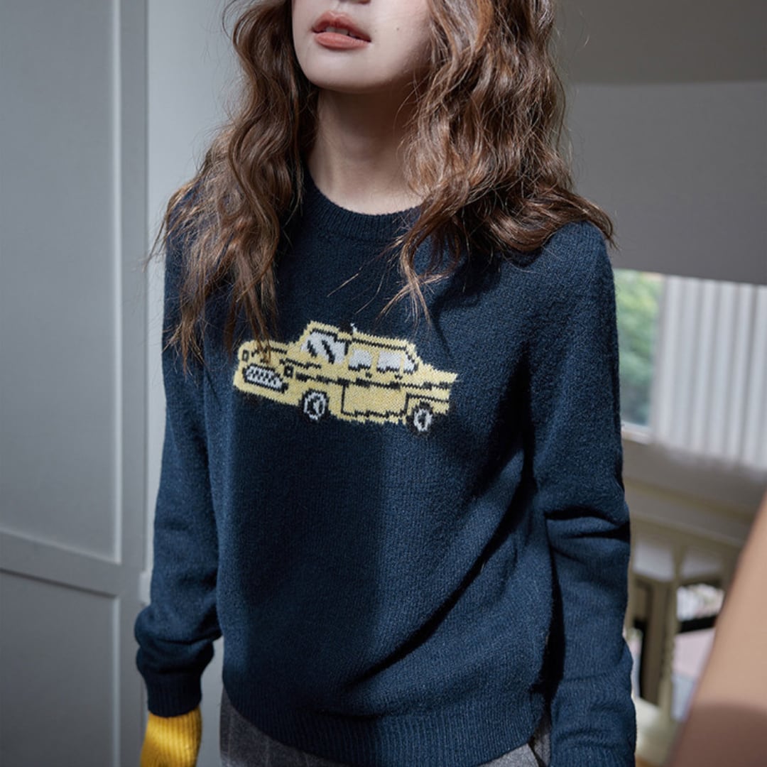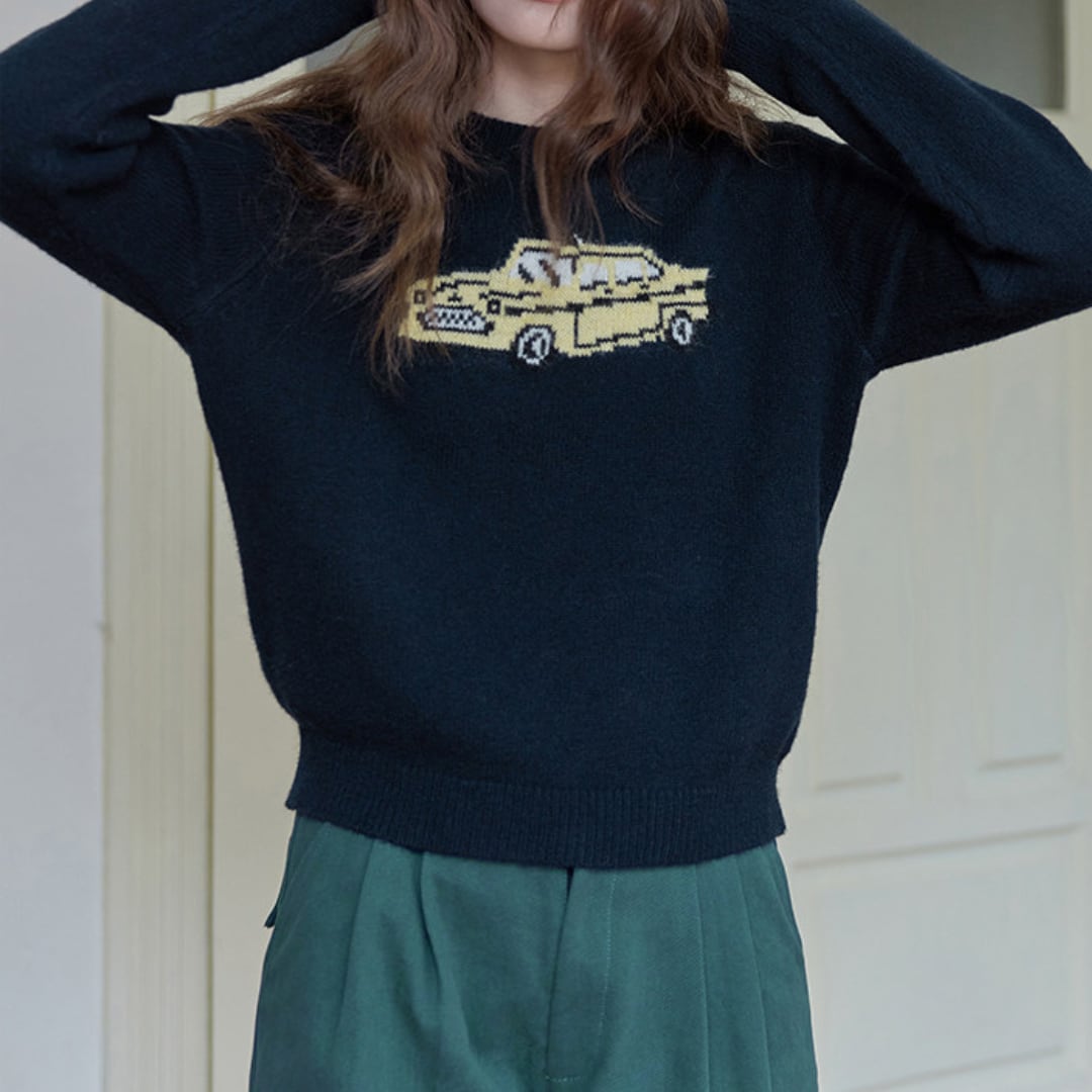 クラシックなカーデザインが胸元に施された、遊び心あふれるラウンドネックニット。