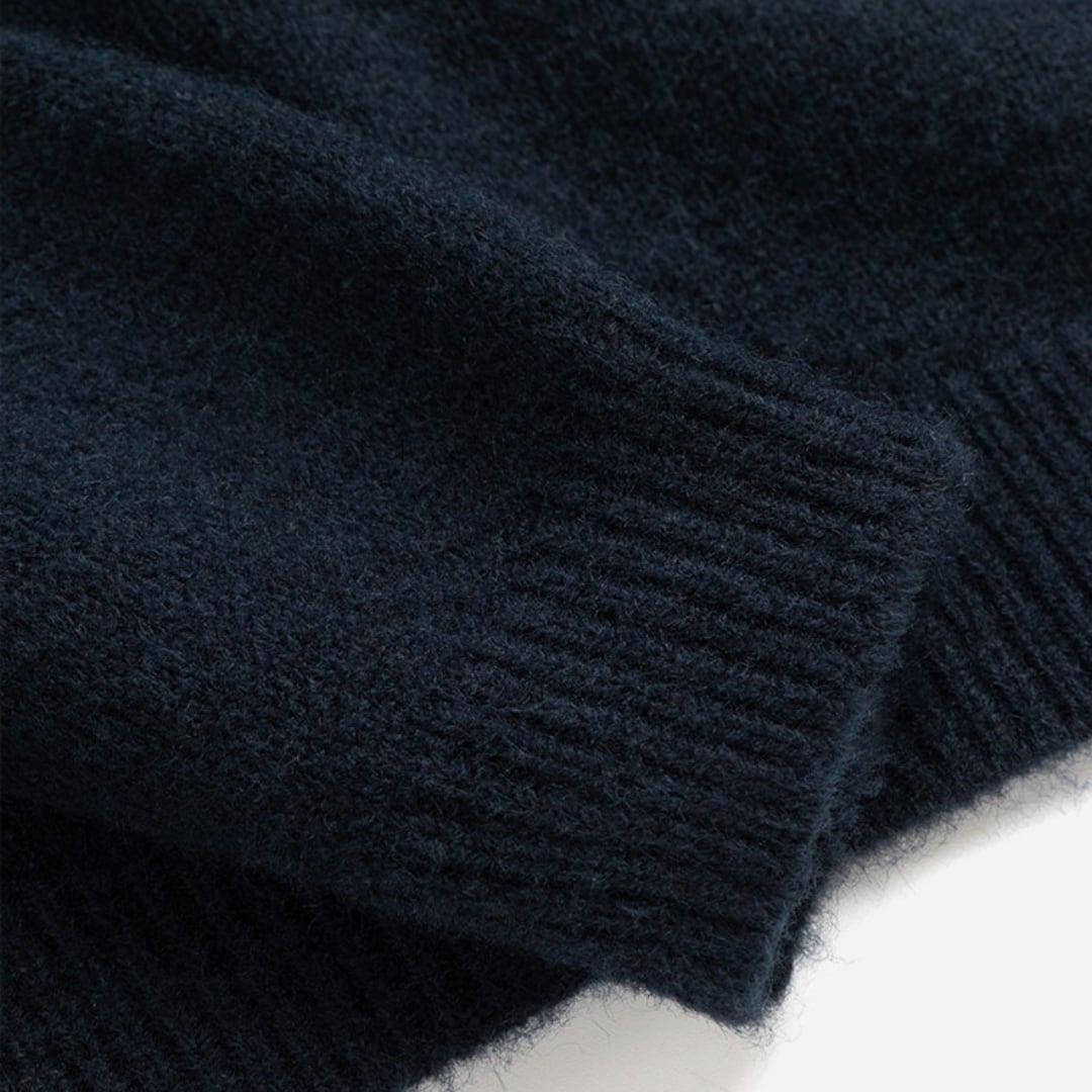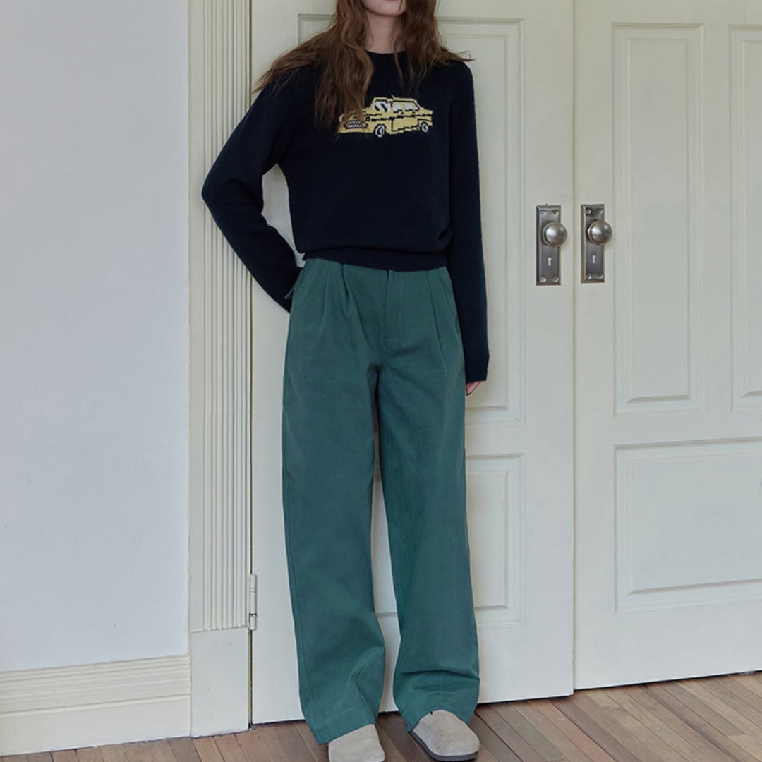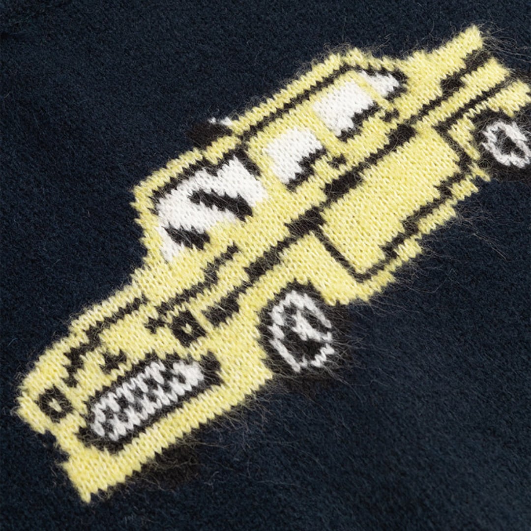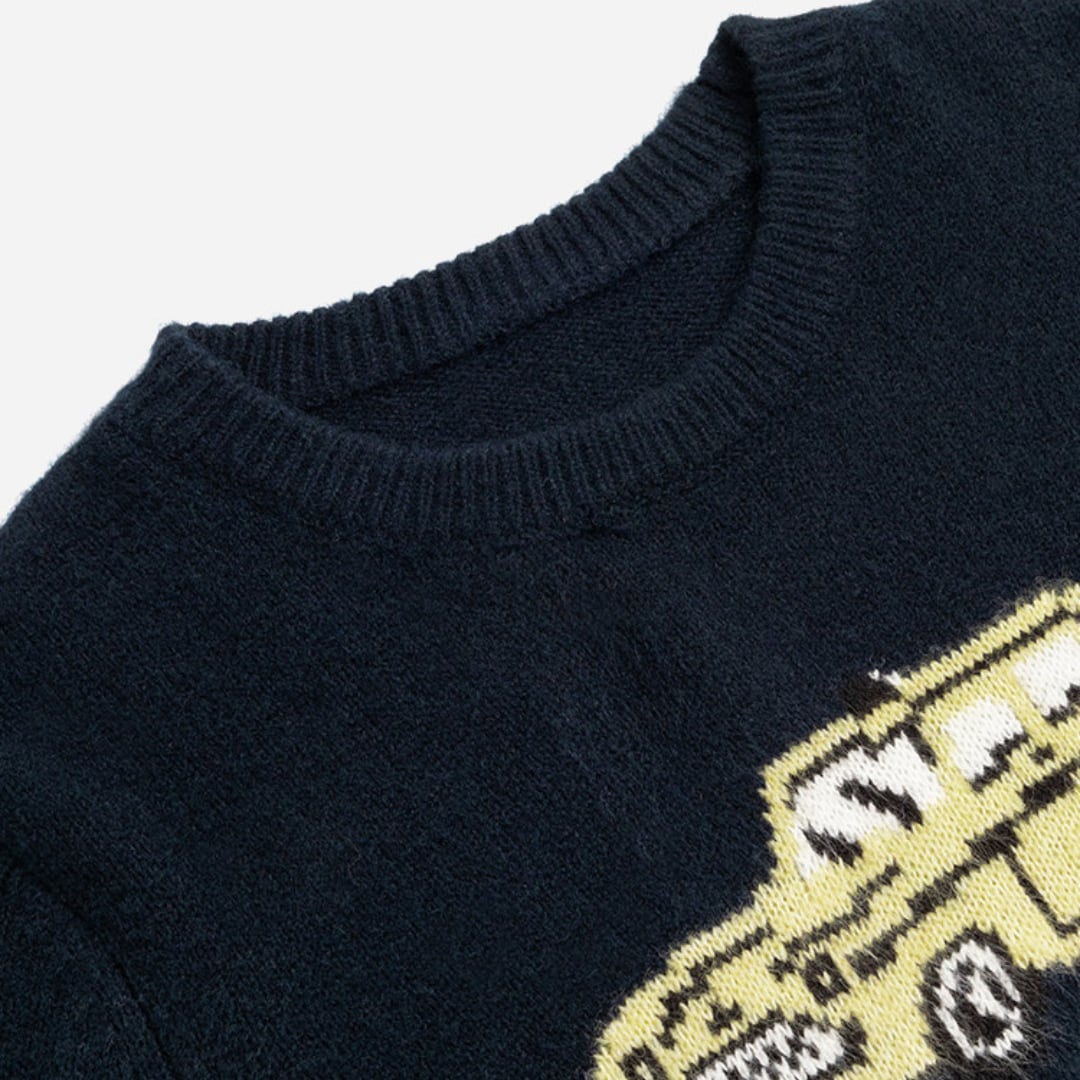 クラシックなカーデザインが胸元に施された、遊び心あふれるラウンドネックニット。