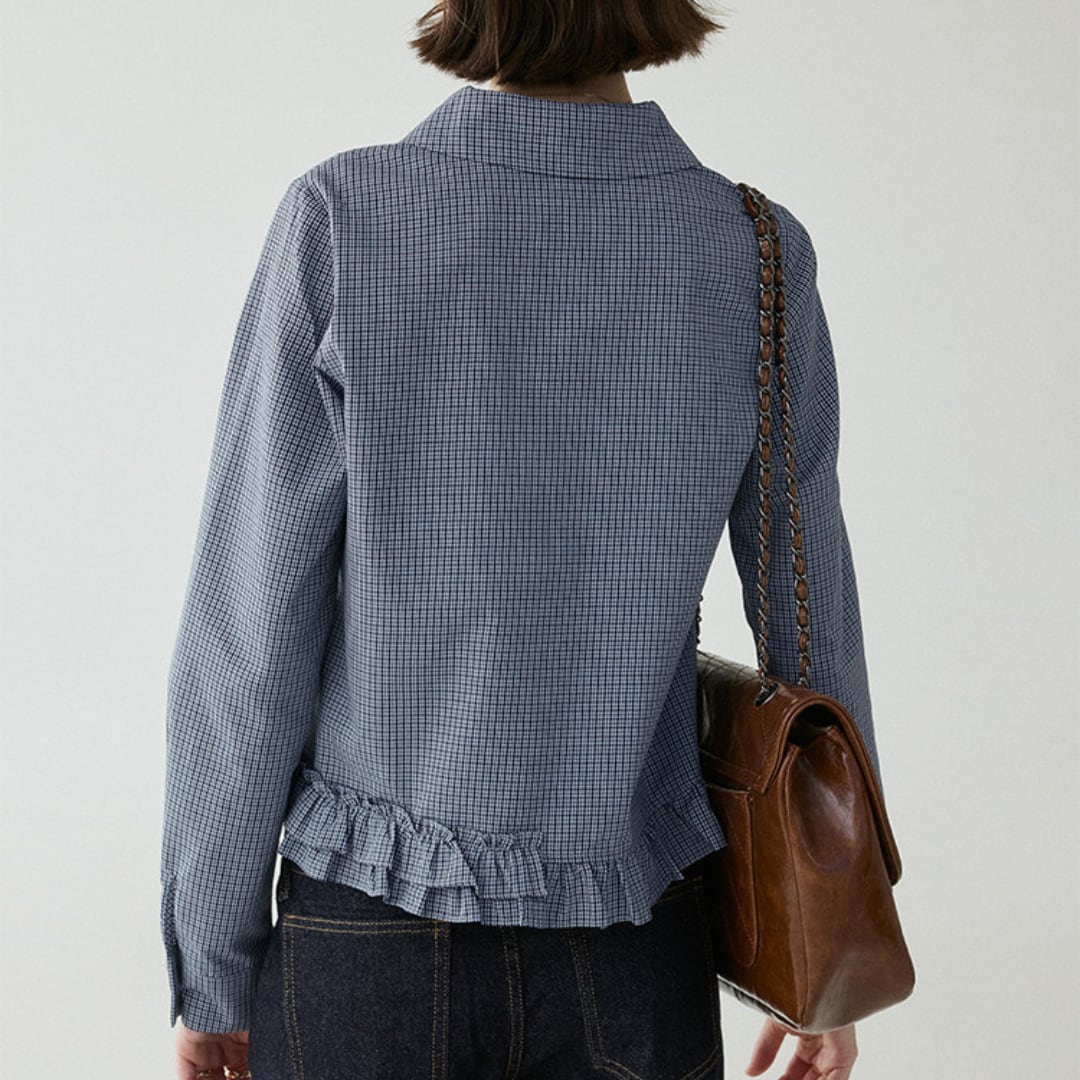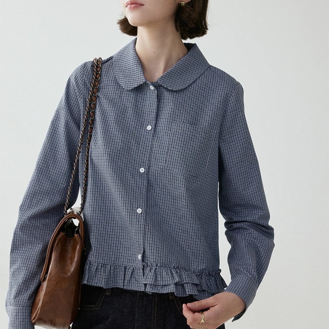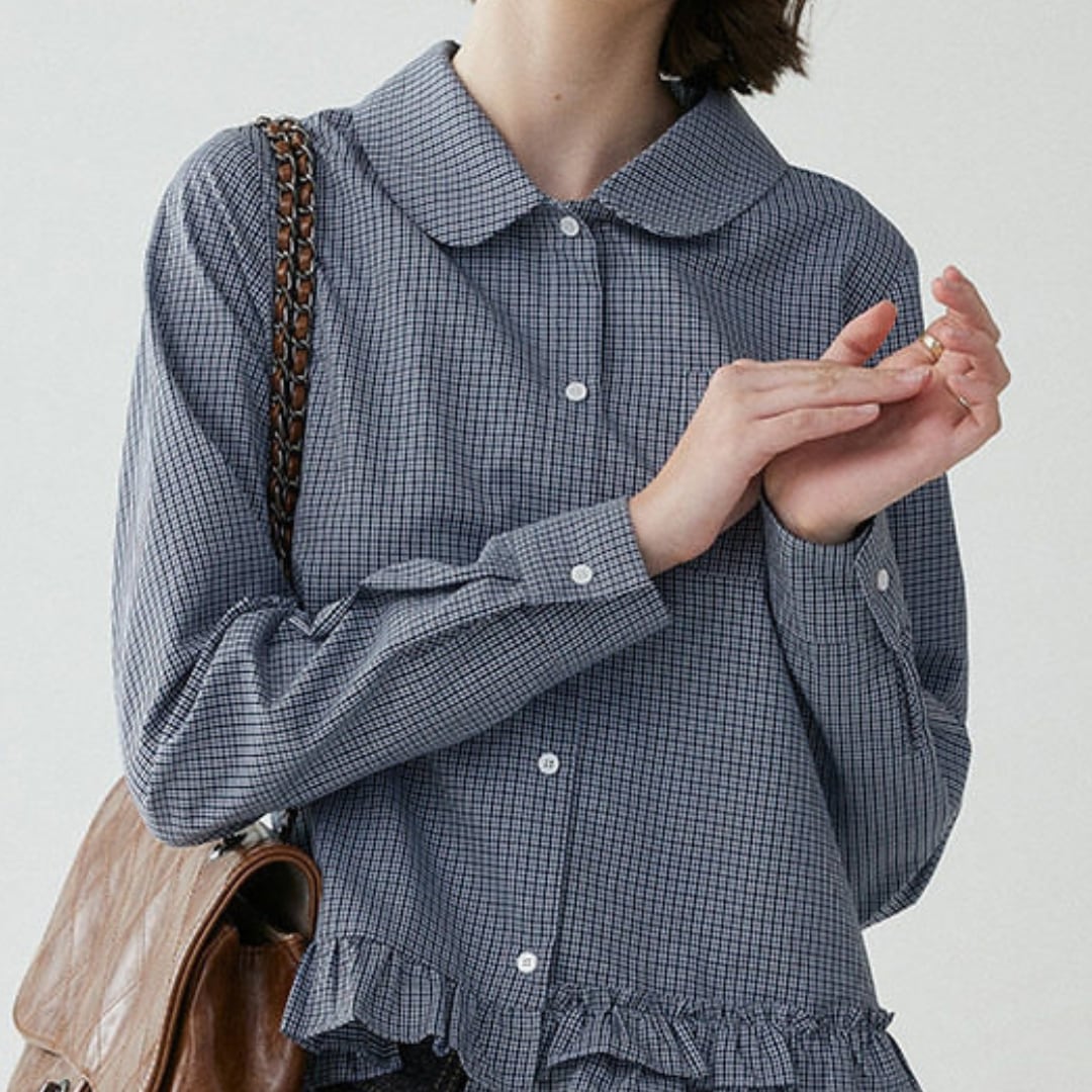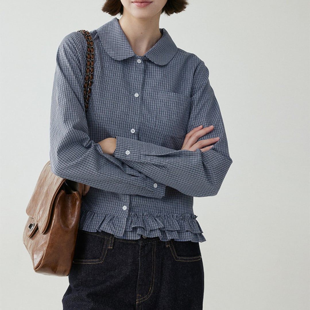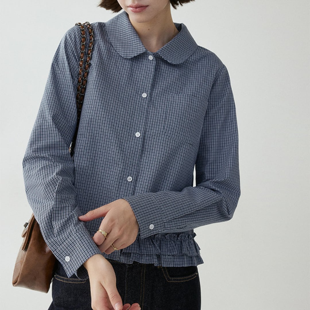 可愛らしい丸襟と裾のフリルがポイントのチェック柄シャツブラウス。