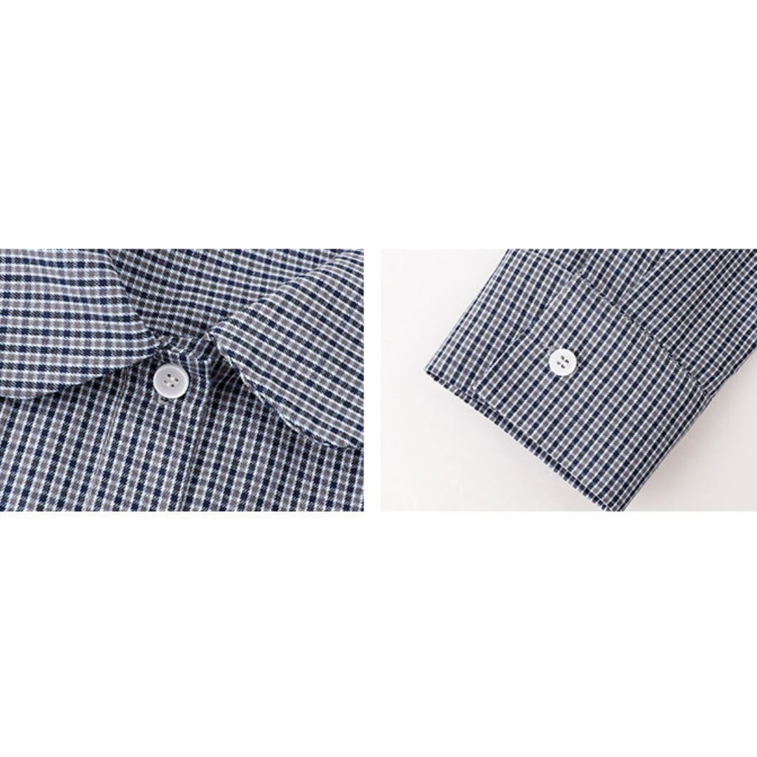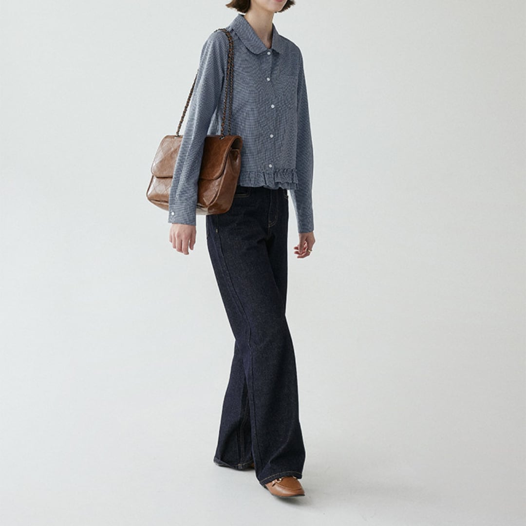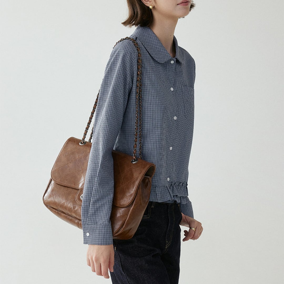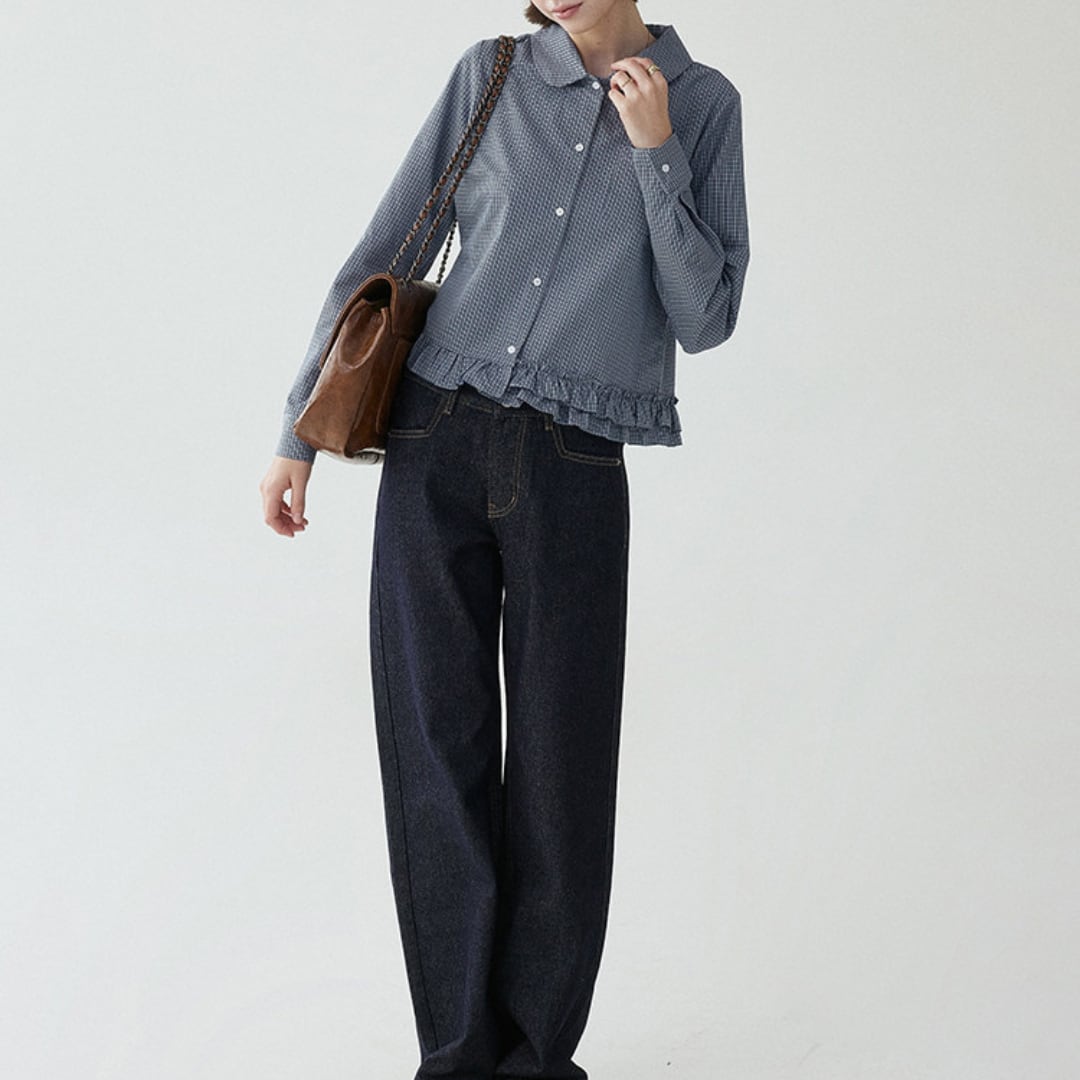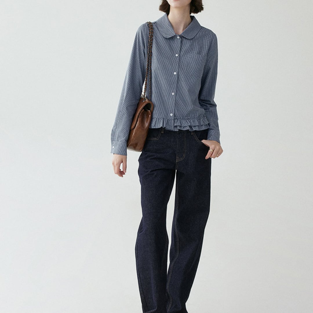 可愛らしい丸襟と裾のフリルがポイントのチェック柄シャツブラウス。
