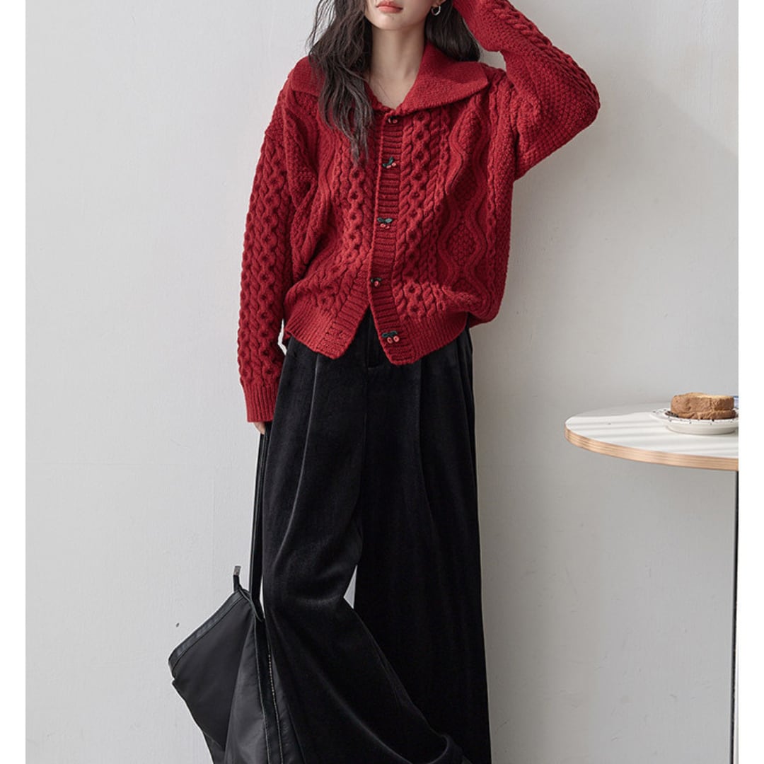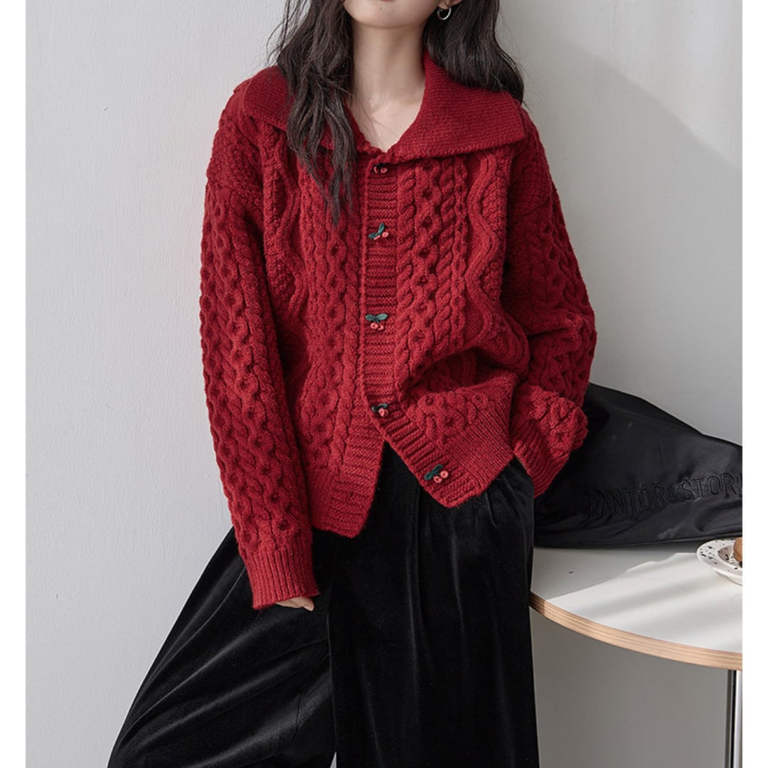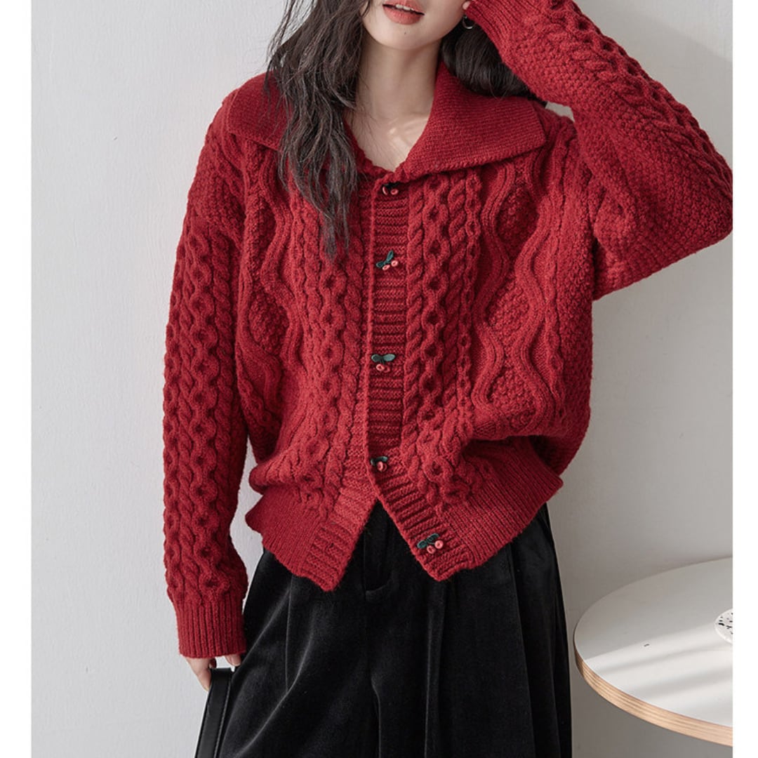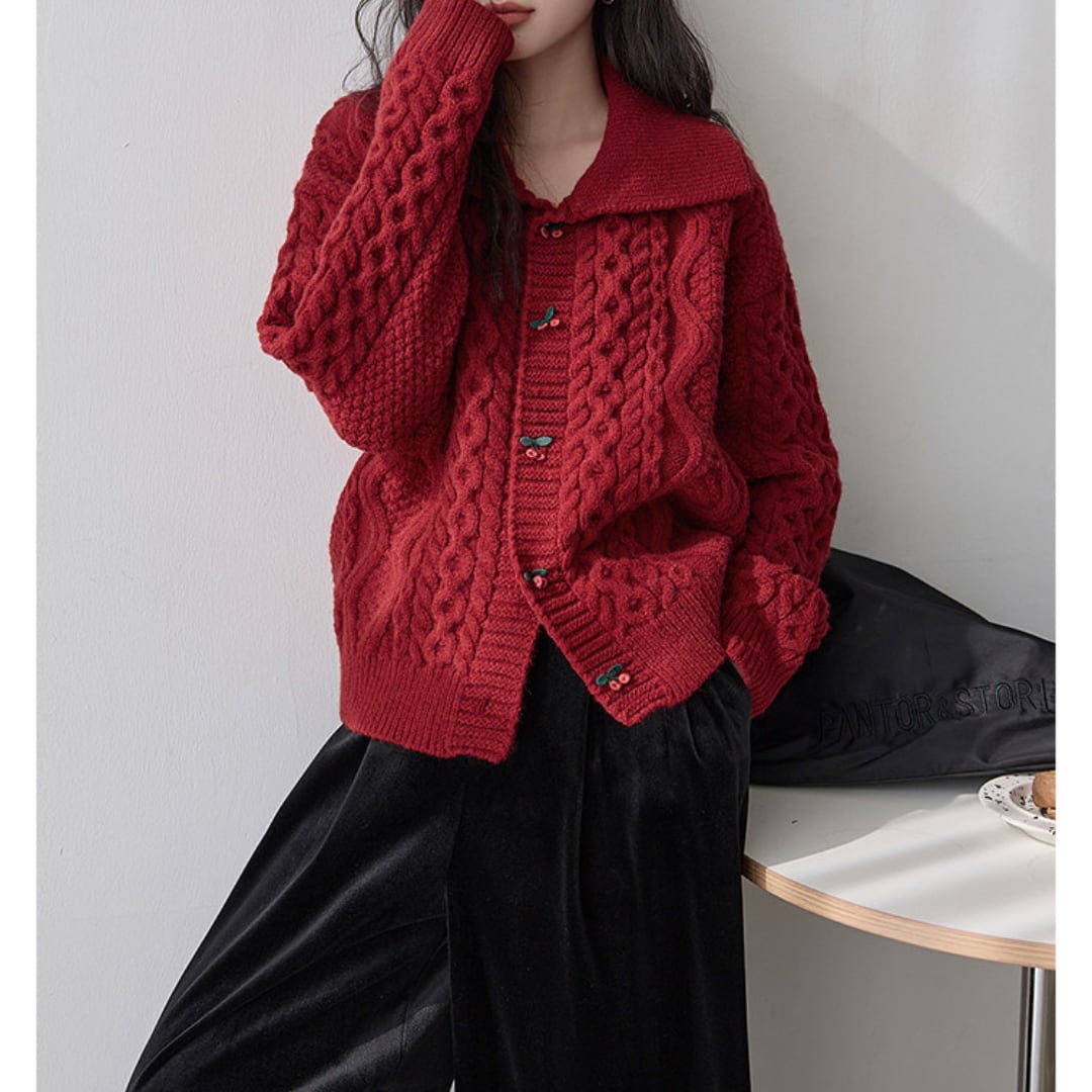 立体感のあるケーブル編みと大きめの襟が印象的な、クラシカルな雰囲気のニットカーディガン。
