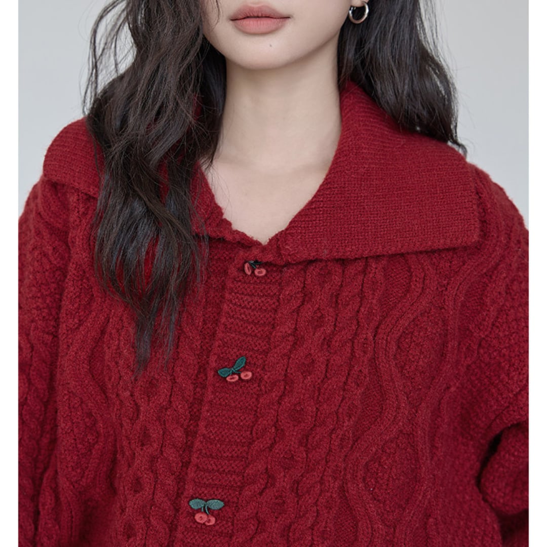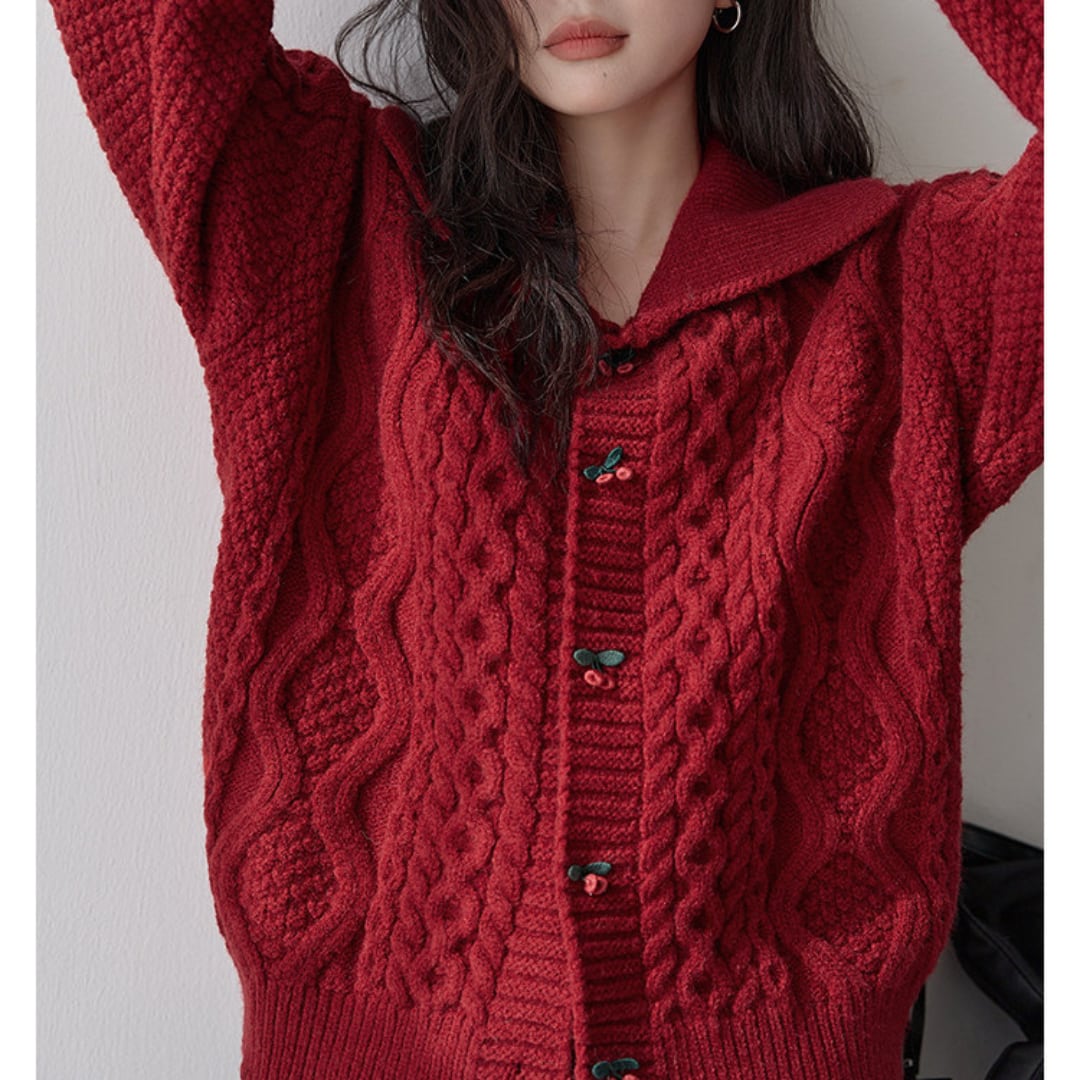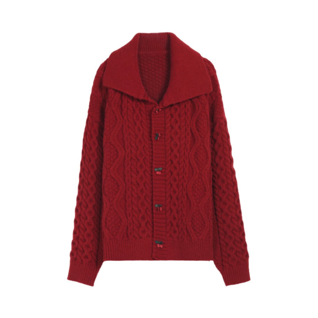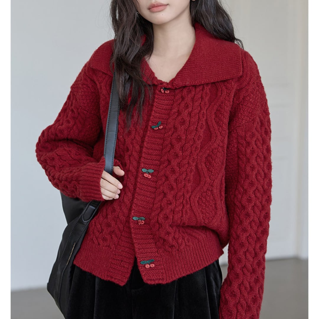 立体感のあるケーブル編みと大きめの襟が印象的な、クラシカルな雰囲気のニットカーディガン。