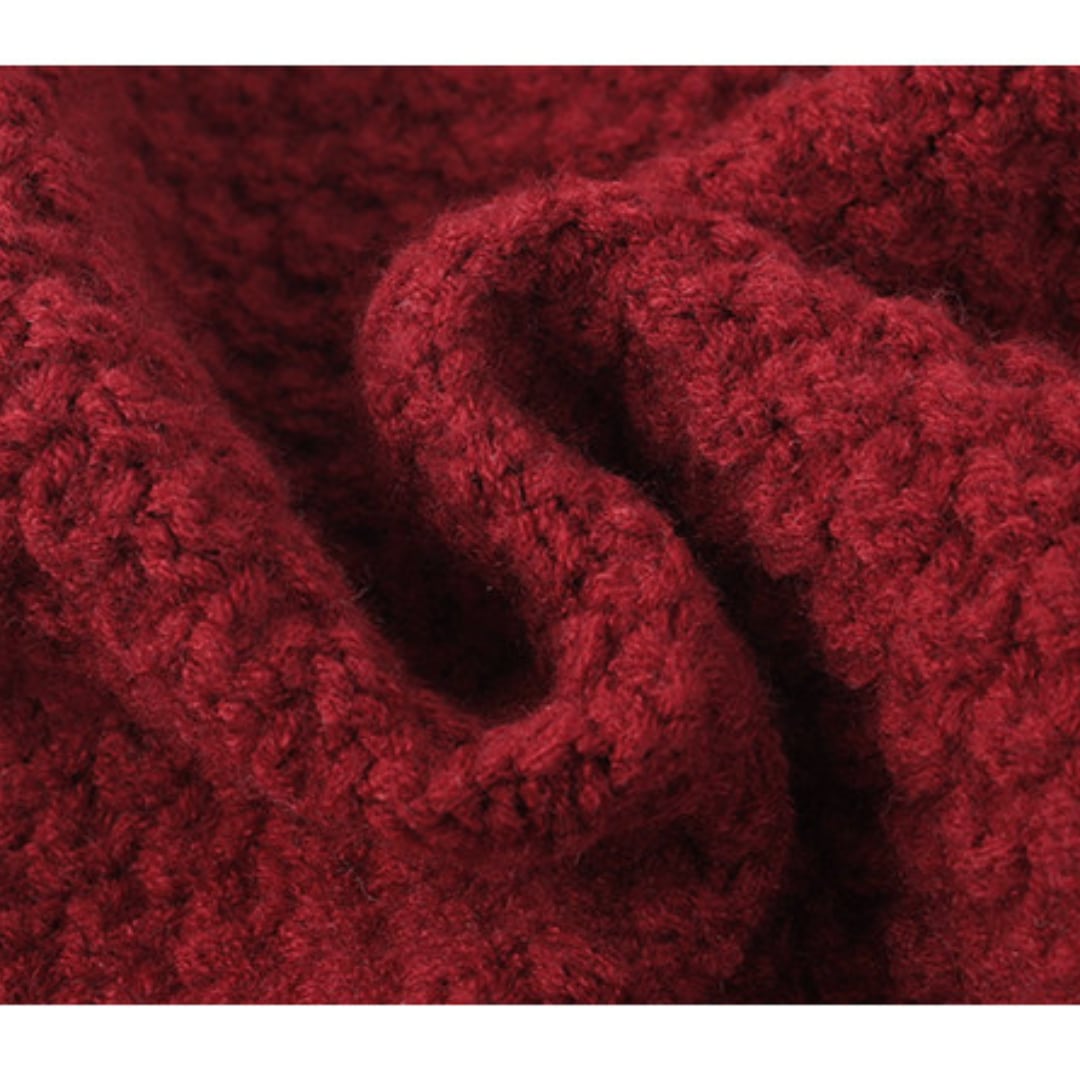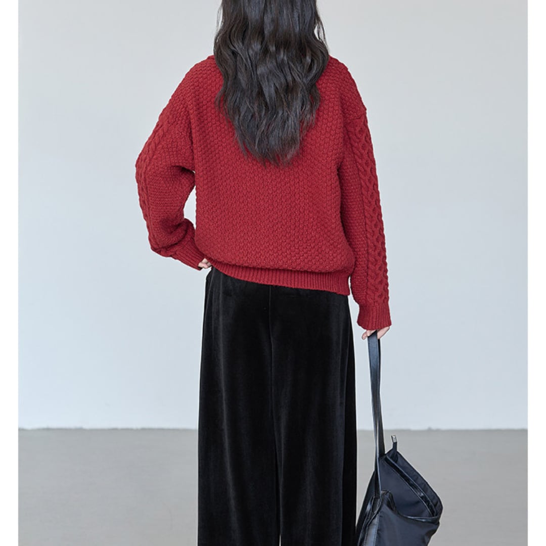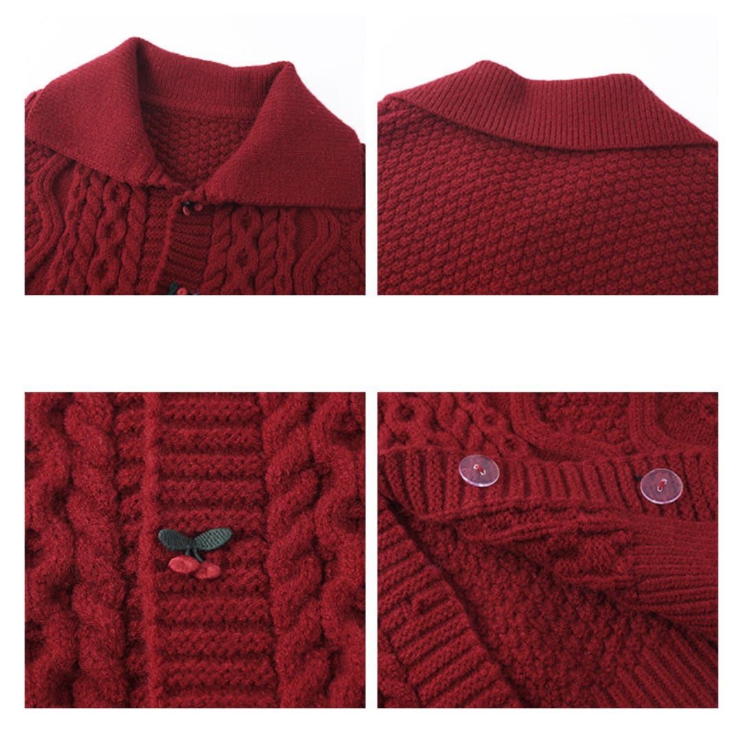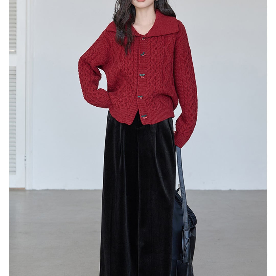 立体感のあるケーブル編みと大きめの襟が印象的な、クラシカルな雰囲気のニットカーディガン。