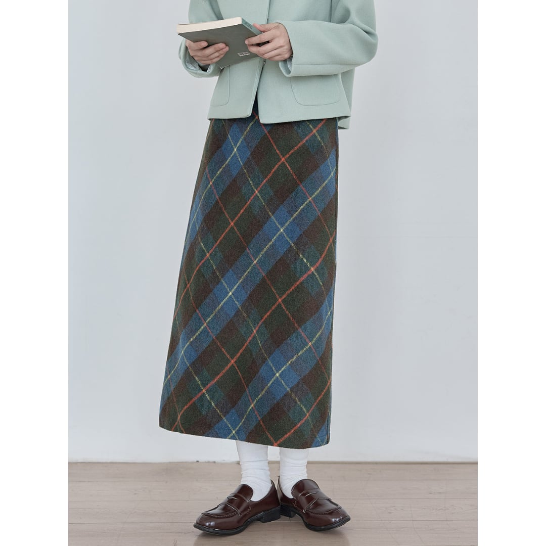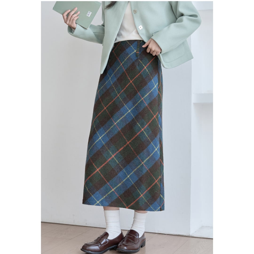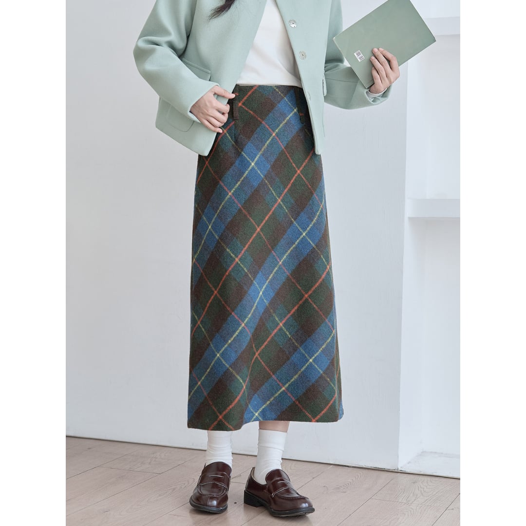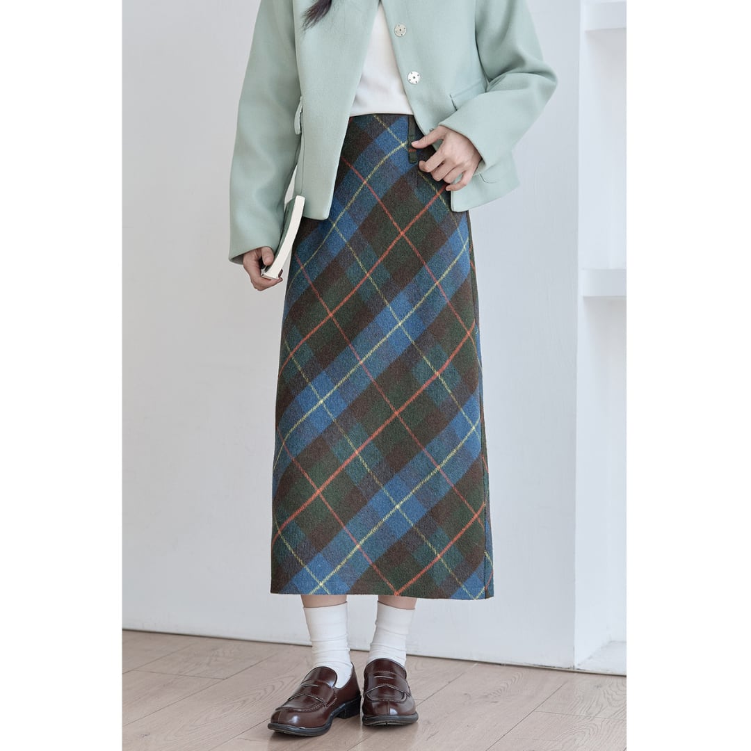 落ち着いたトーンのチェック柄が上品な印象を与える、ストレートシルエットのミモレ丈スカート。