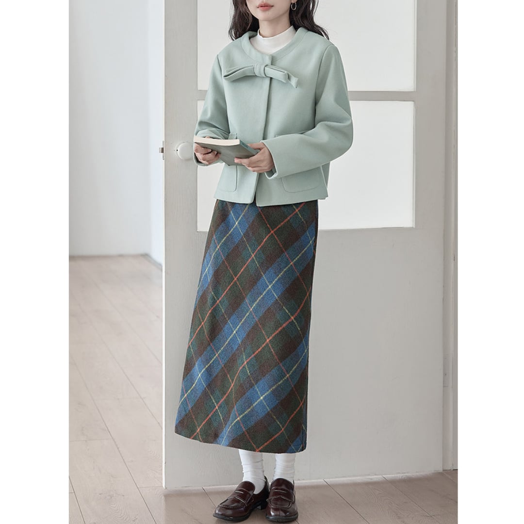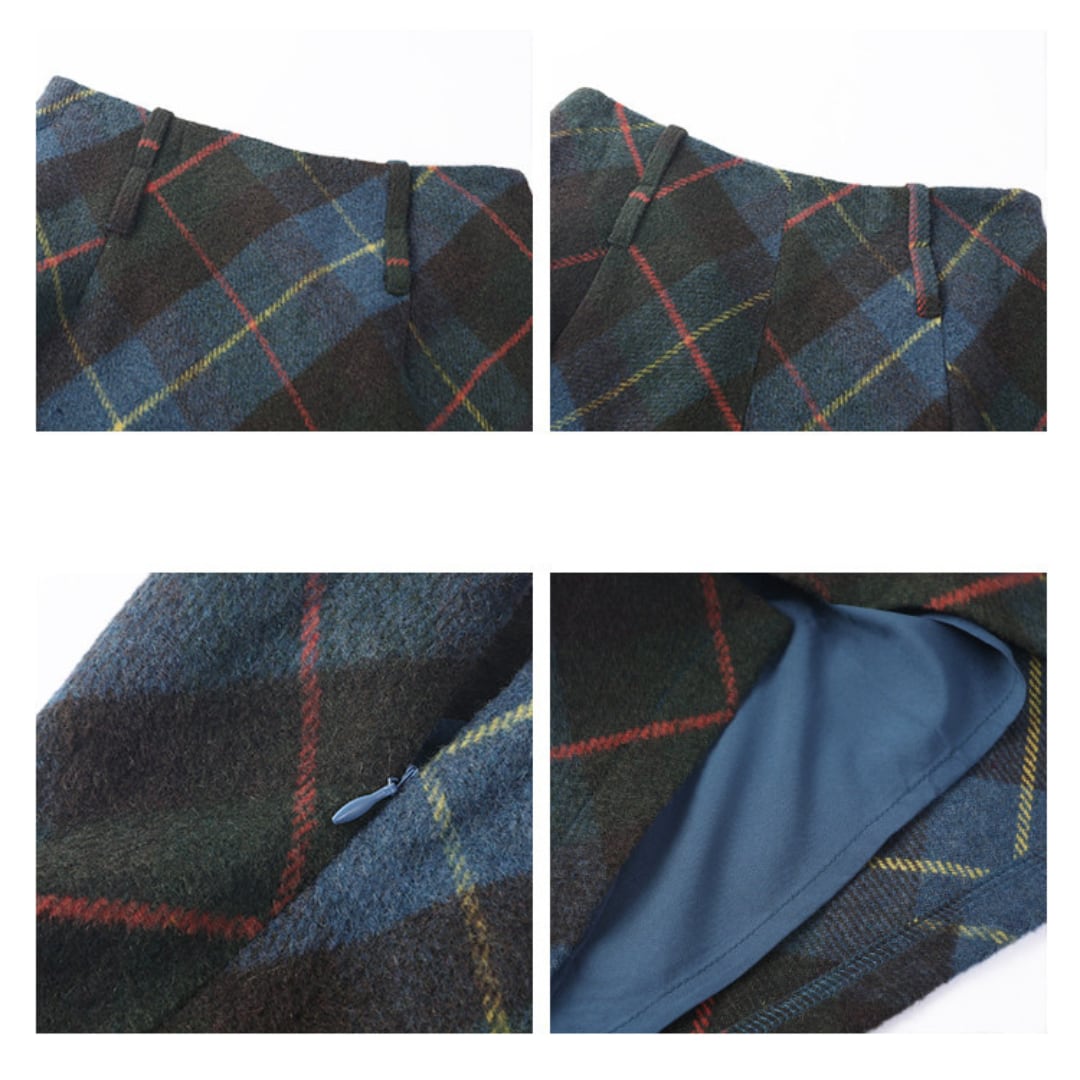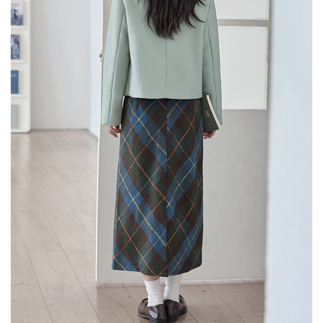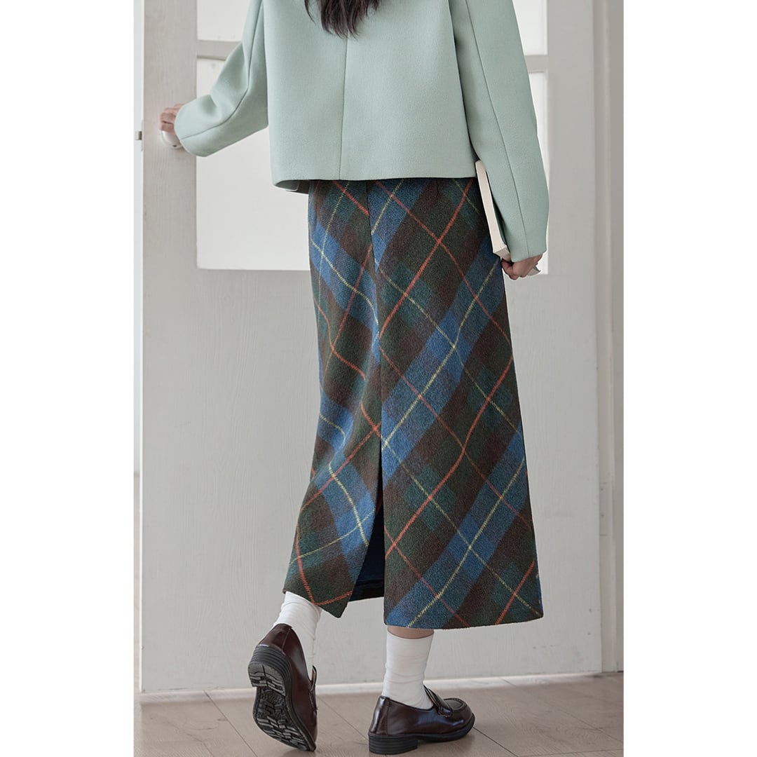 落ち着いたトーンのチェック柄が上品な印象を与える、ストレートシルエットのミモレ丈スカート。