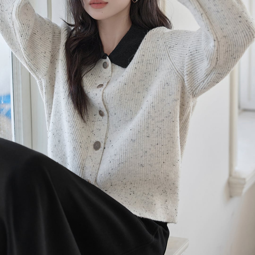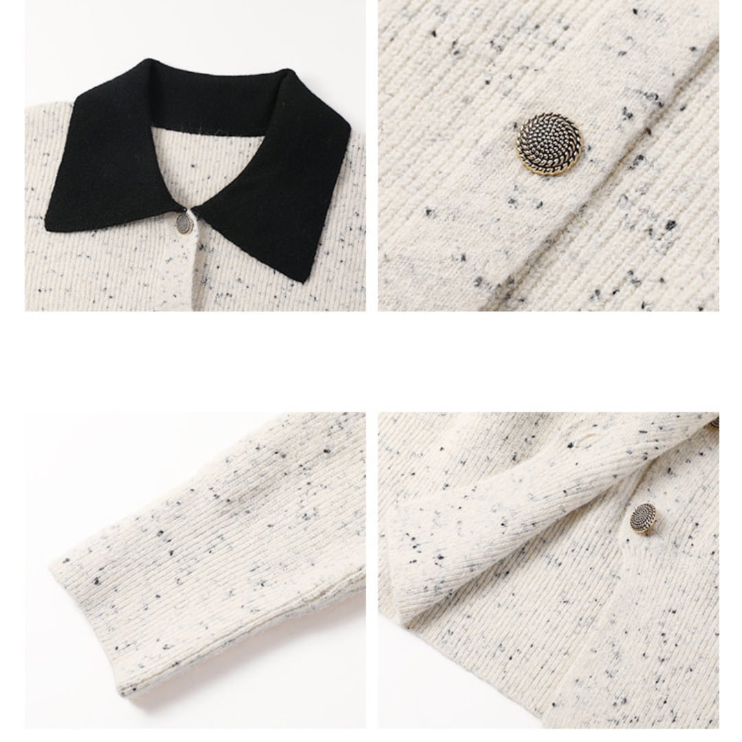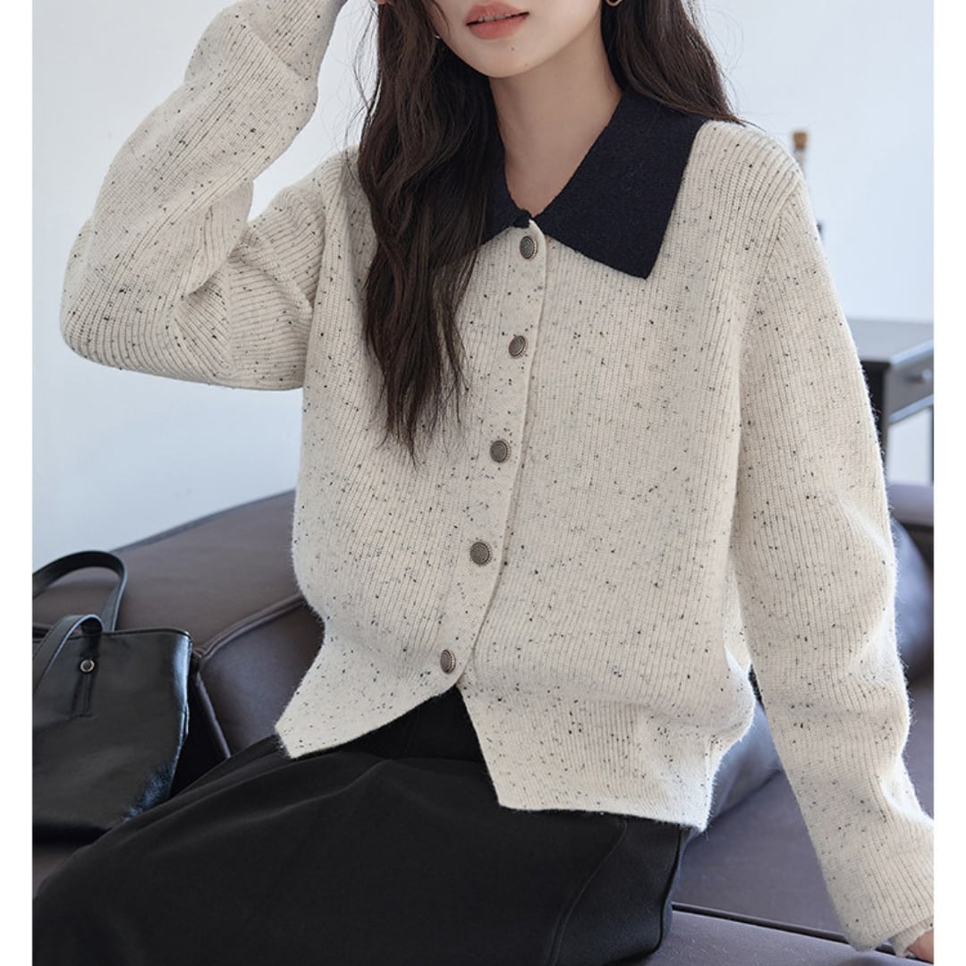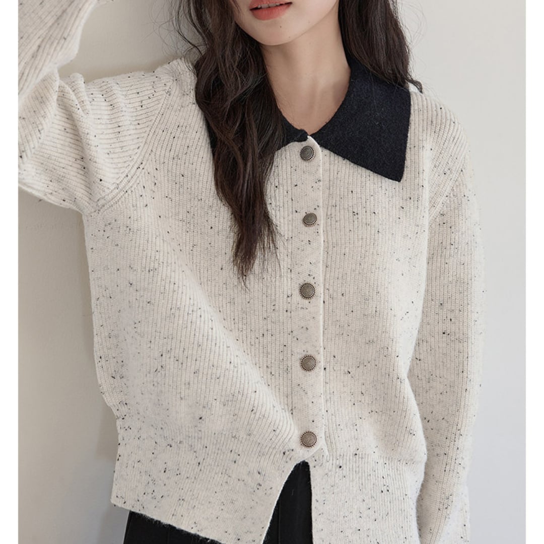 異素材風の配色襟がアクセントになった、シンプルながらも洗練された印象のニットカーディガン。