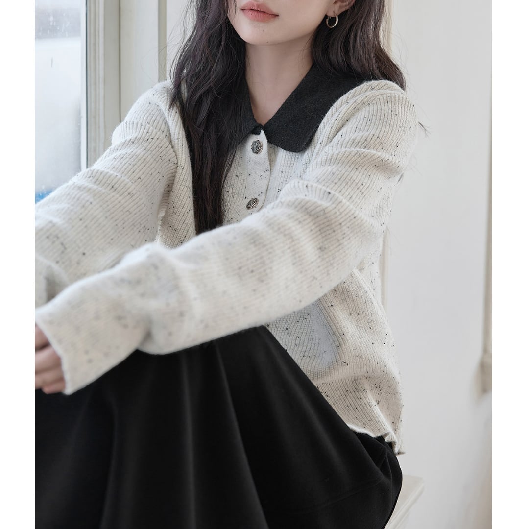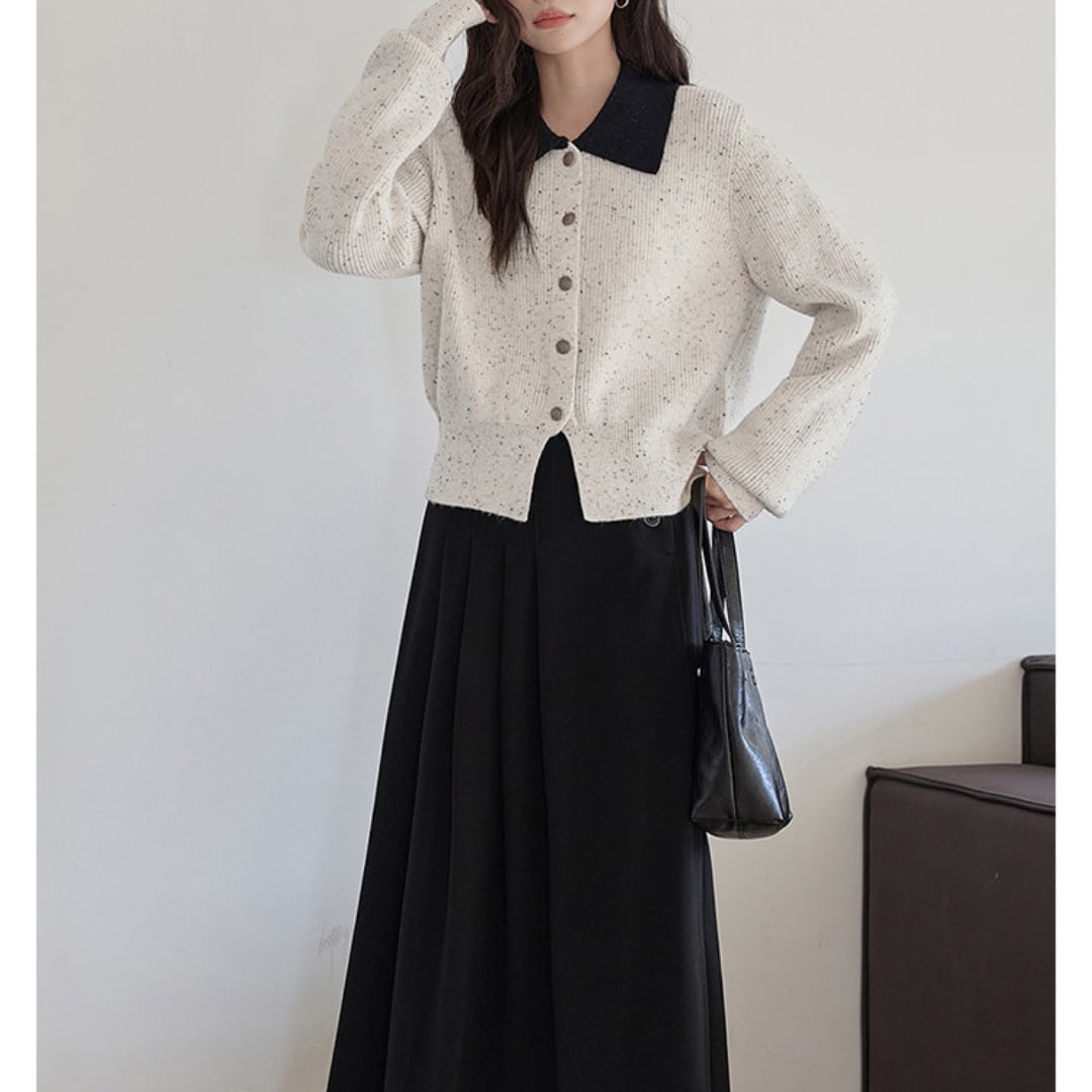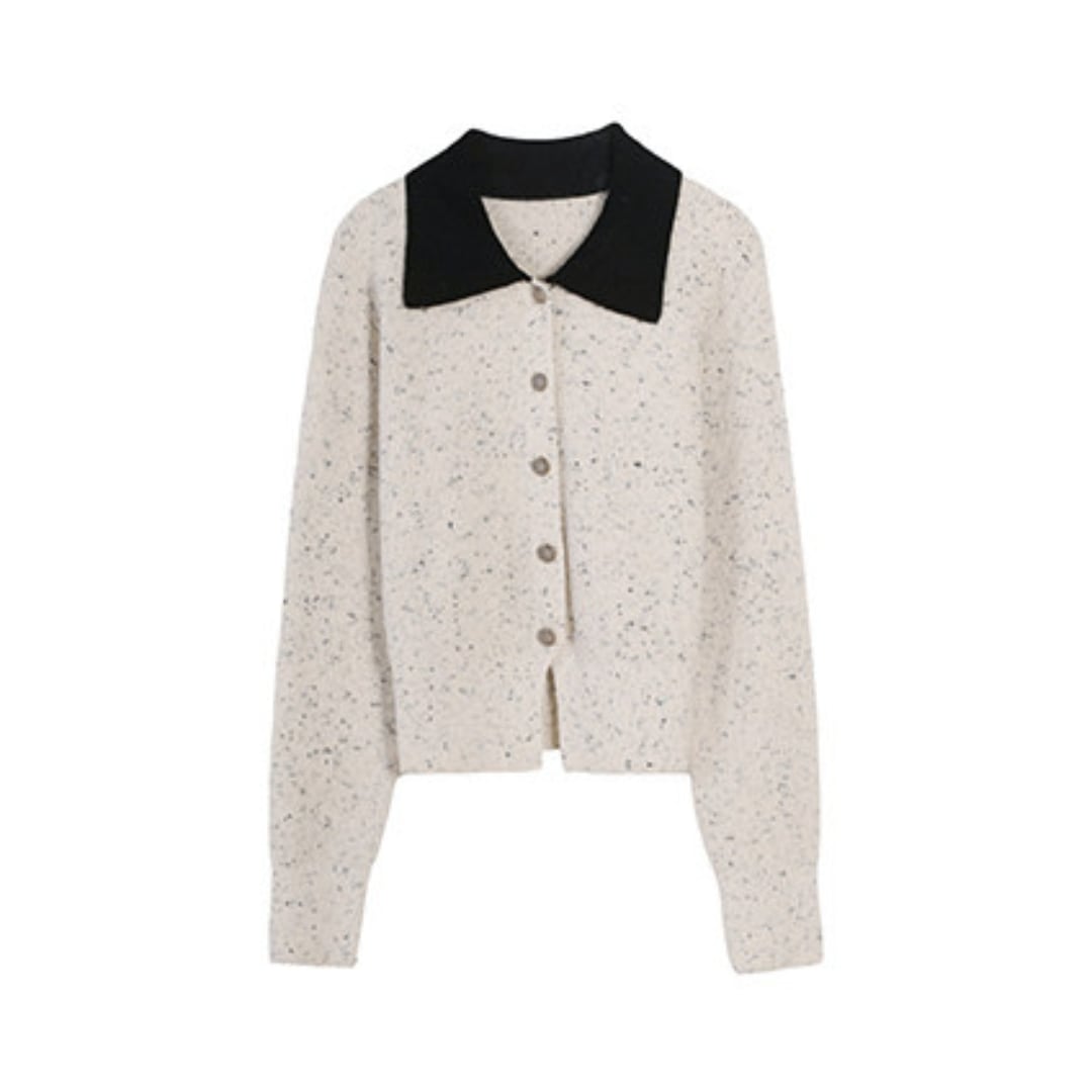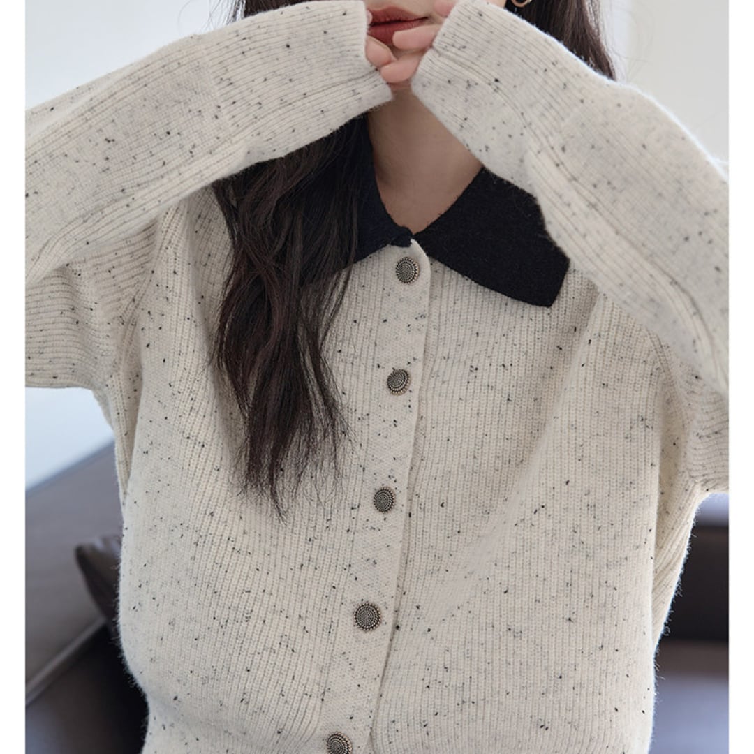 異素材風の配色襟がアクセントになった、シンプルながらも洗練された印象のニットカーディガン。