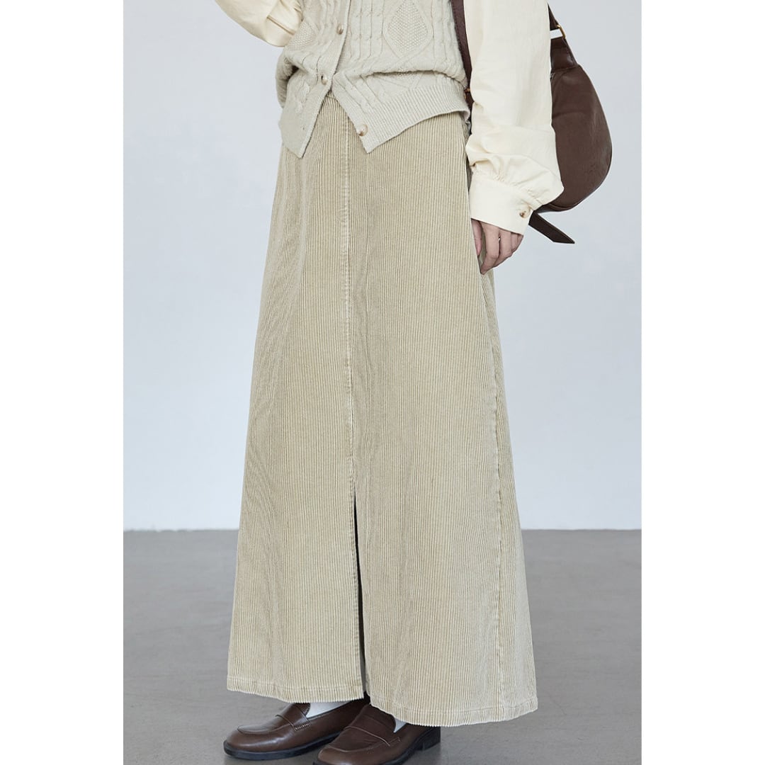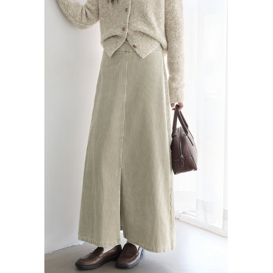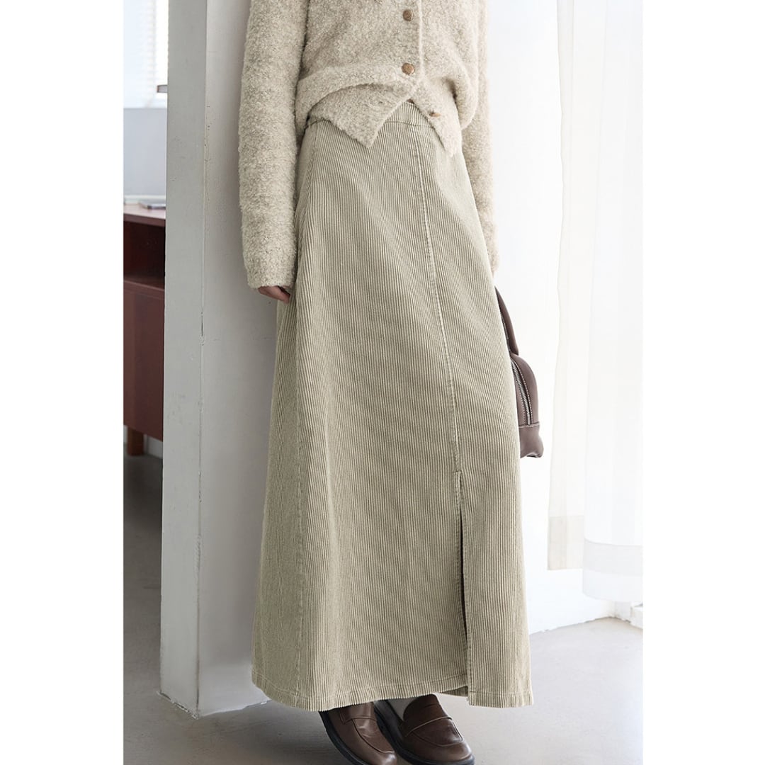 フロントに施されたスリットとコーデュロイ素材が、上品さと抜け感を演出するAラインコーデュロイスカート。