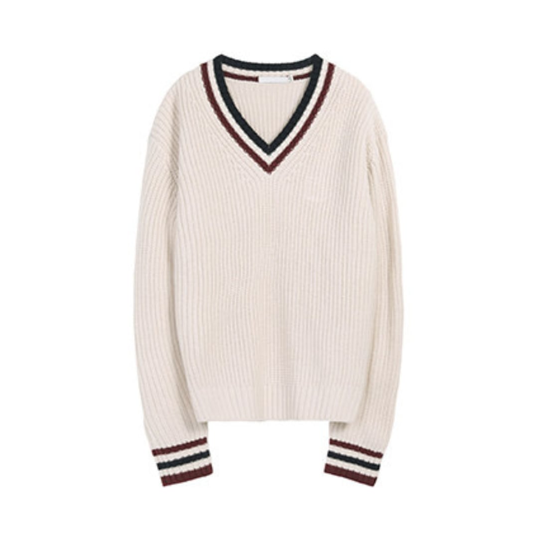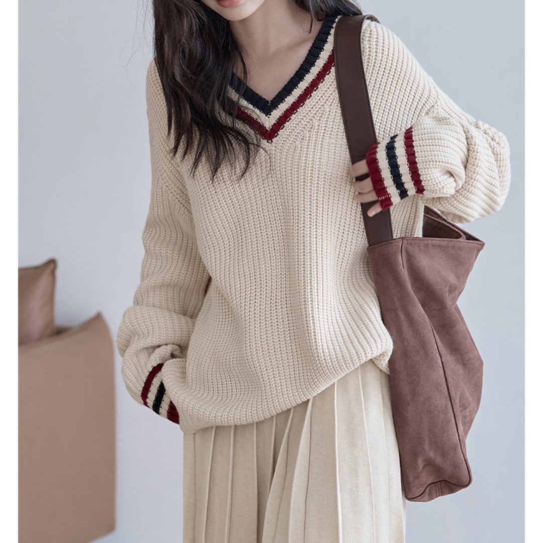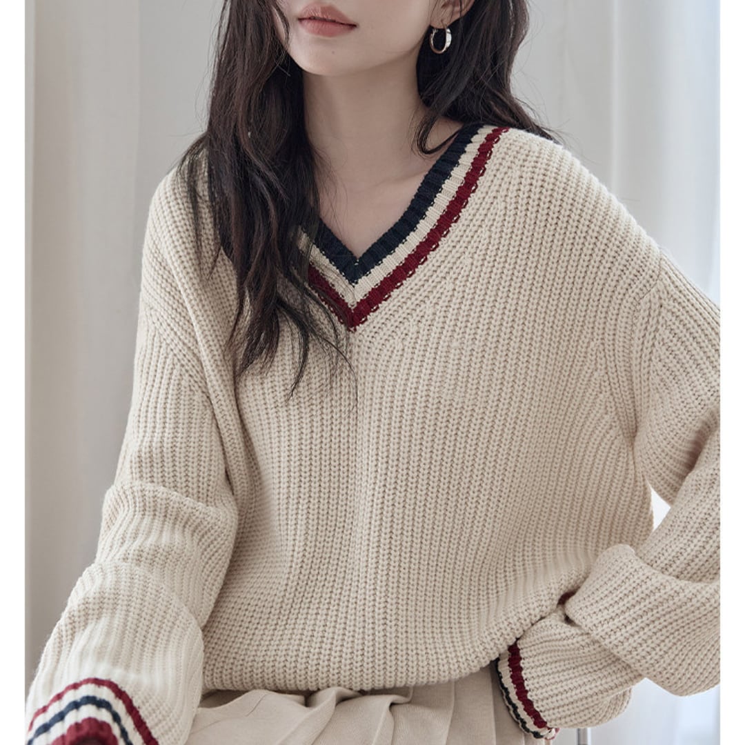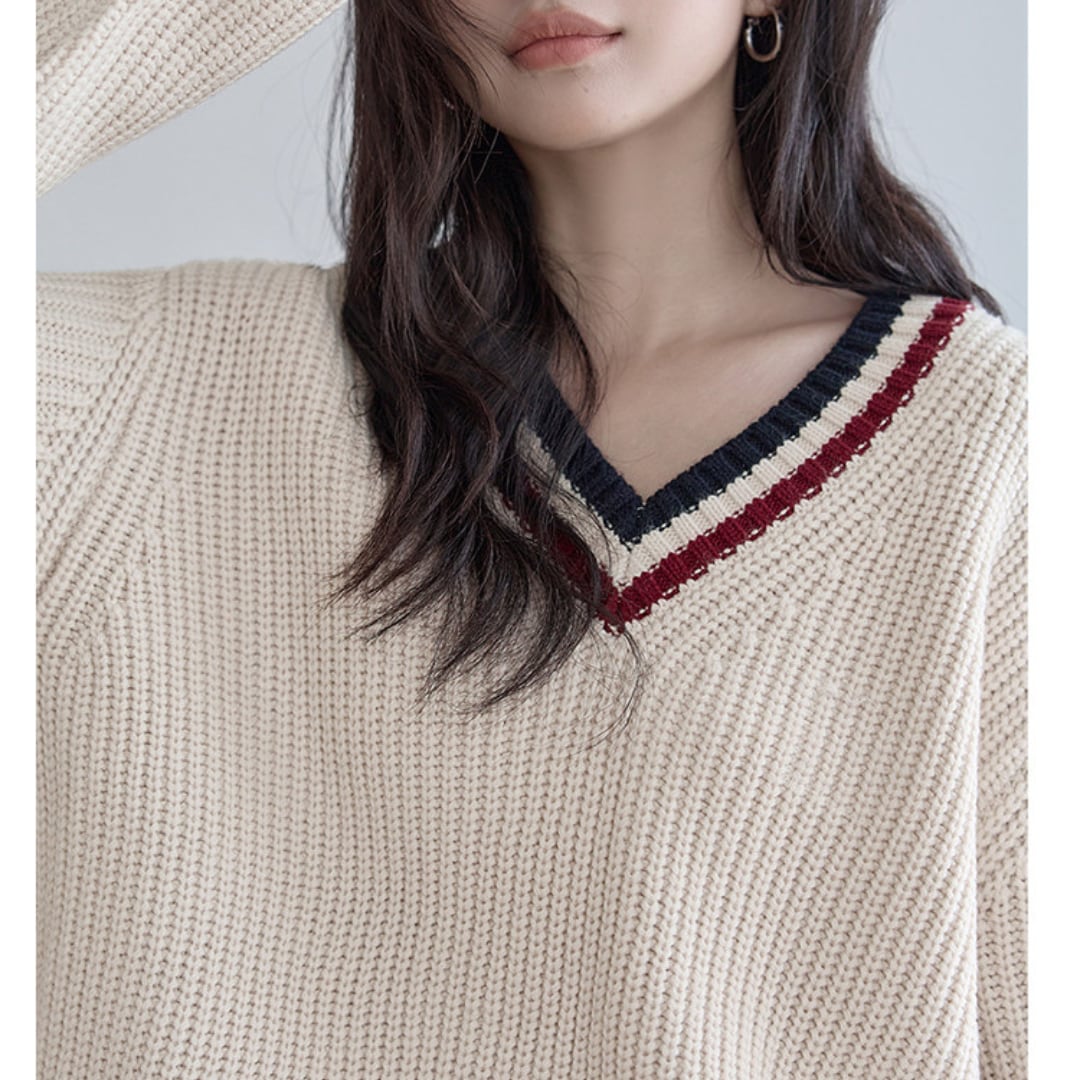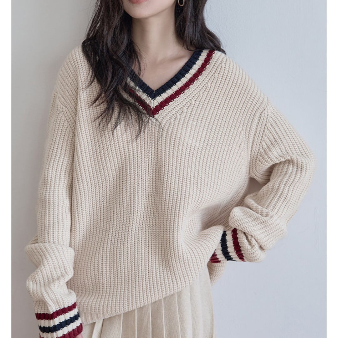 襟元と袖に施された配色ラインがアクセントのVネックニットは、リラックス感のあるシルエットでこなれた印象に◎