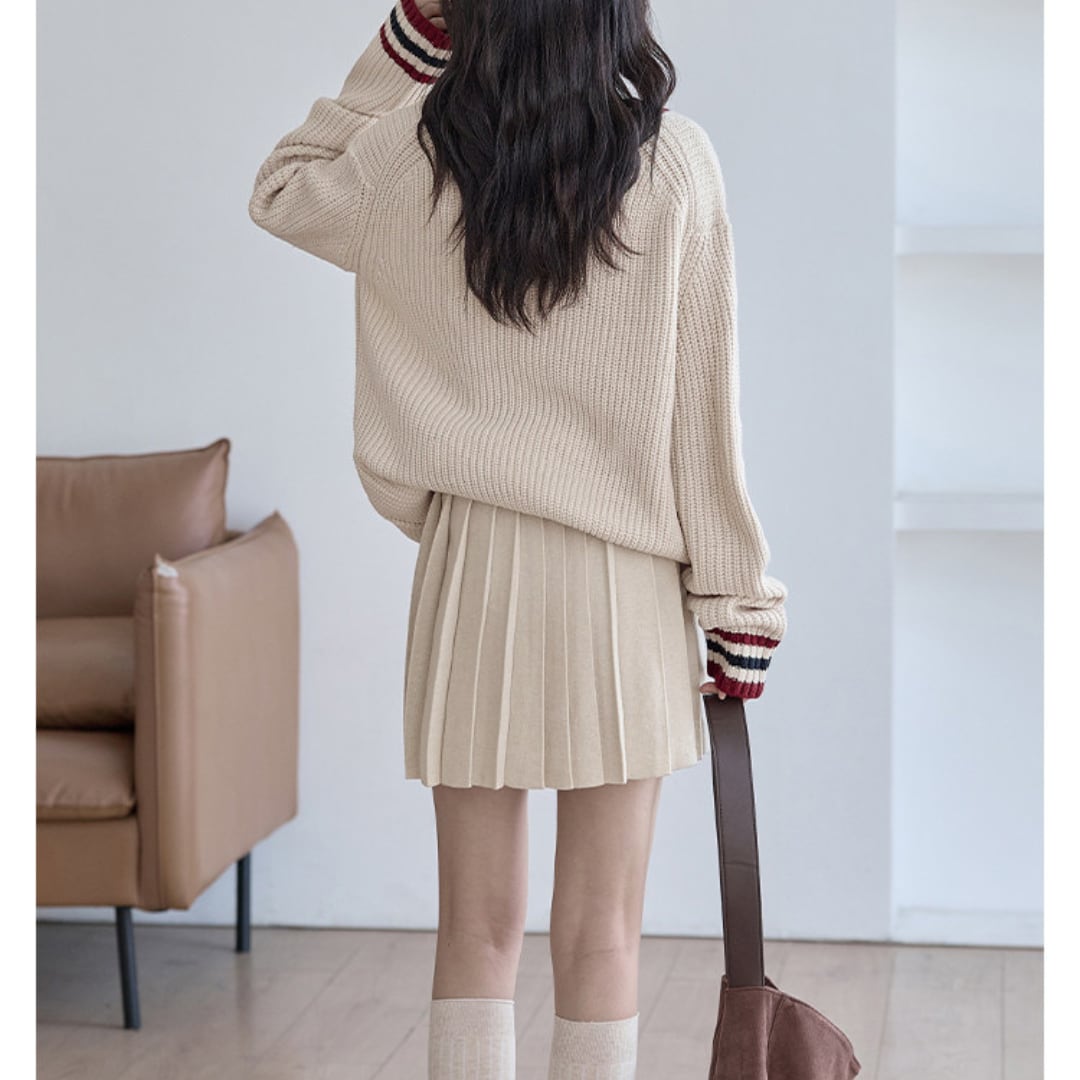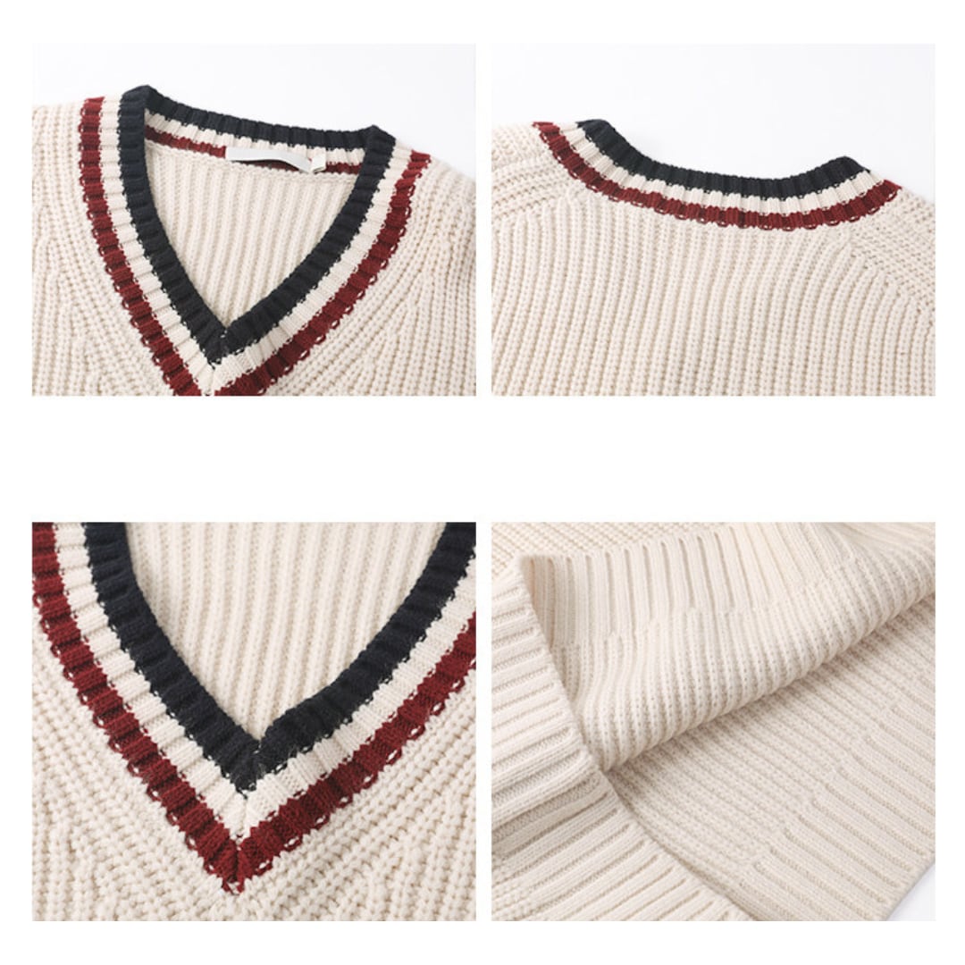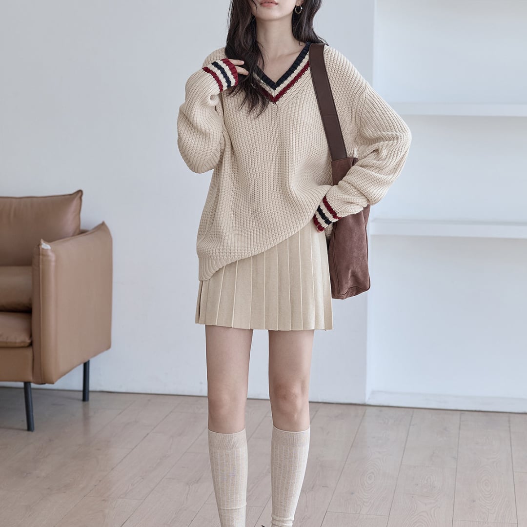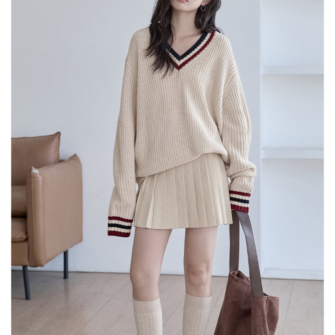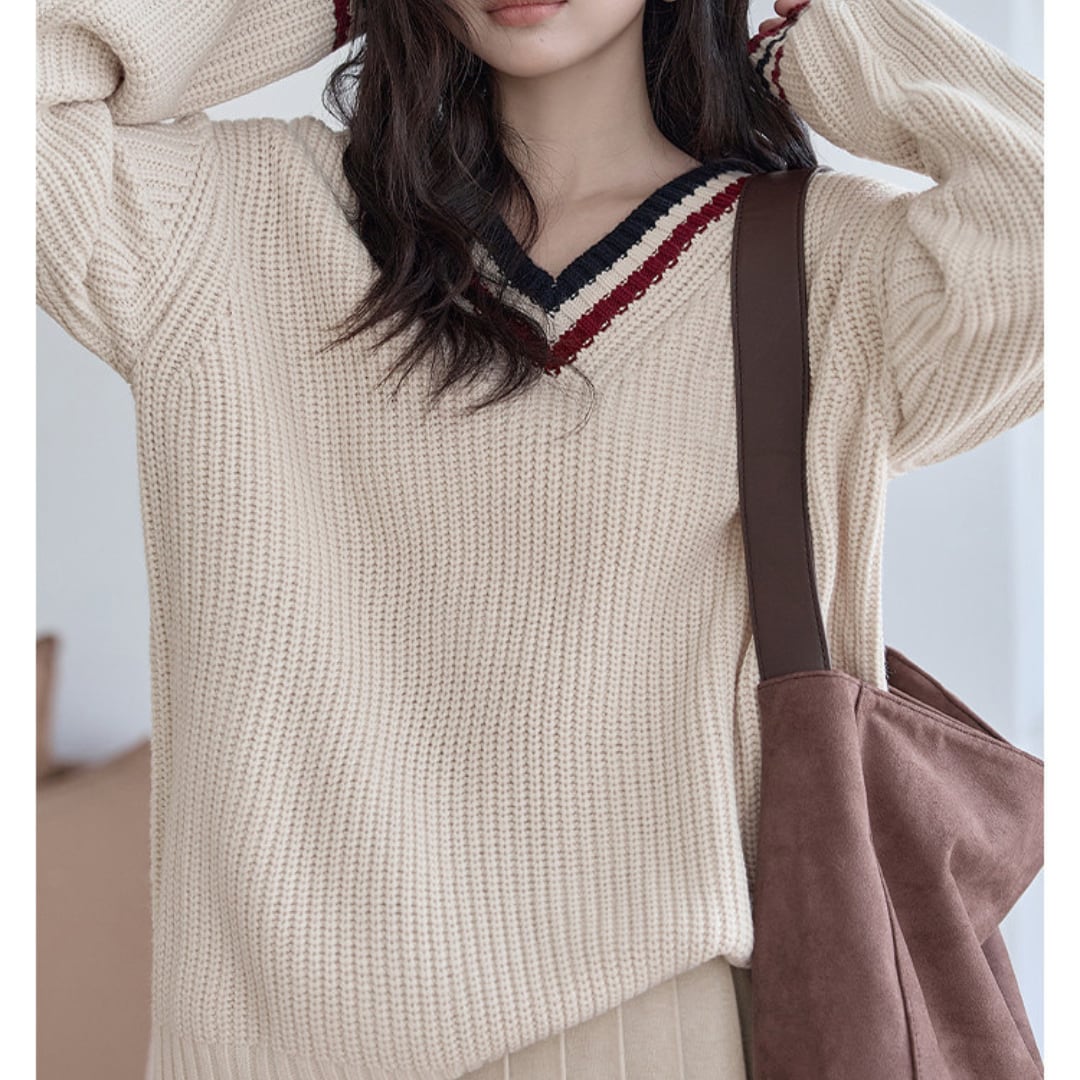 襟元と袖に施された配色ラインがアクセントのVネックニットは、リラックス感のあるシルエットでこなれた印象に◎