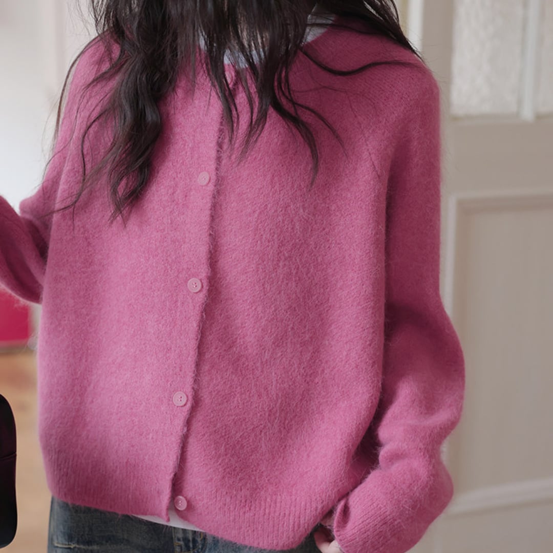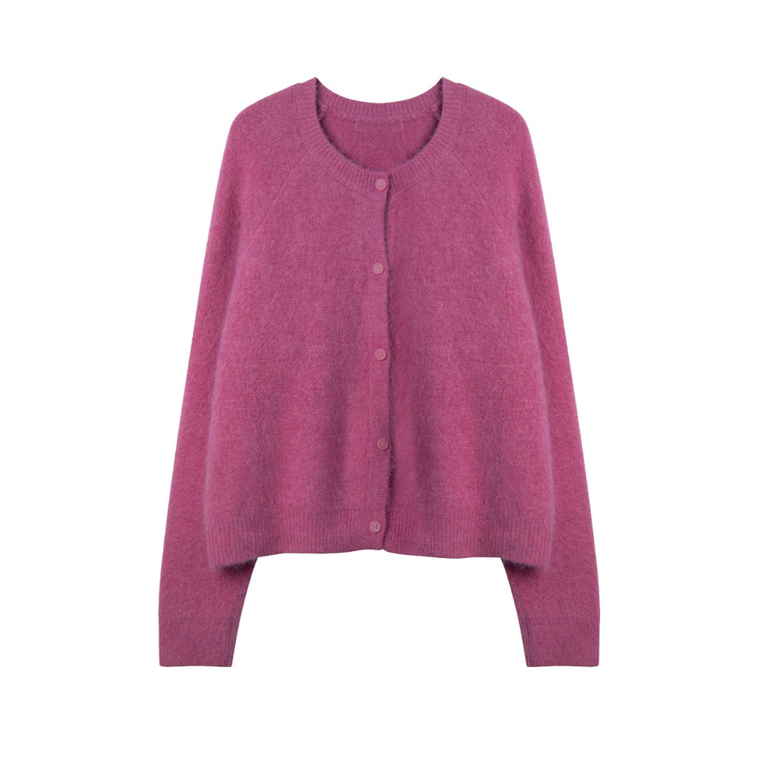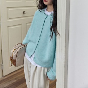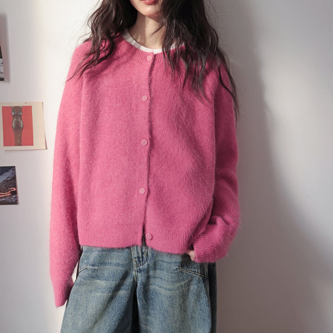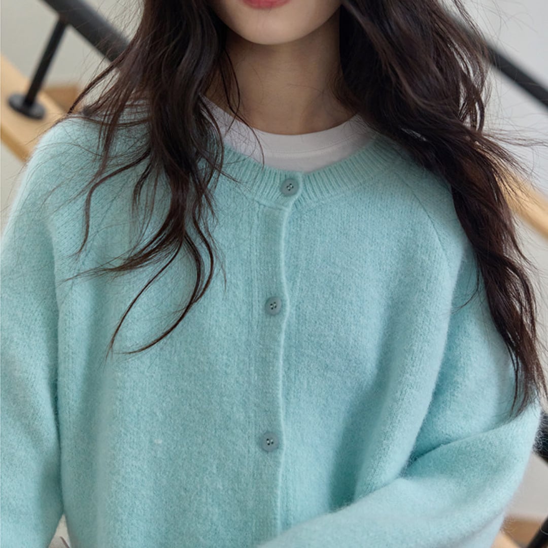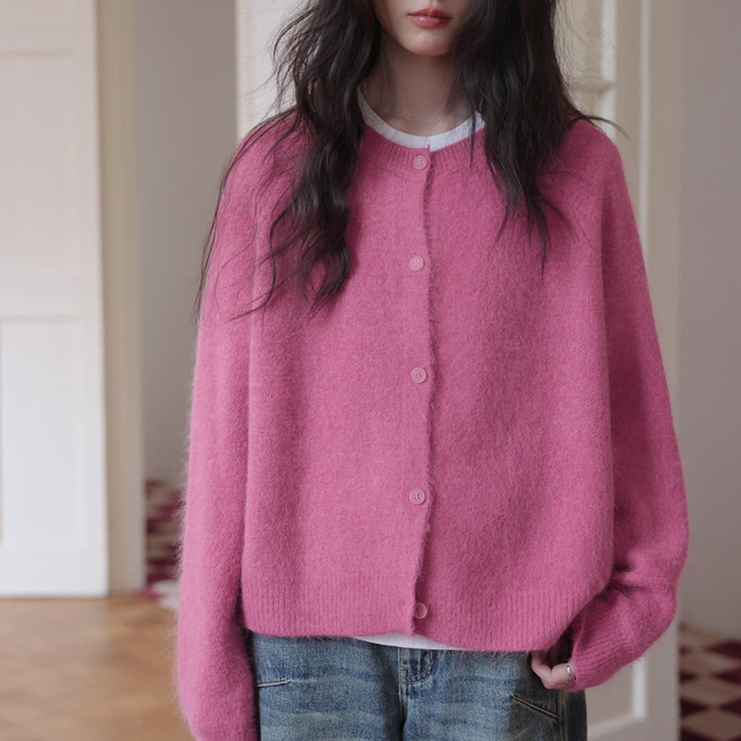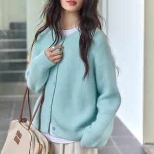 ふんわりとした質感と柔らかな風合いが魅力の、シンプルなボタン付きニットカーディガン。