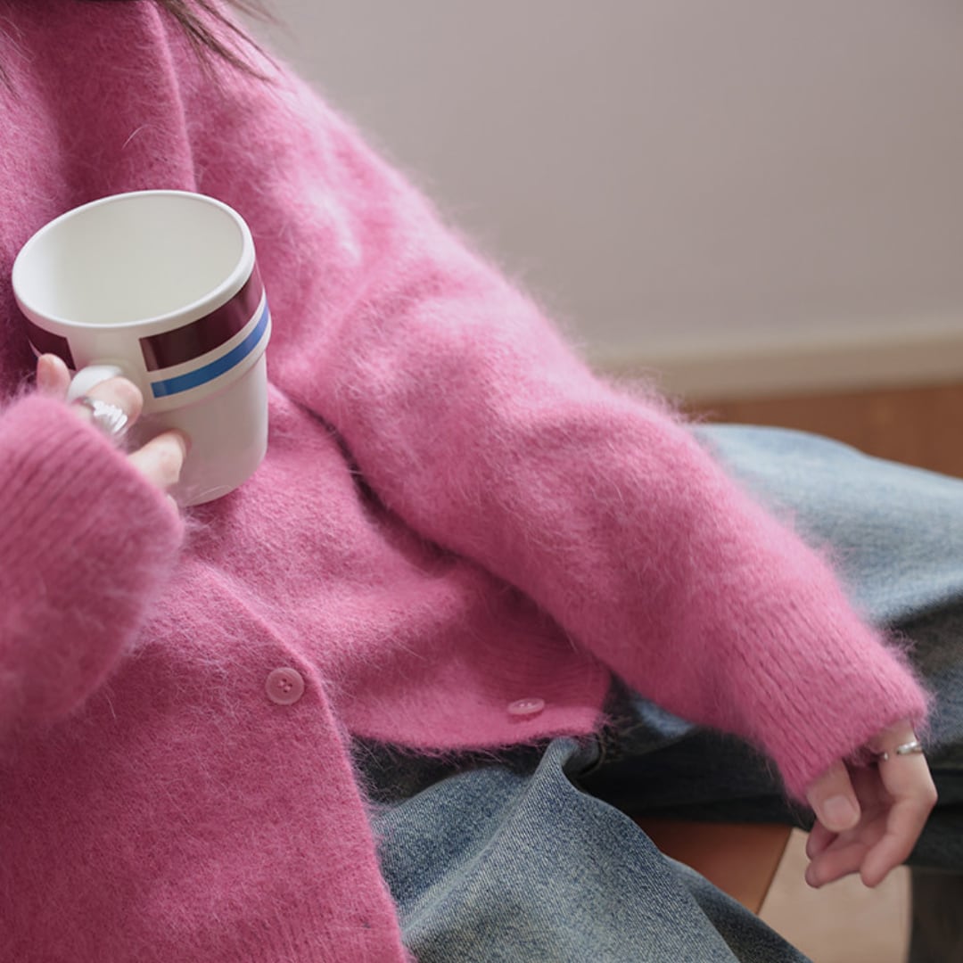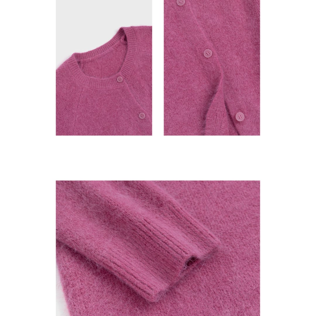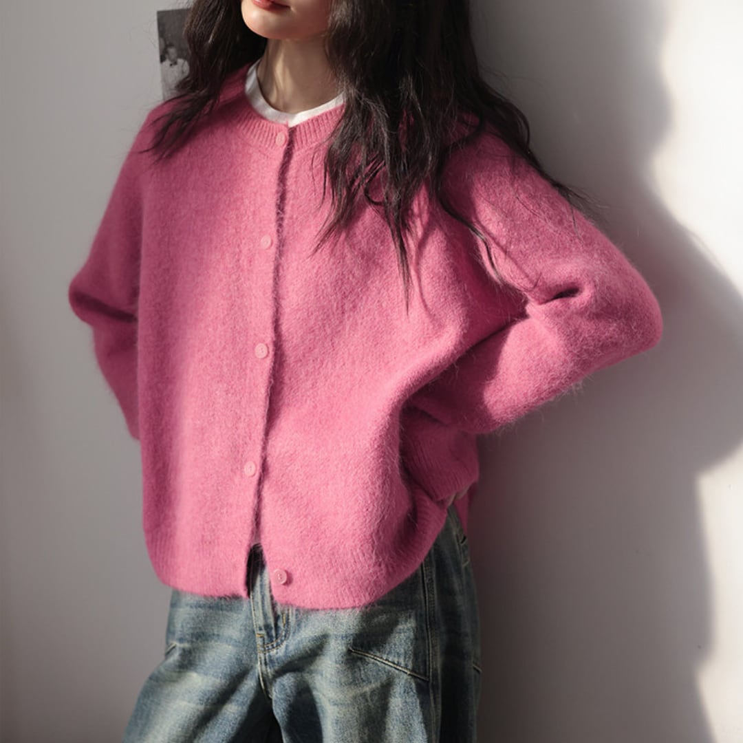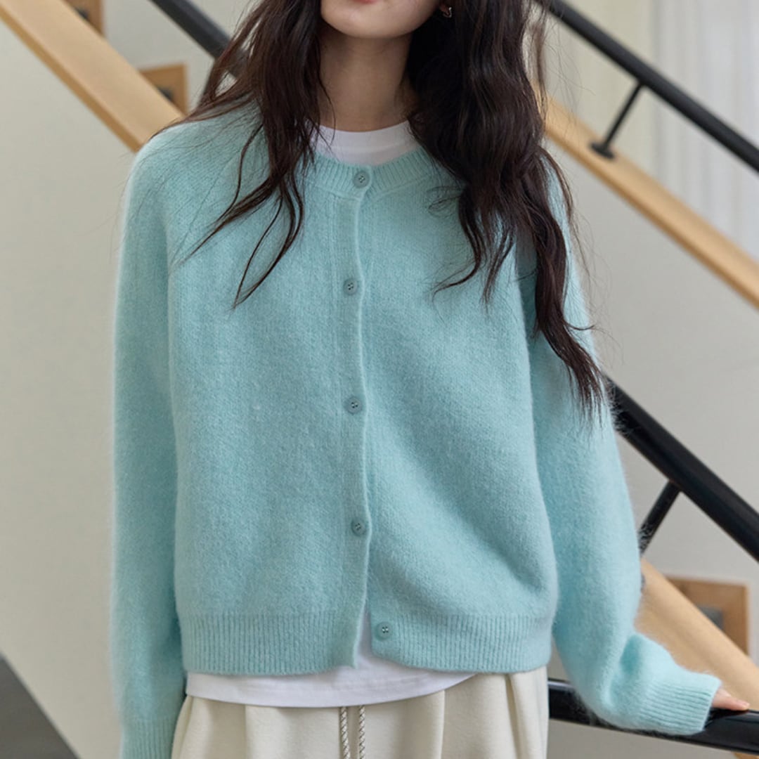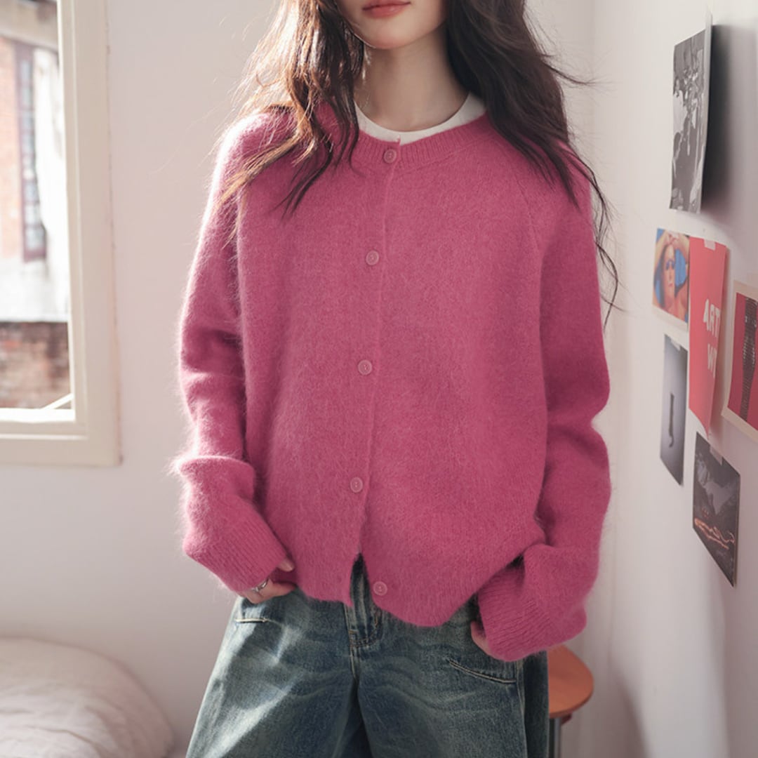 ふんわりとした質感と柔らかな風合いが魅力の、シンプルなボタン付きニットカーディガン。