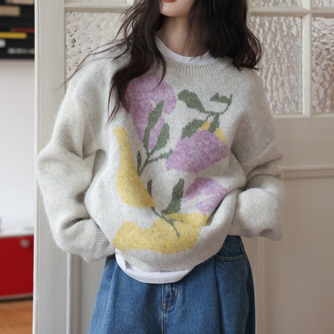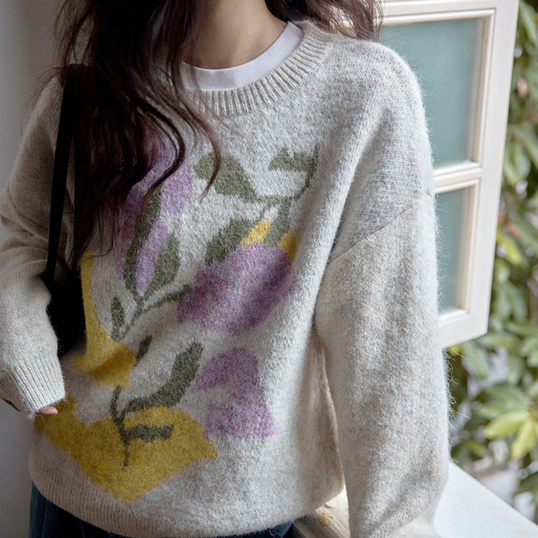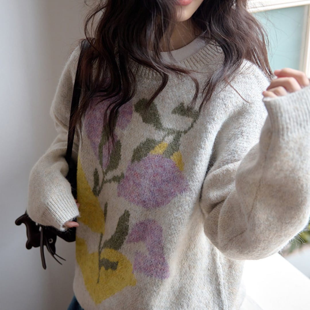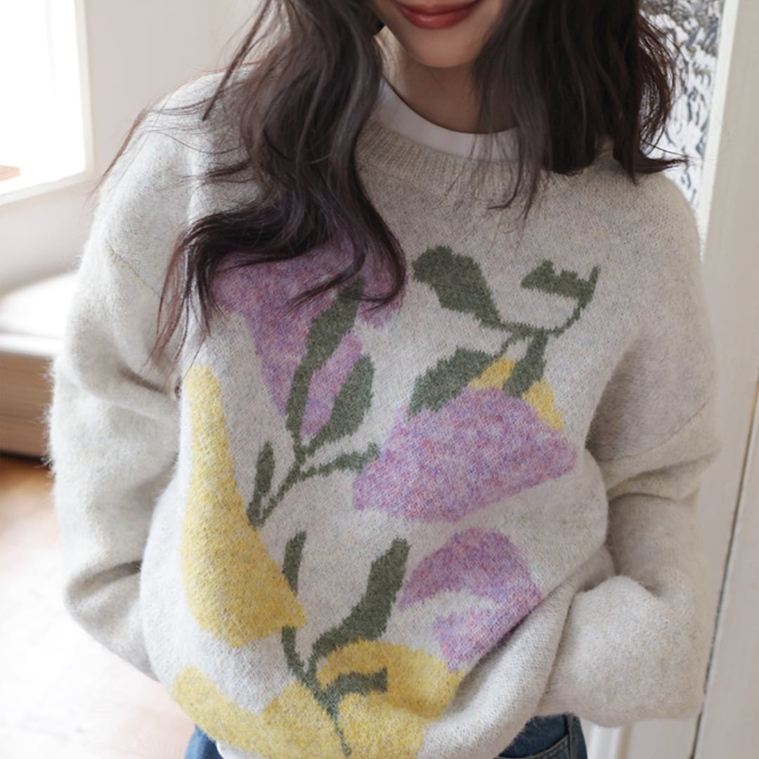 柔らかな肌触りと大胆な花柄が魅力のニットプルオーバー。