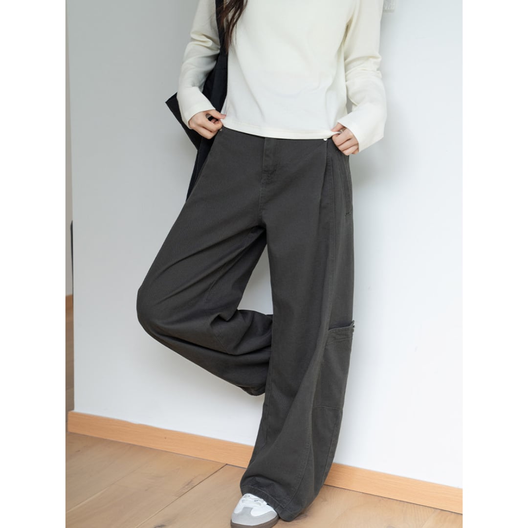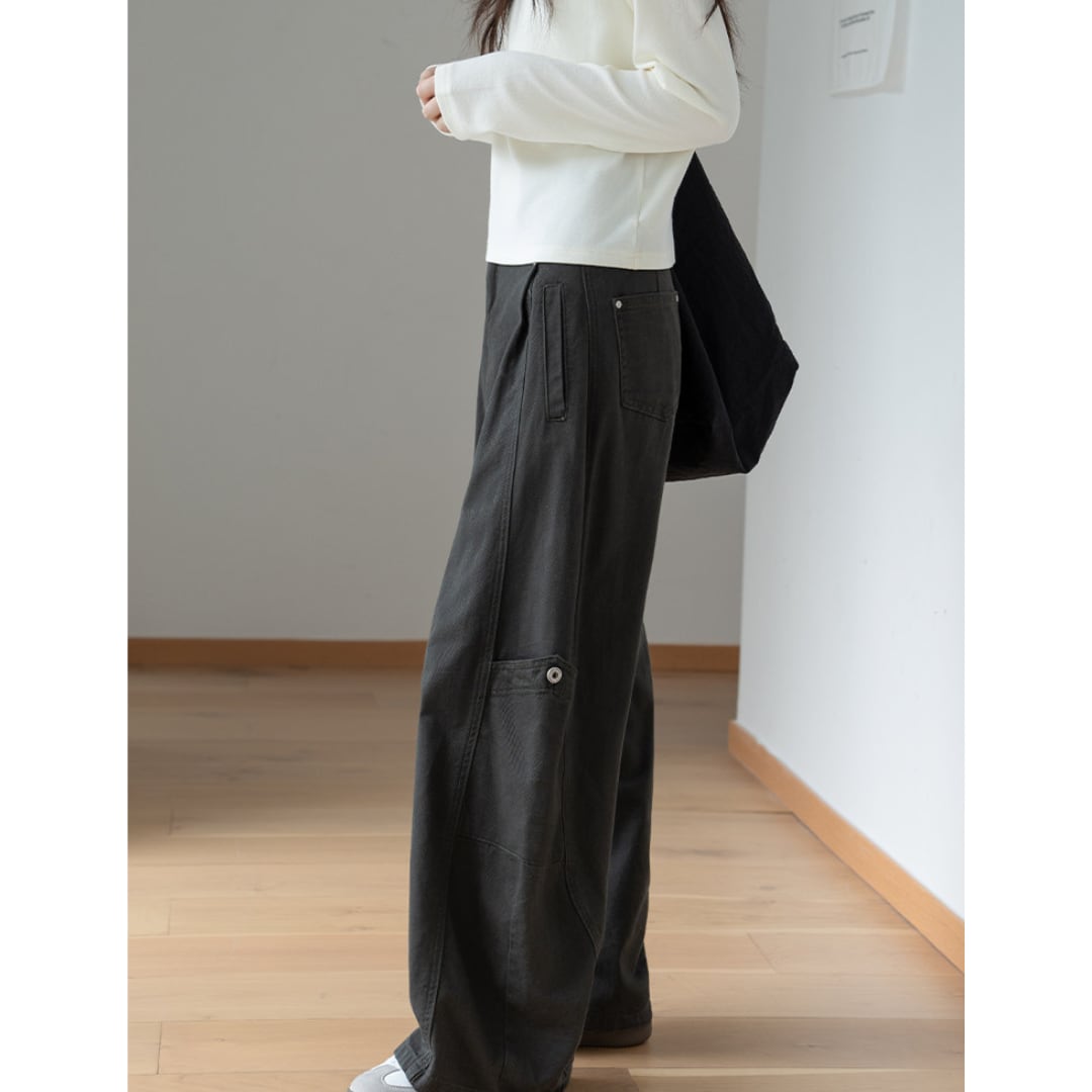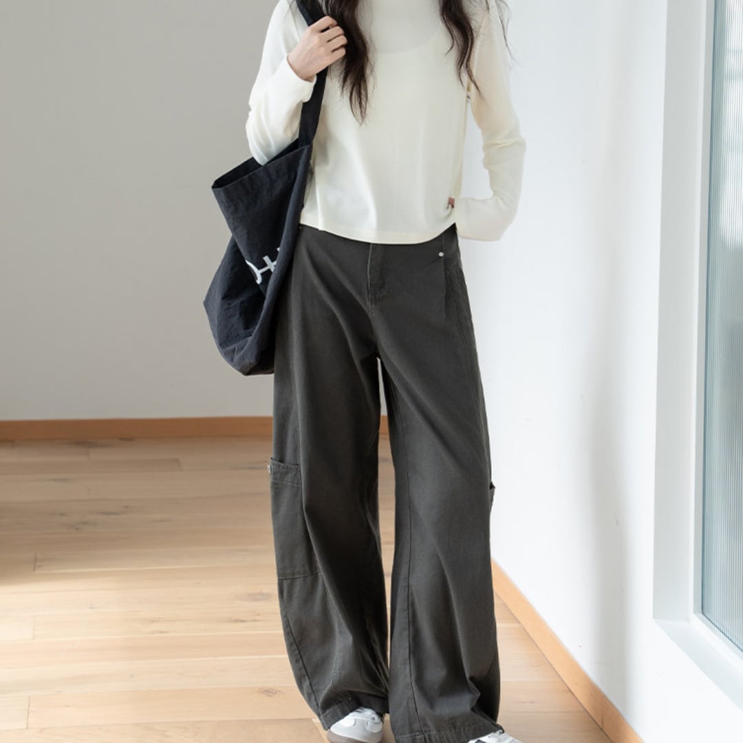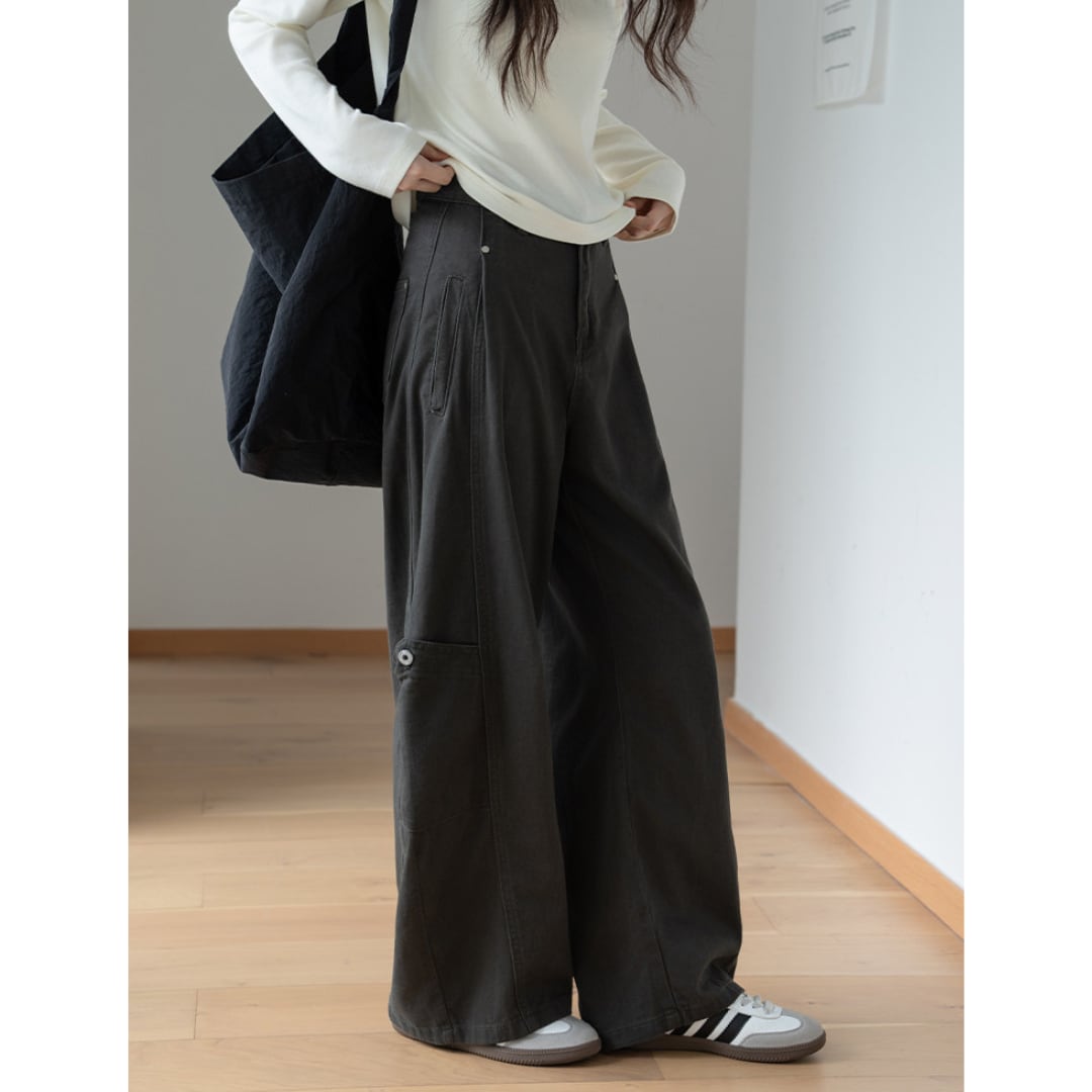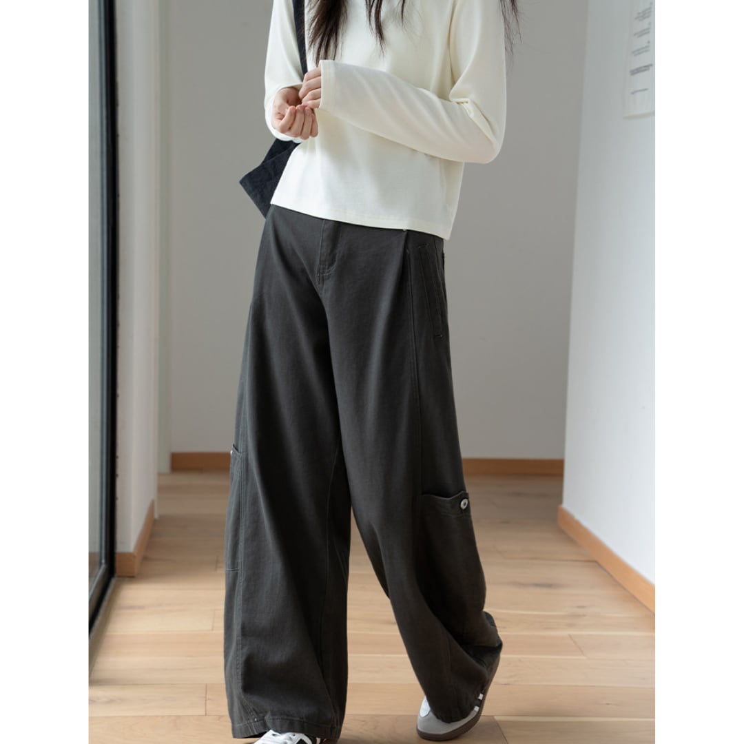 両サイドに大きめのポケットが付いた、カジュアルで実用的なワイドストレートパンツ。