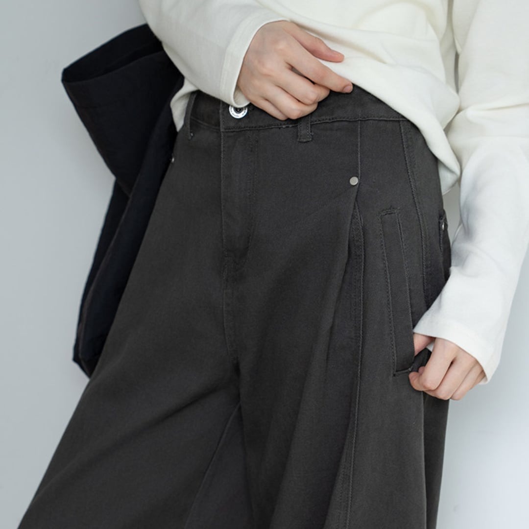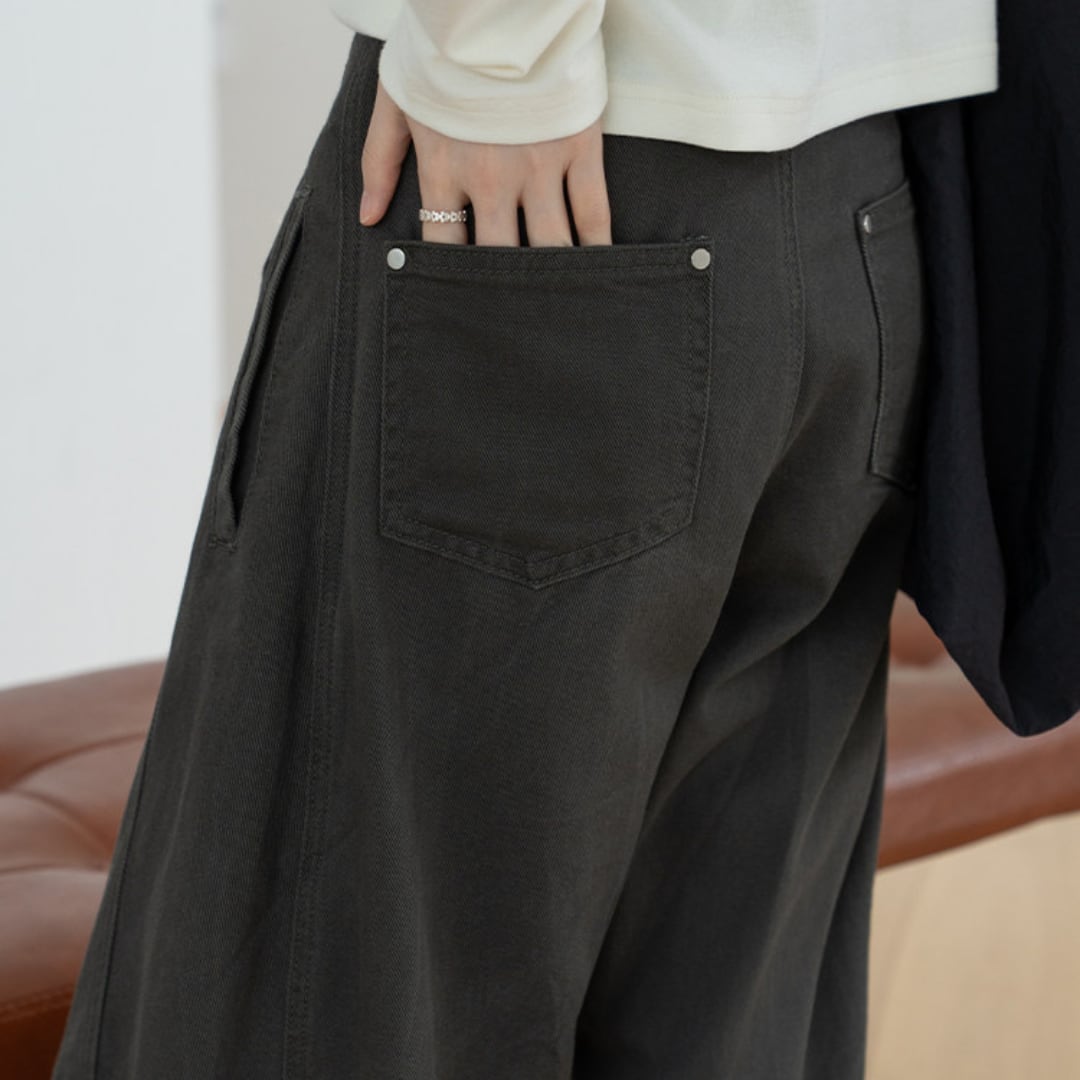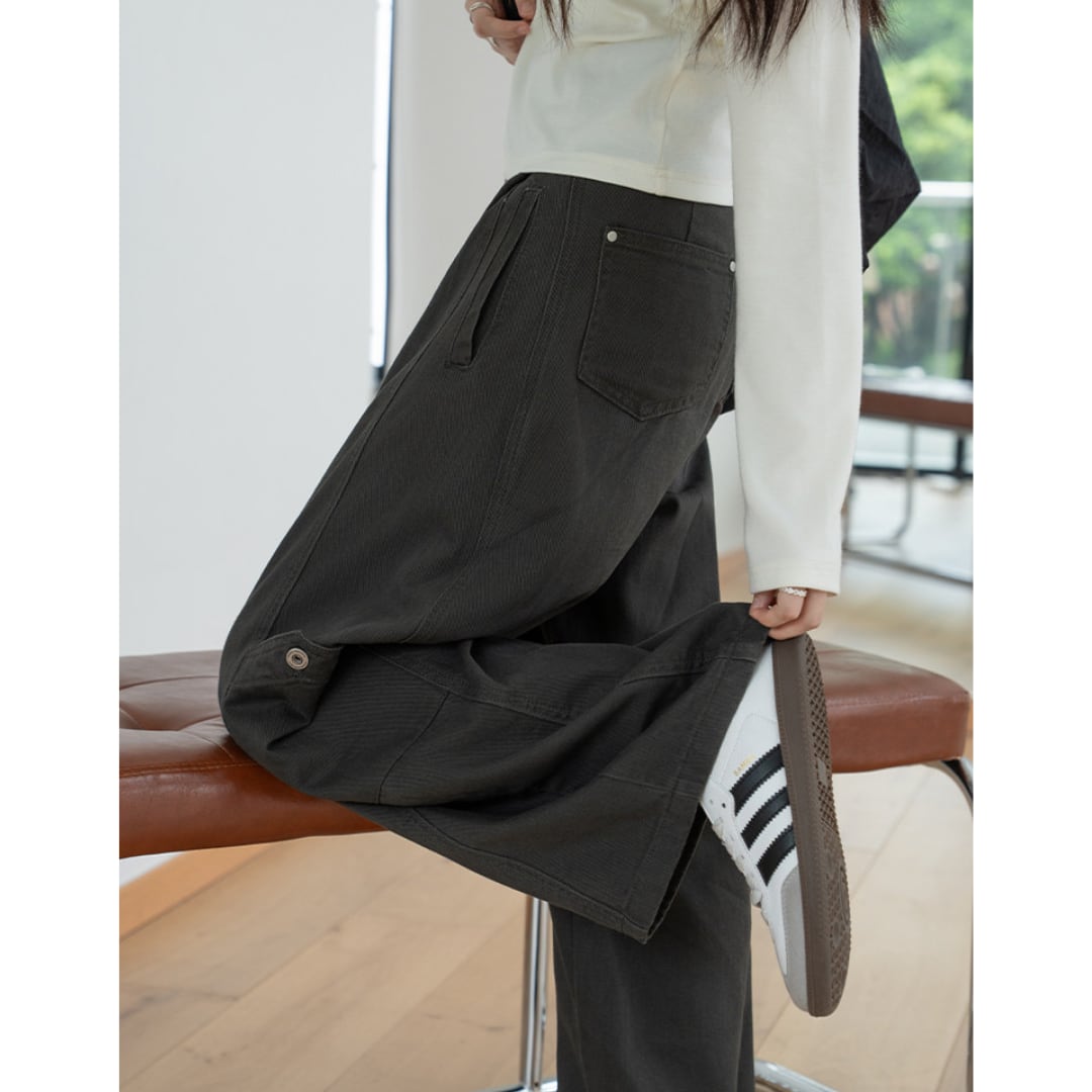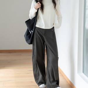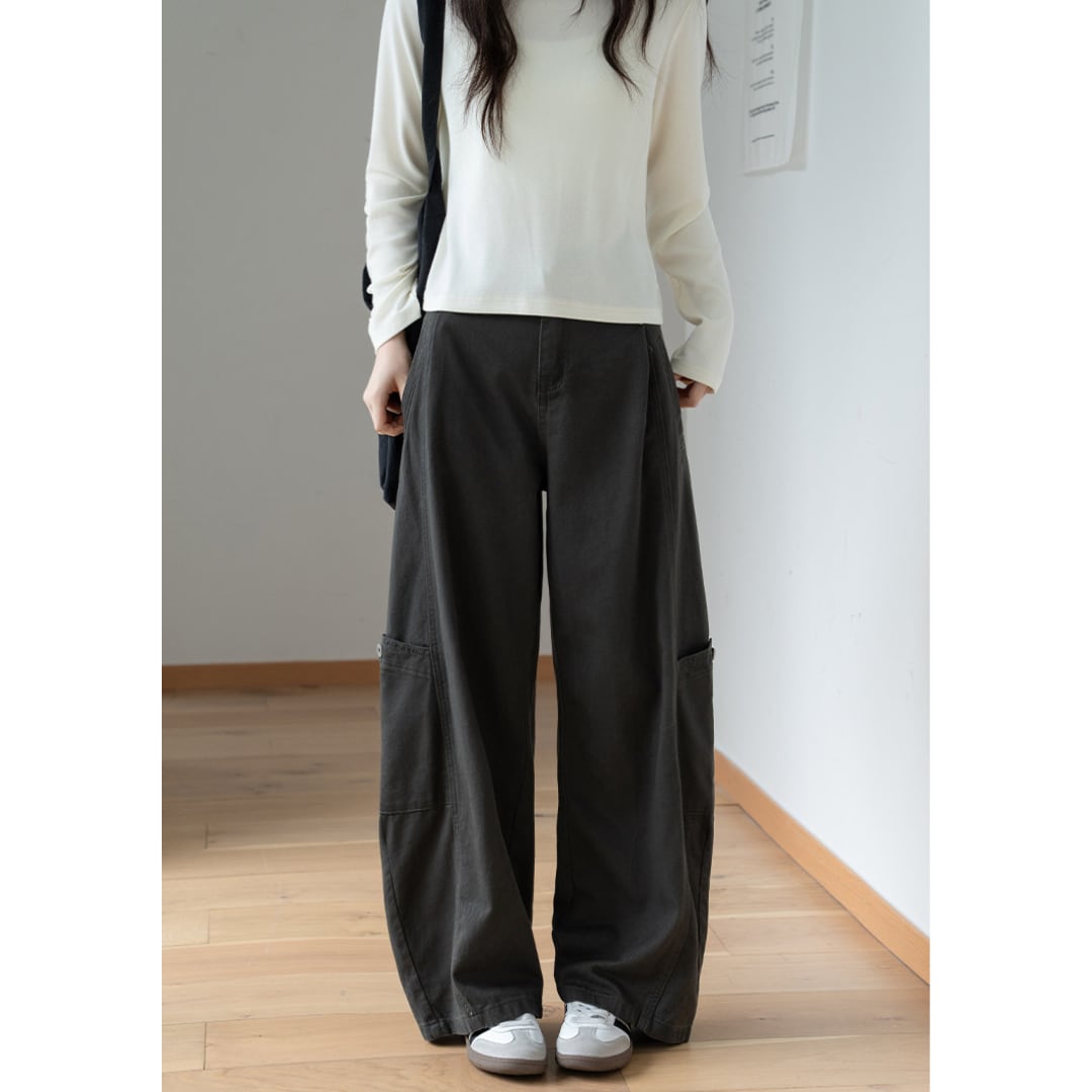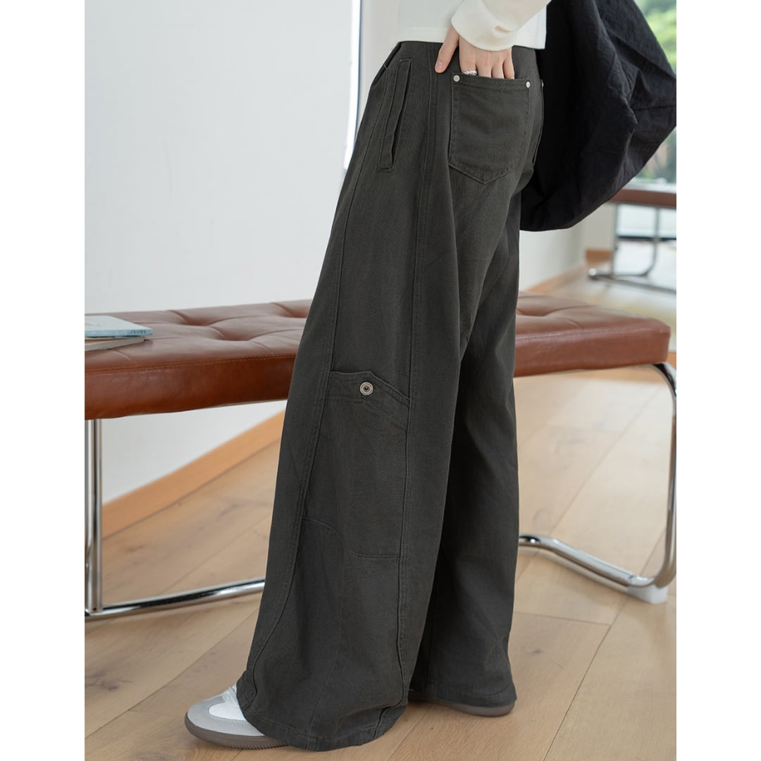 両サイドに大きめのポケットが付いた、カジュアルで実用的なワイドストレートパンツ。