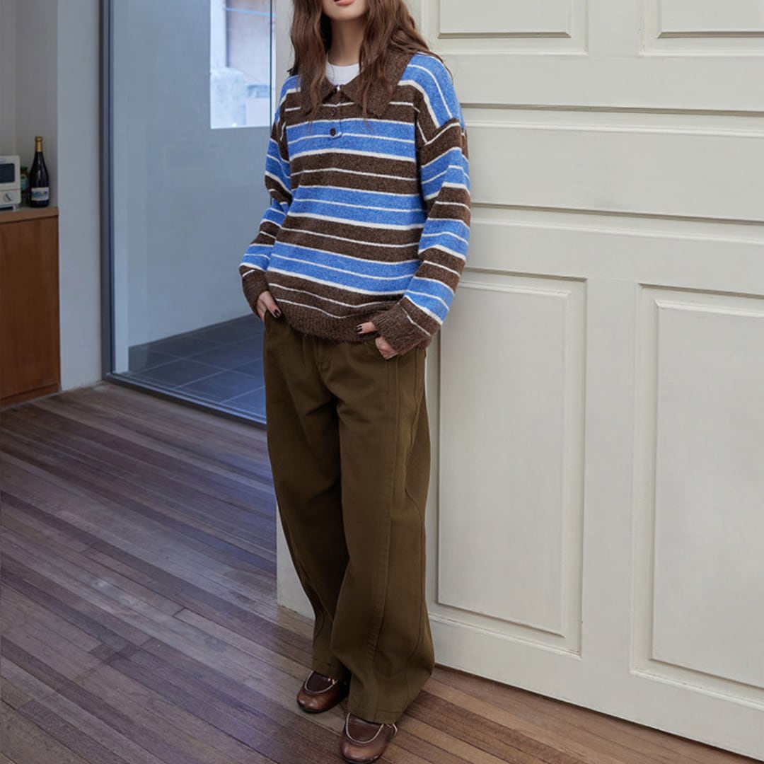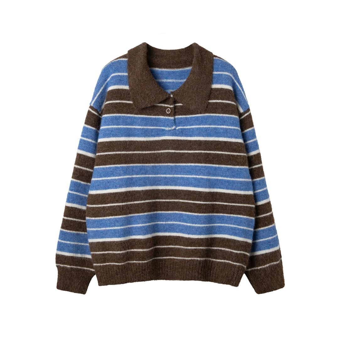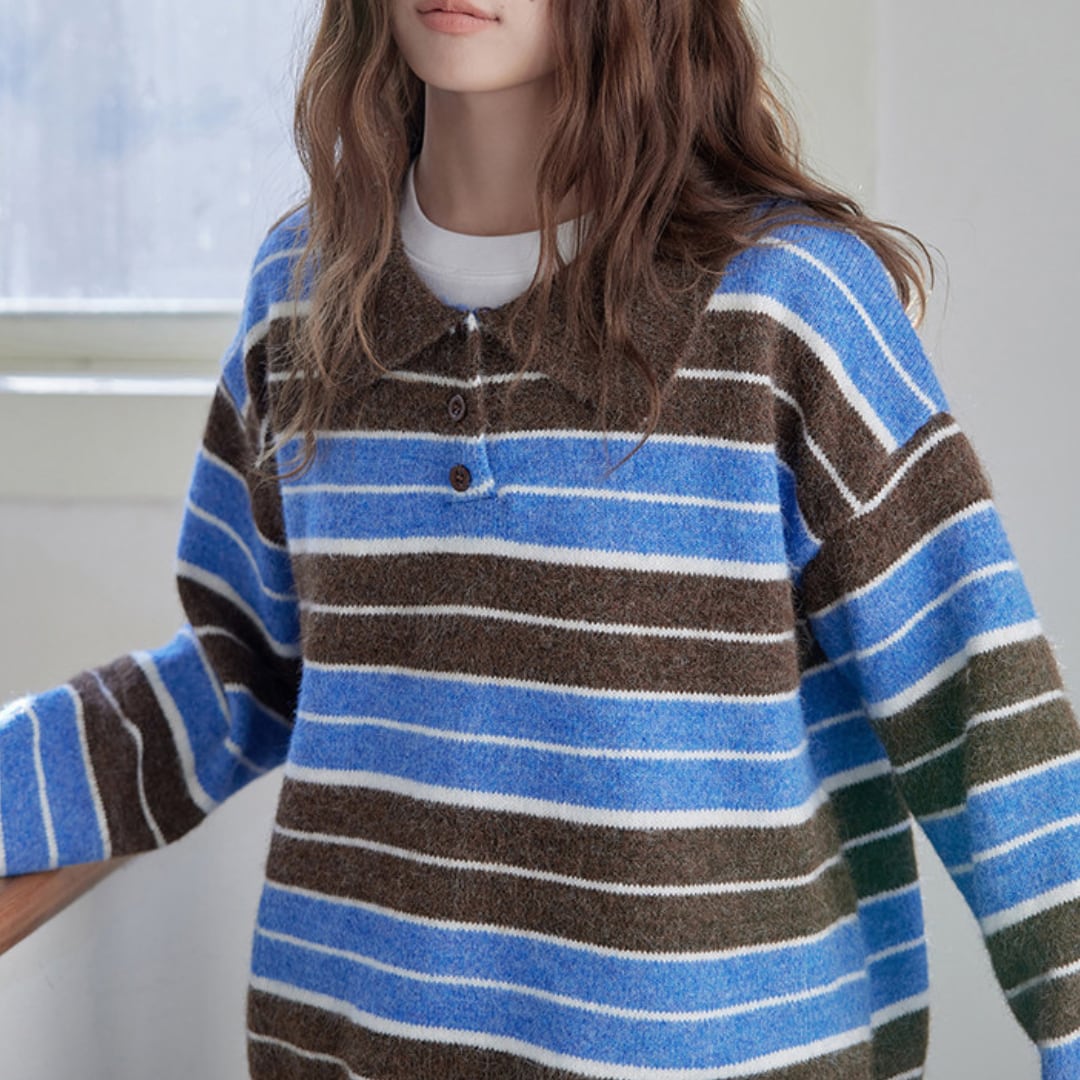毛足のある柔らかな風合いとボーダー配色が魅力のポロカラーニット。