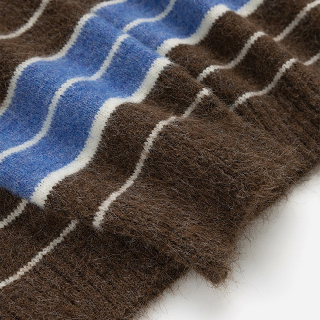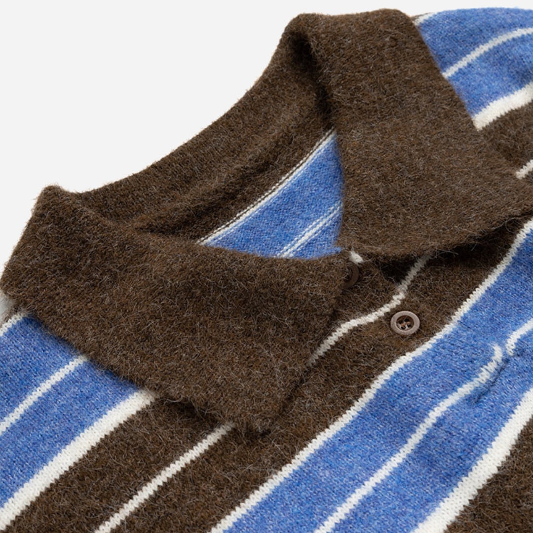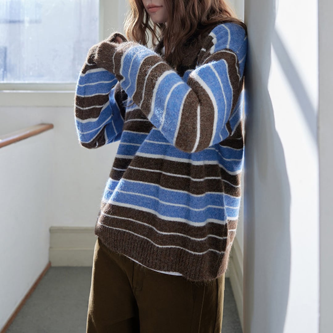 毛足のある柔らかな風合いとボーダー配色が魅力のポロカラーニット。
