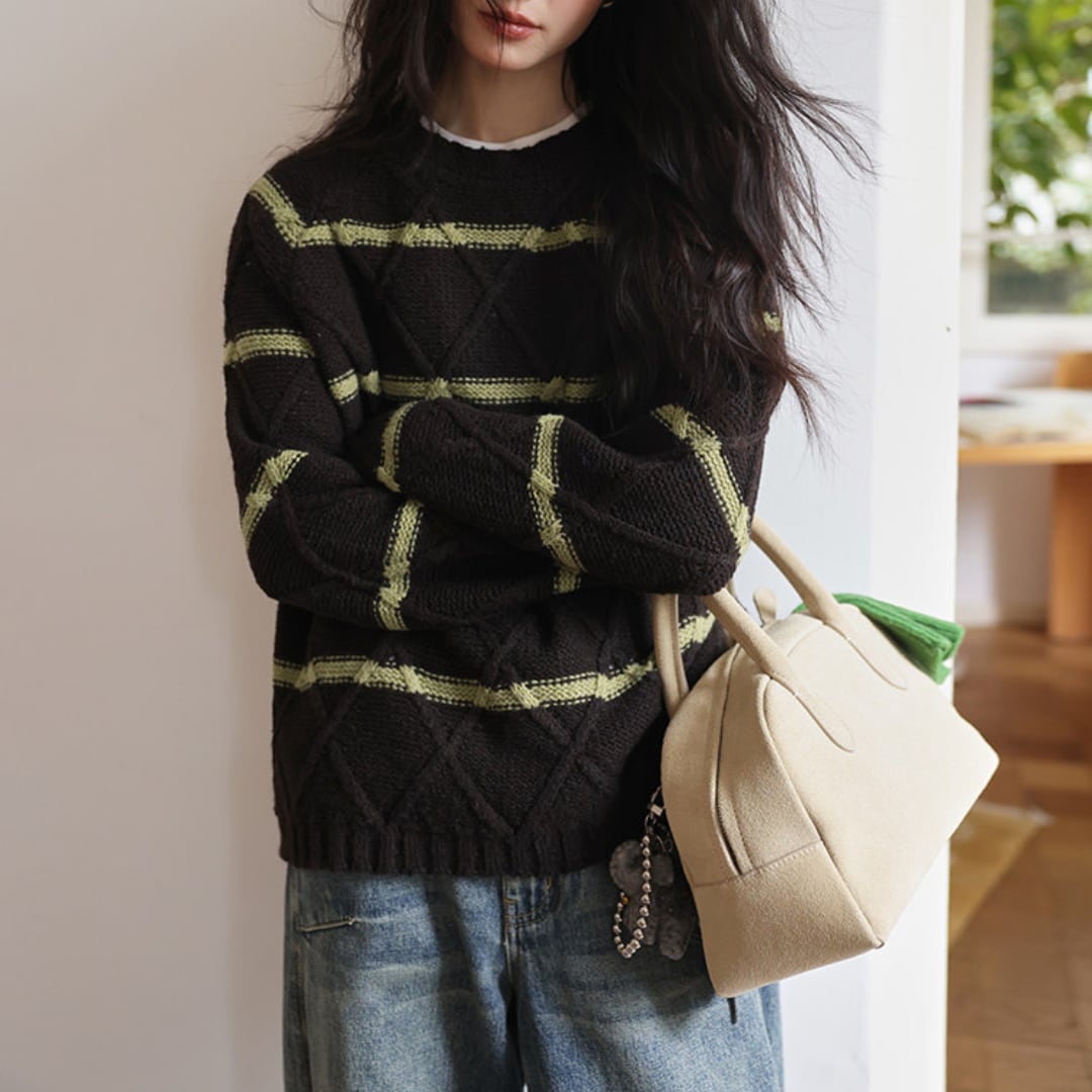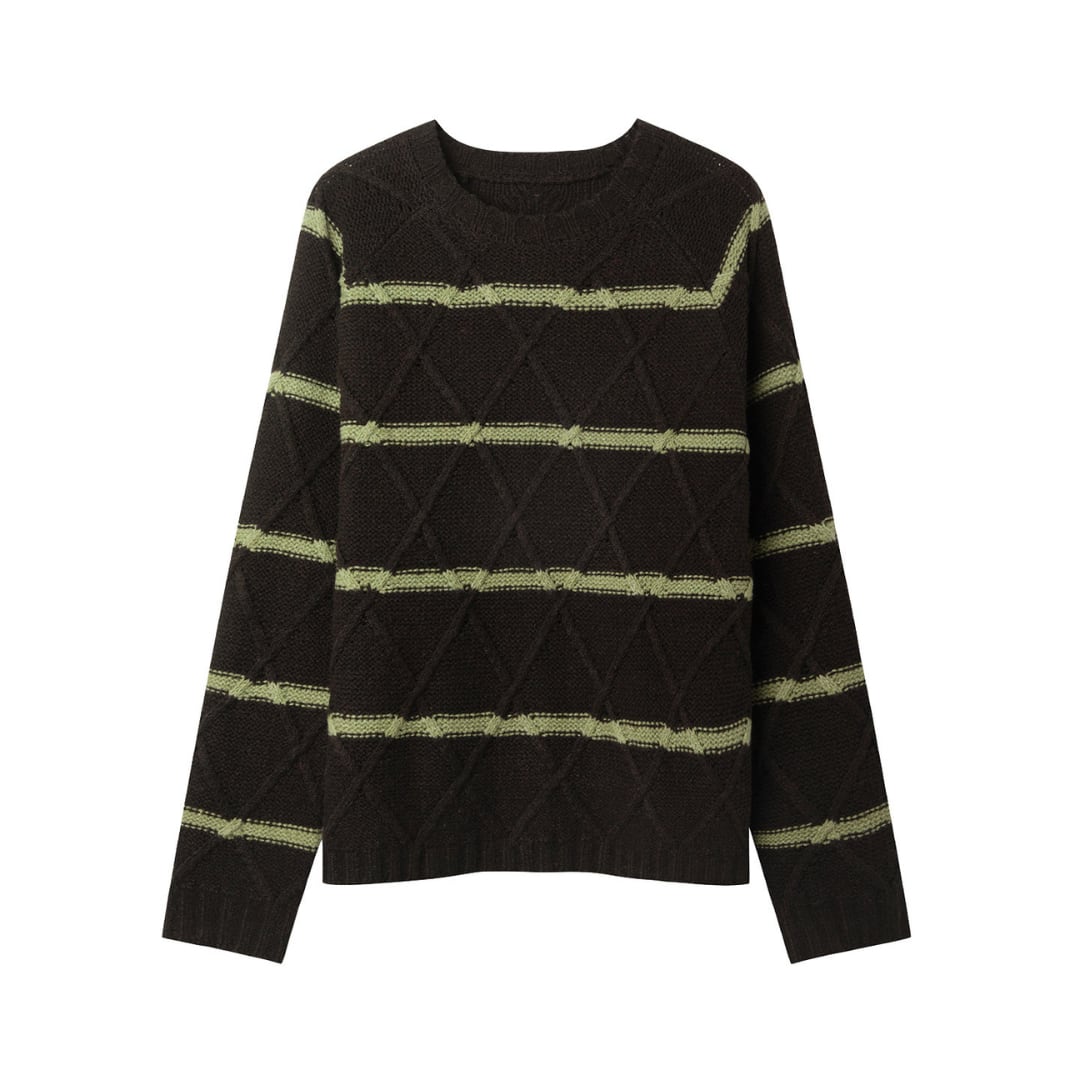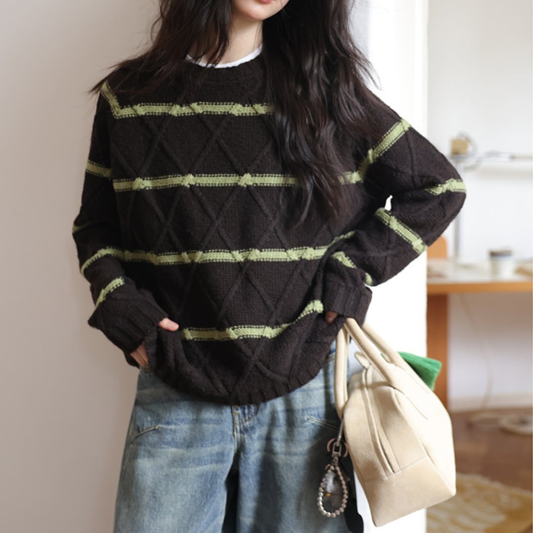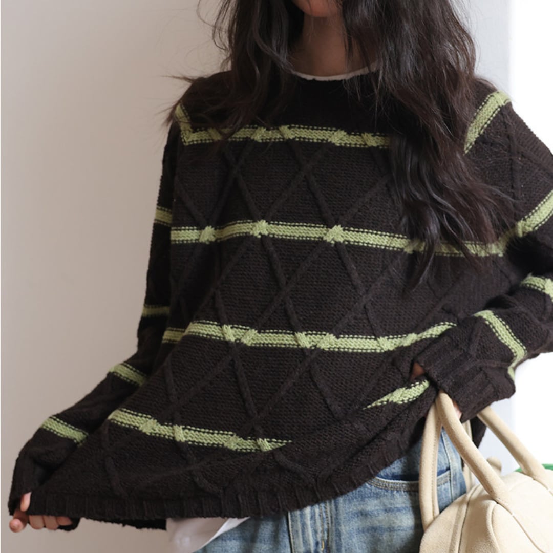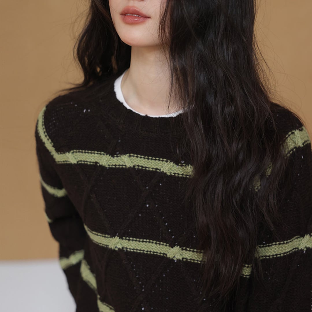 編み柄の立体感と配色ラインがアクセントになった、柔らかな印象のニットプルオーバー。