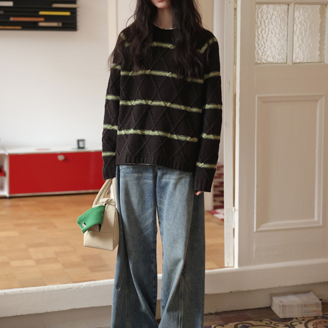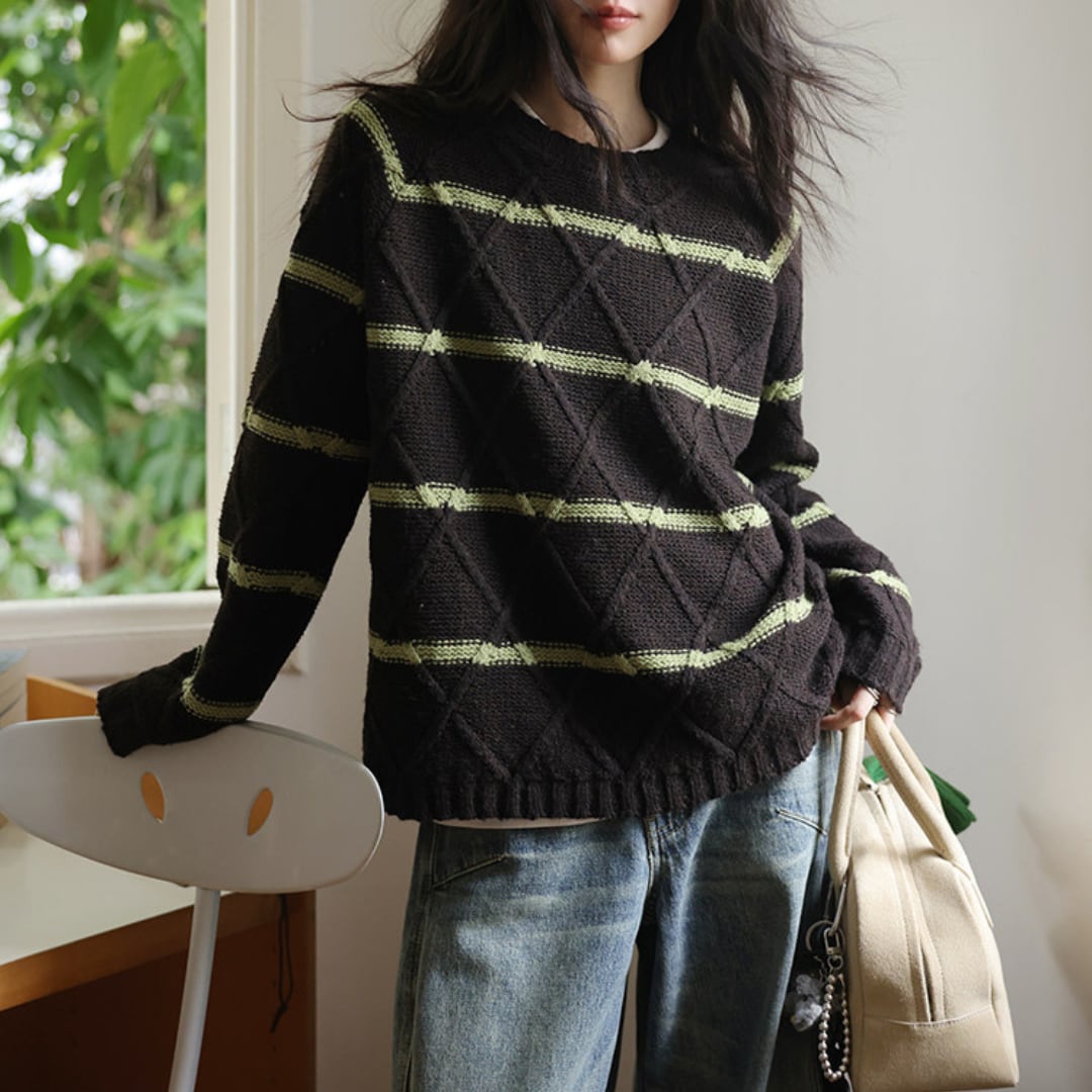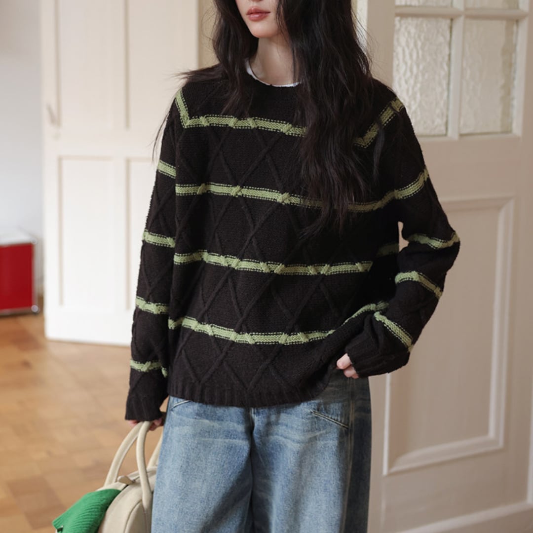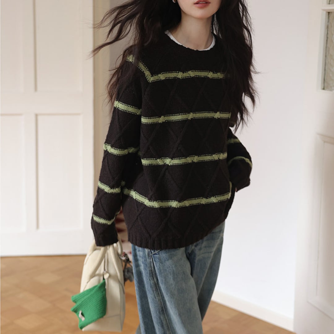 編み柄の立体感と配色ラインがアクセントになった、柔らかな印象のニットプルオーバー。