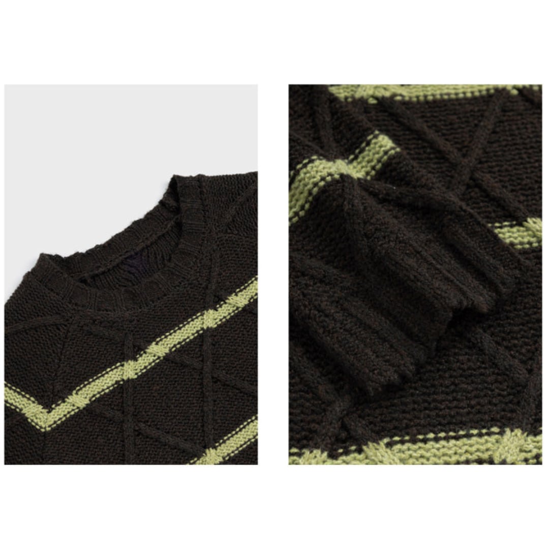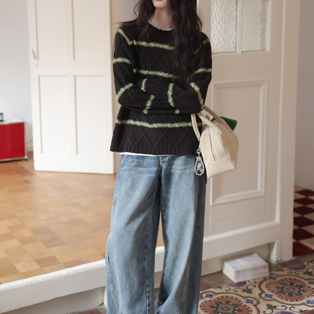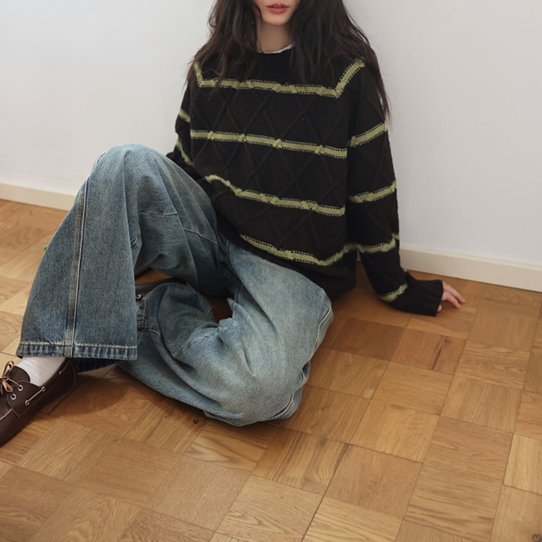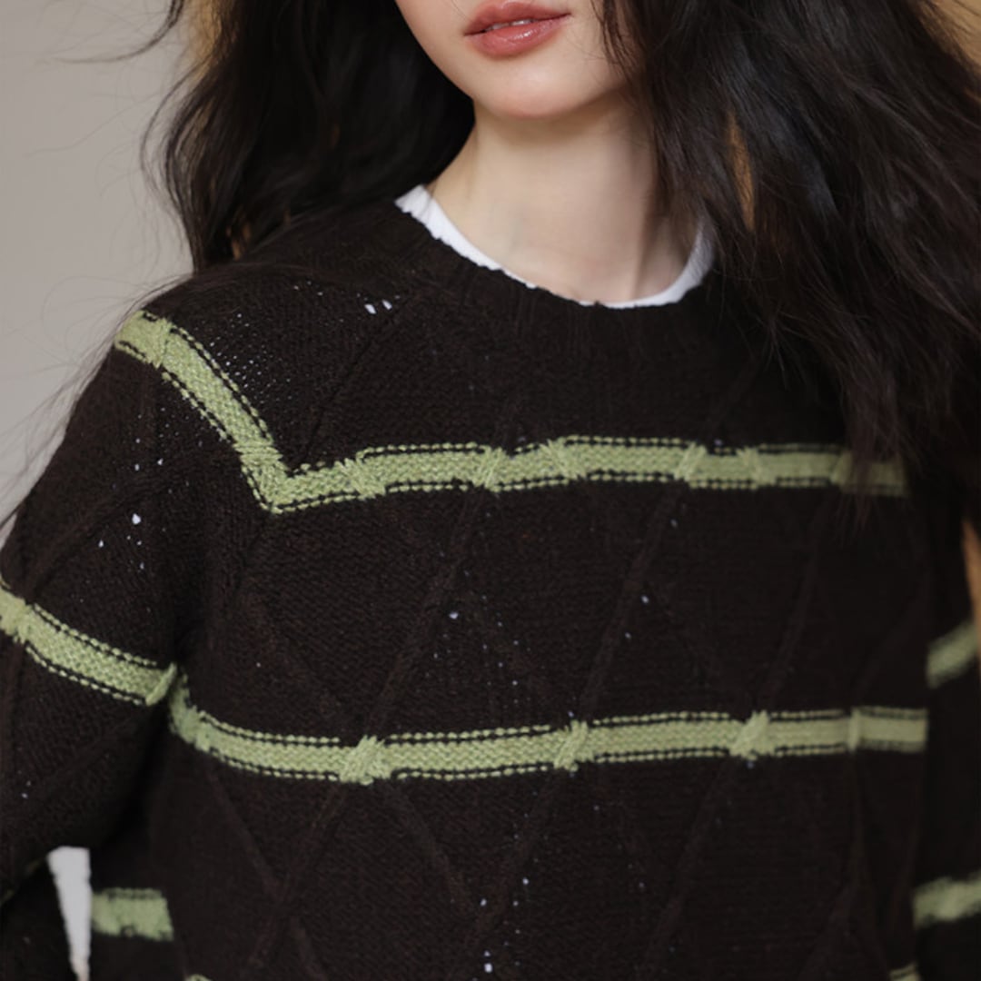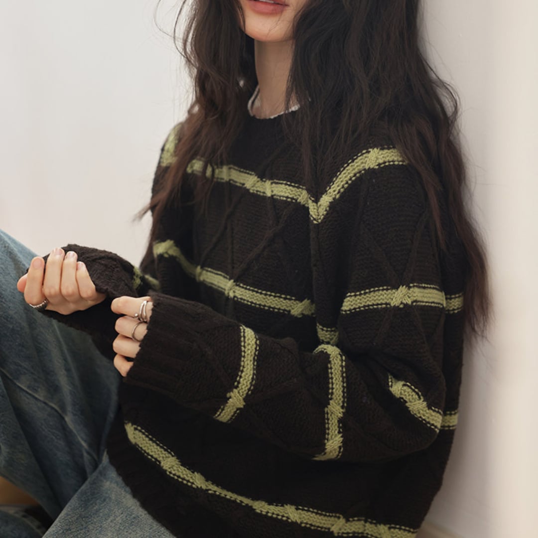 編み柄の立体感と配色ラインがアクセントになった、柔らかな印象のニットプルオーバー。