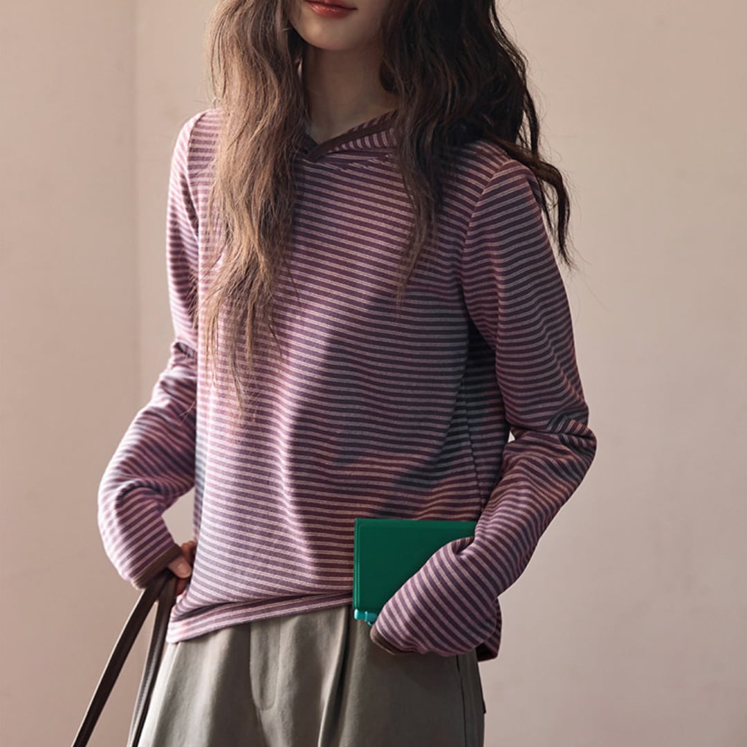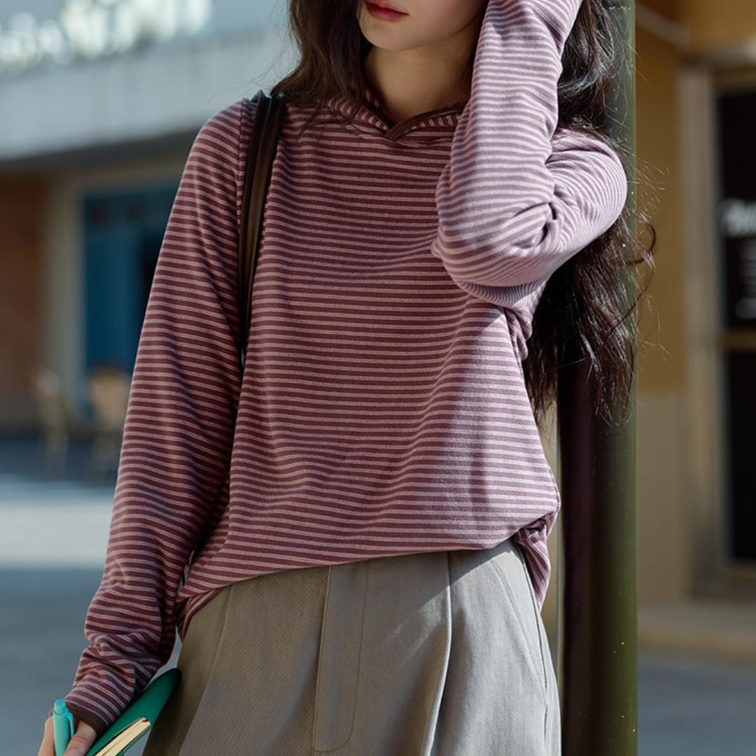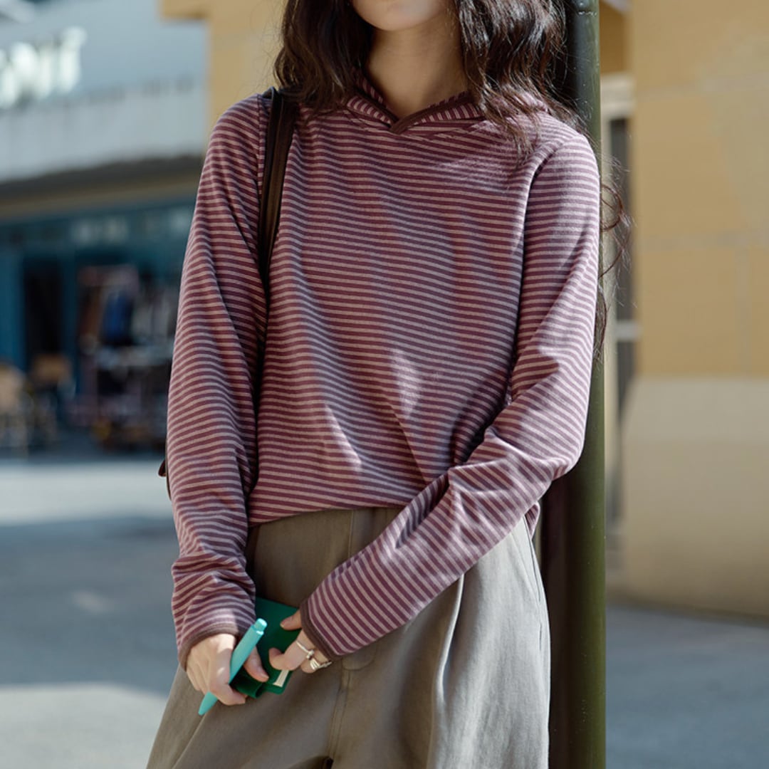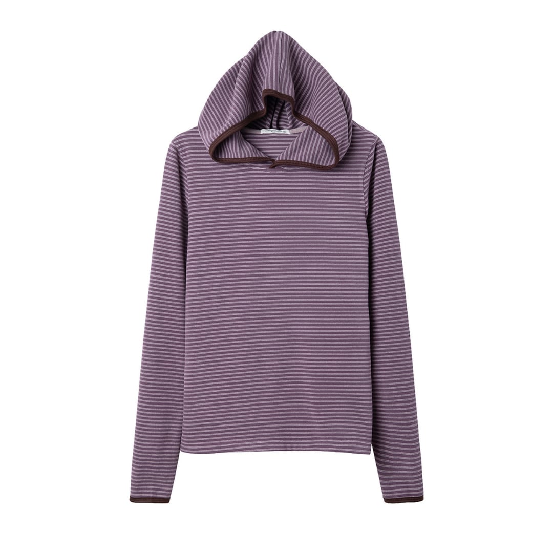 細ボーダー柄とフード付きデザインが程よくカジュアルな印象を与えるトップス。
