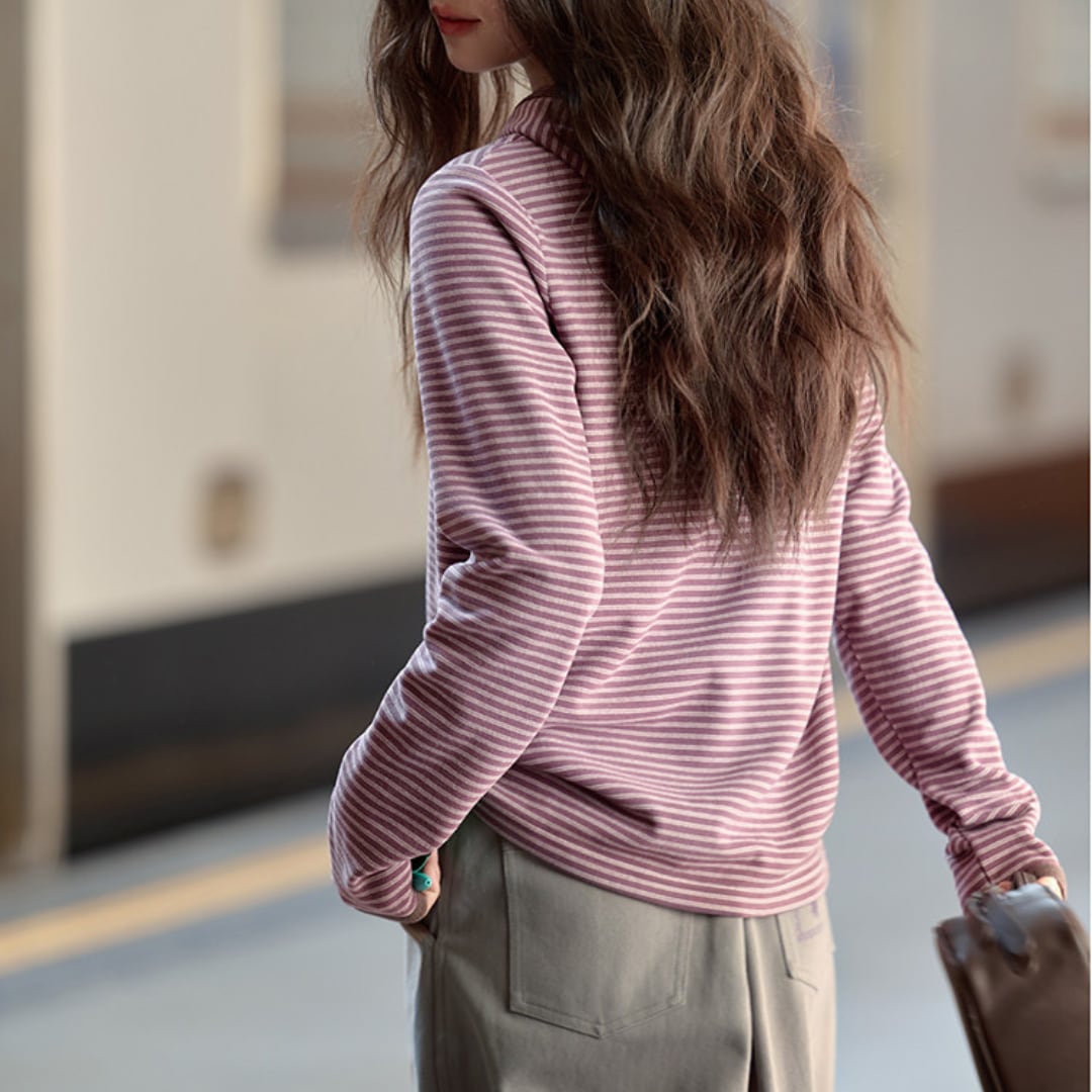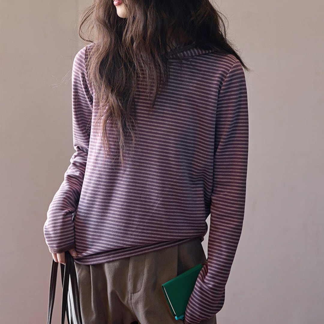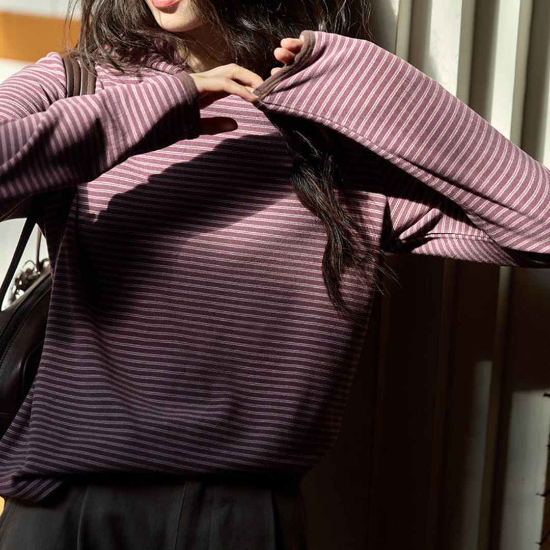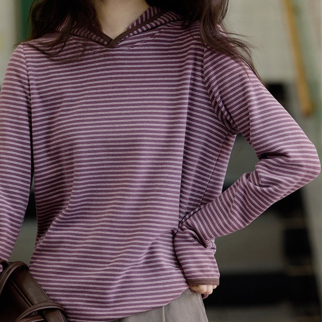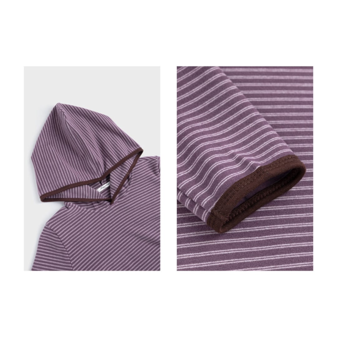 細ボーダー柄とフード付きデザインが程よくカジュアルな印象を与えるトップス。