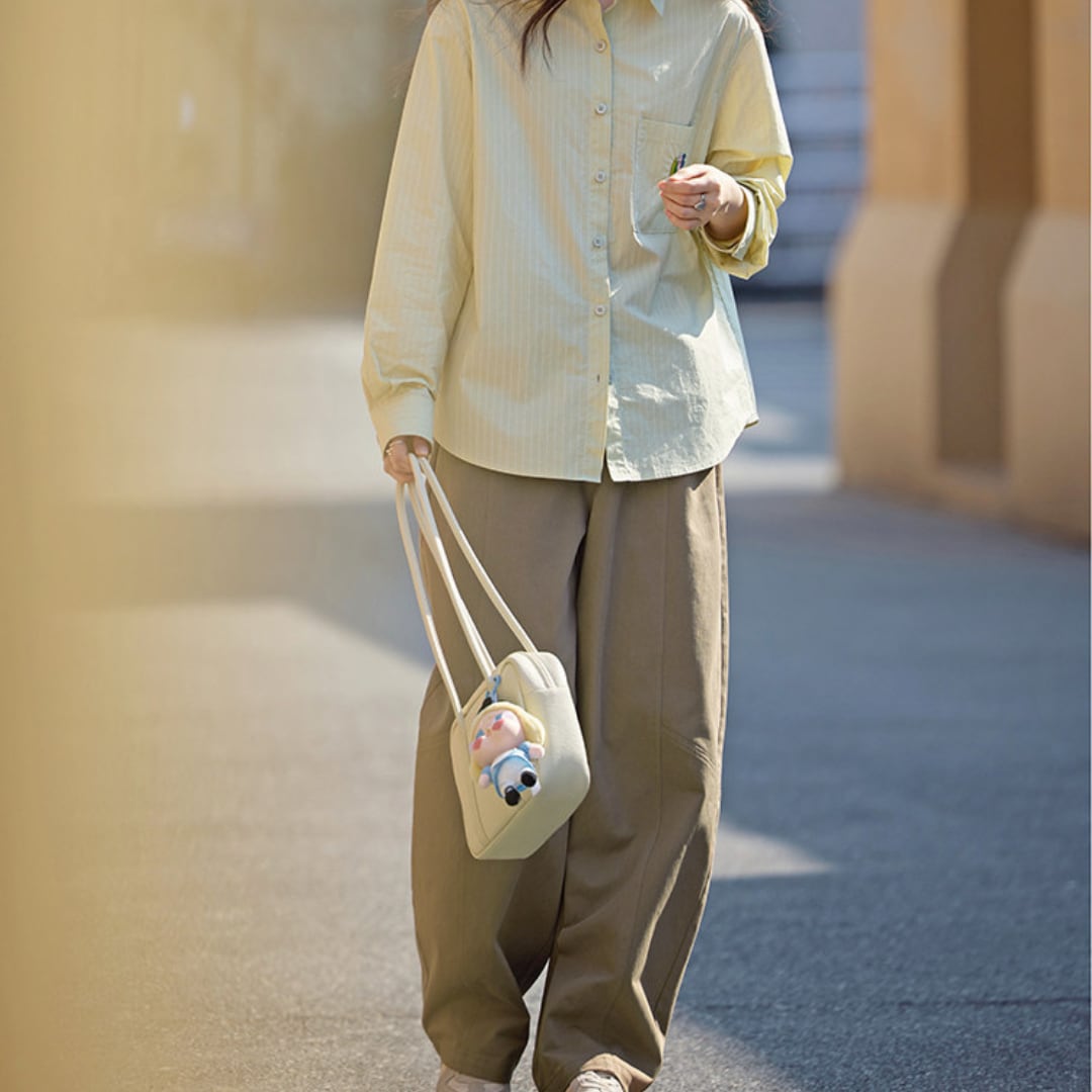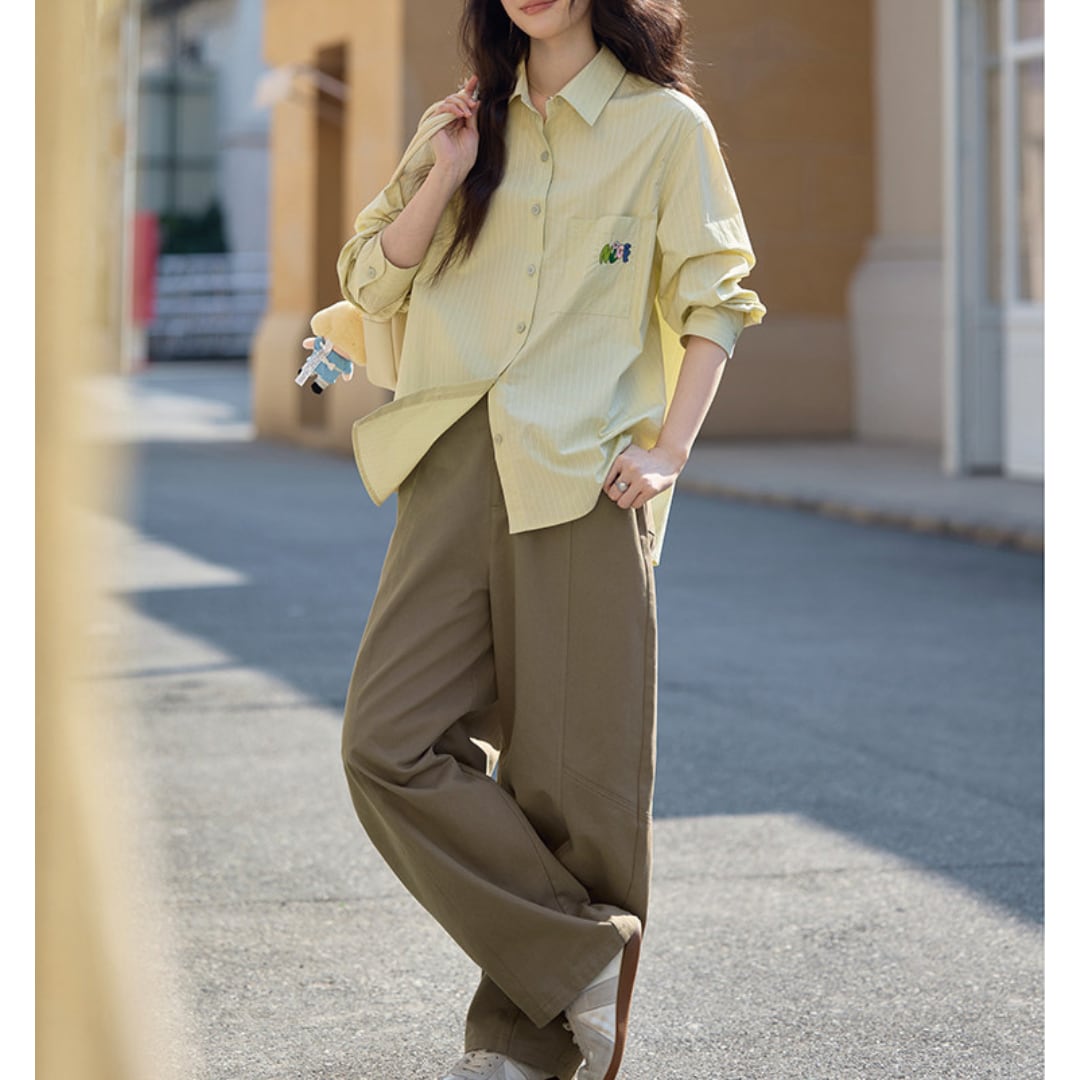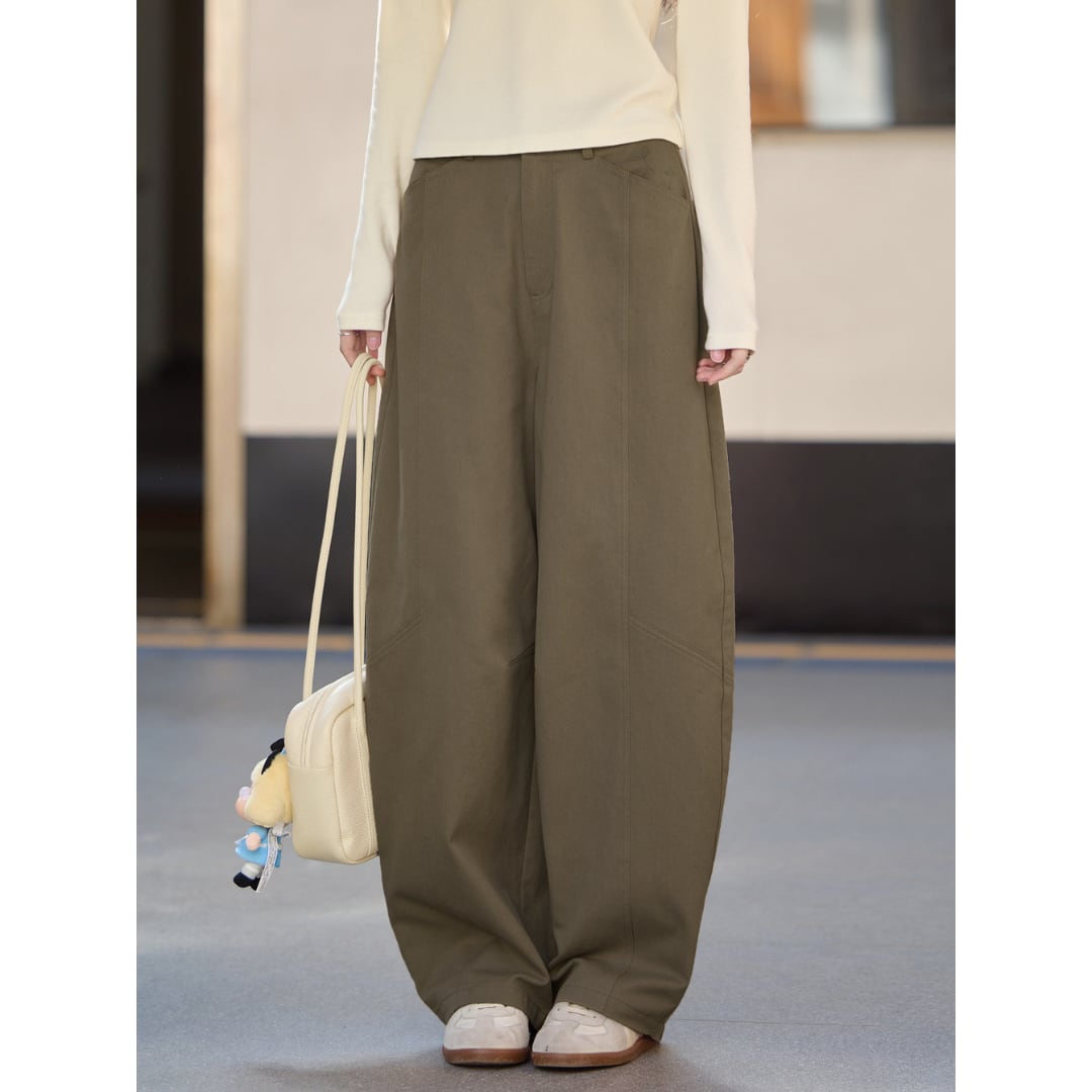 切り替えラインがさりげないアクセントになった、ゆったりとしたストレートシルエットのパンツ。