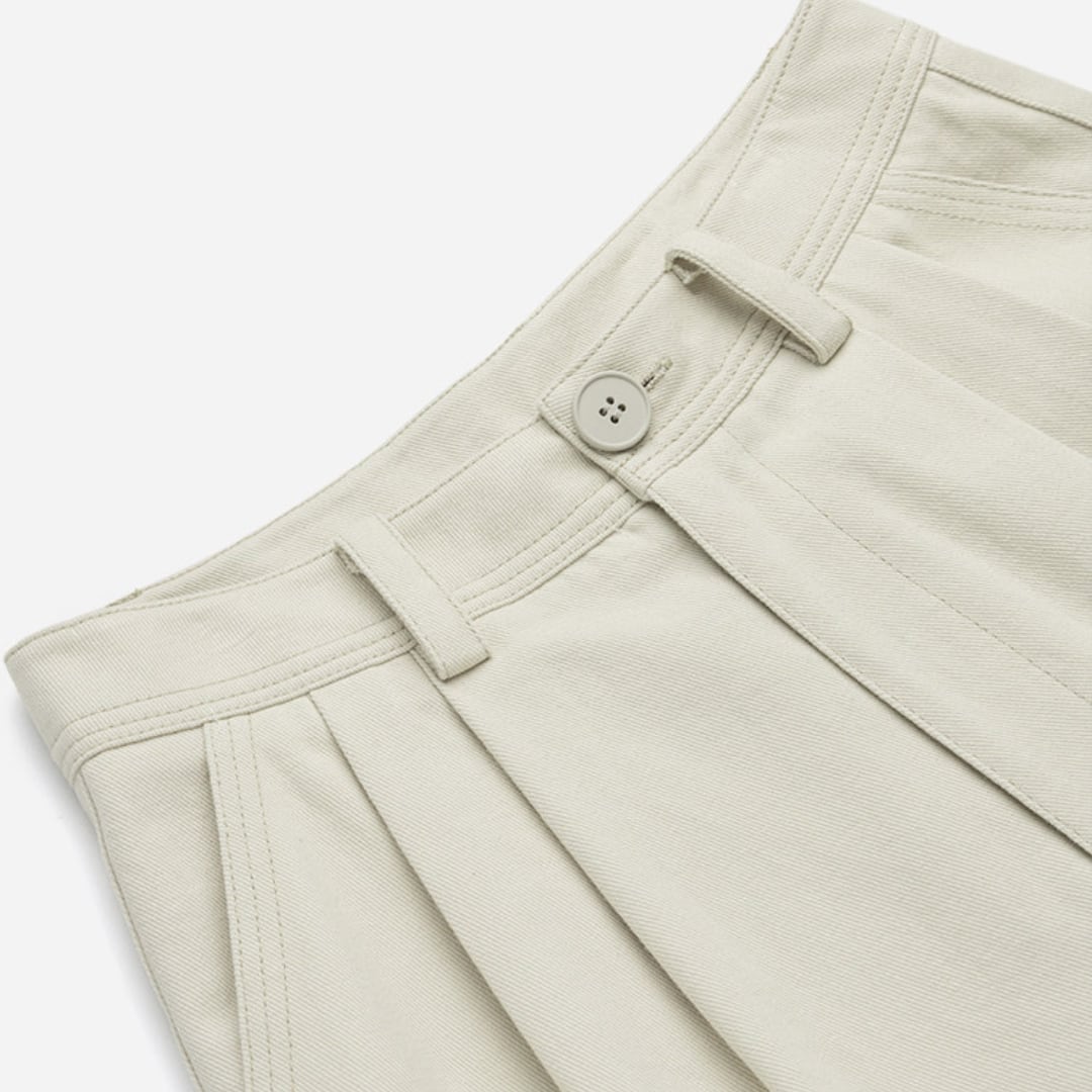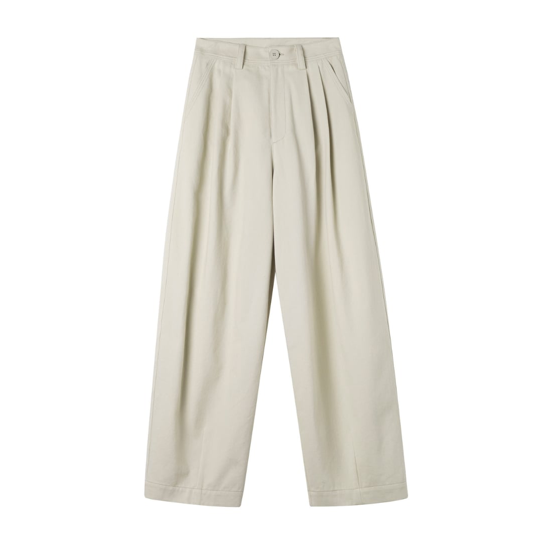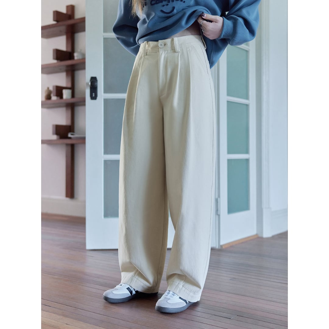 ゆったりとしたワイドシルエットと高めのウエスト設計が特徴の、リラックス感あふれるコットンパンツです。