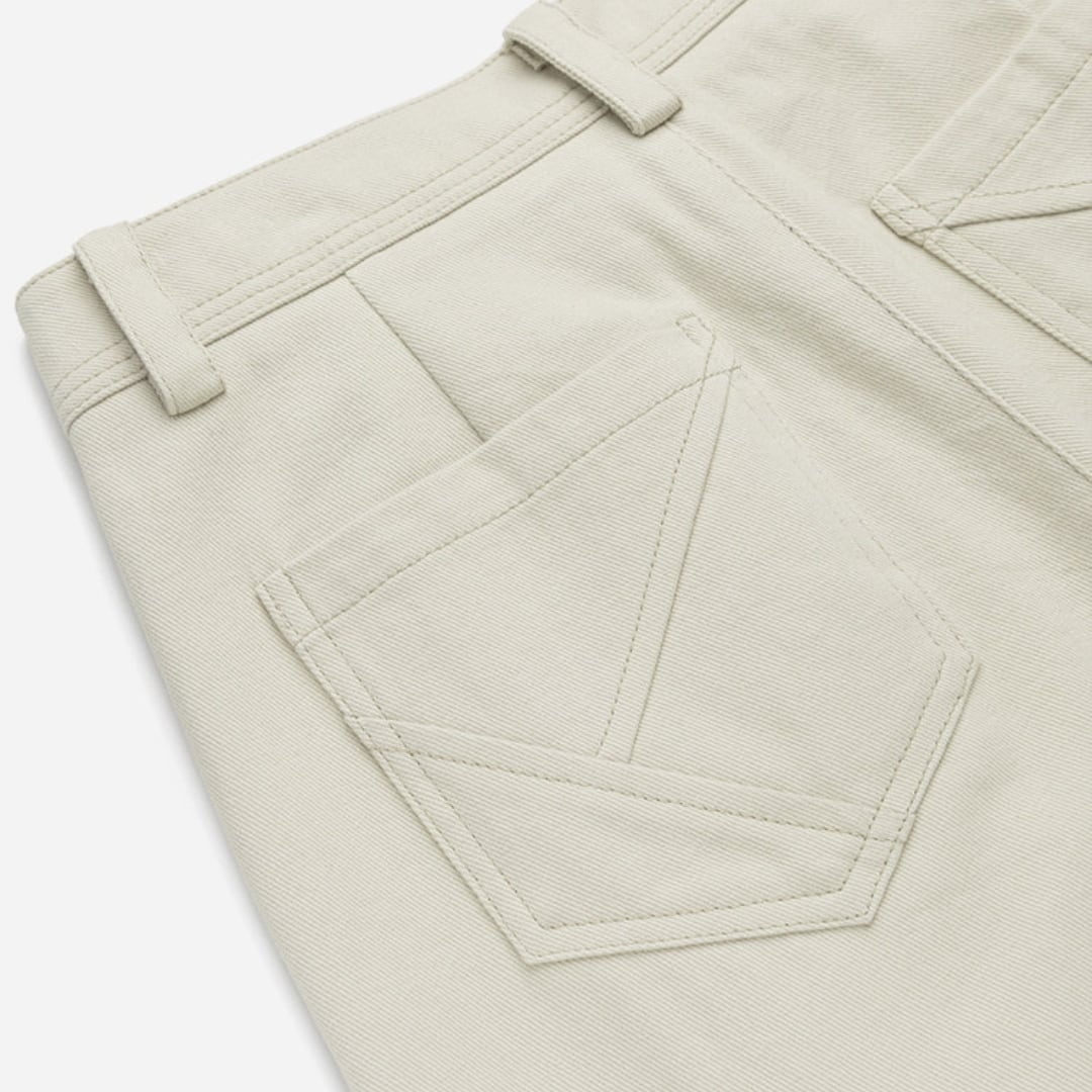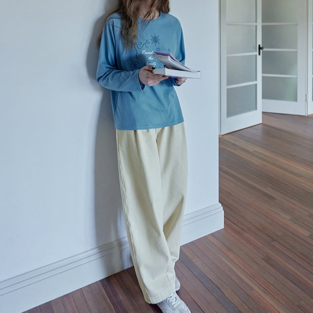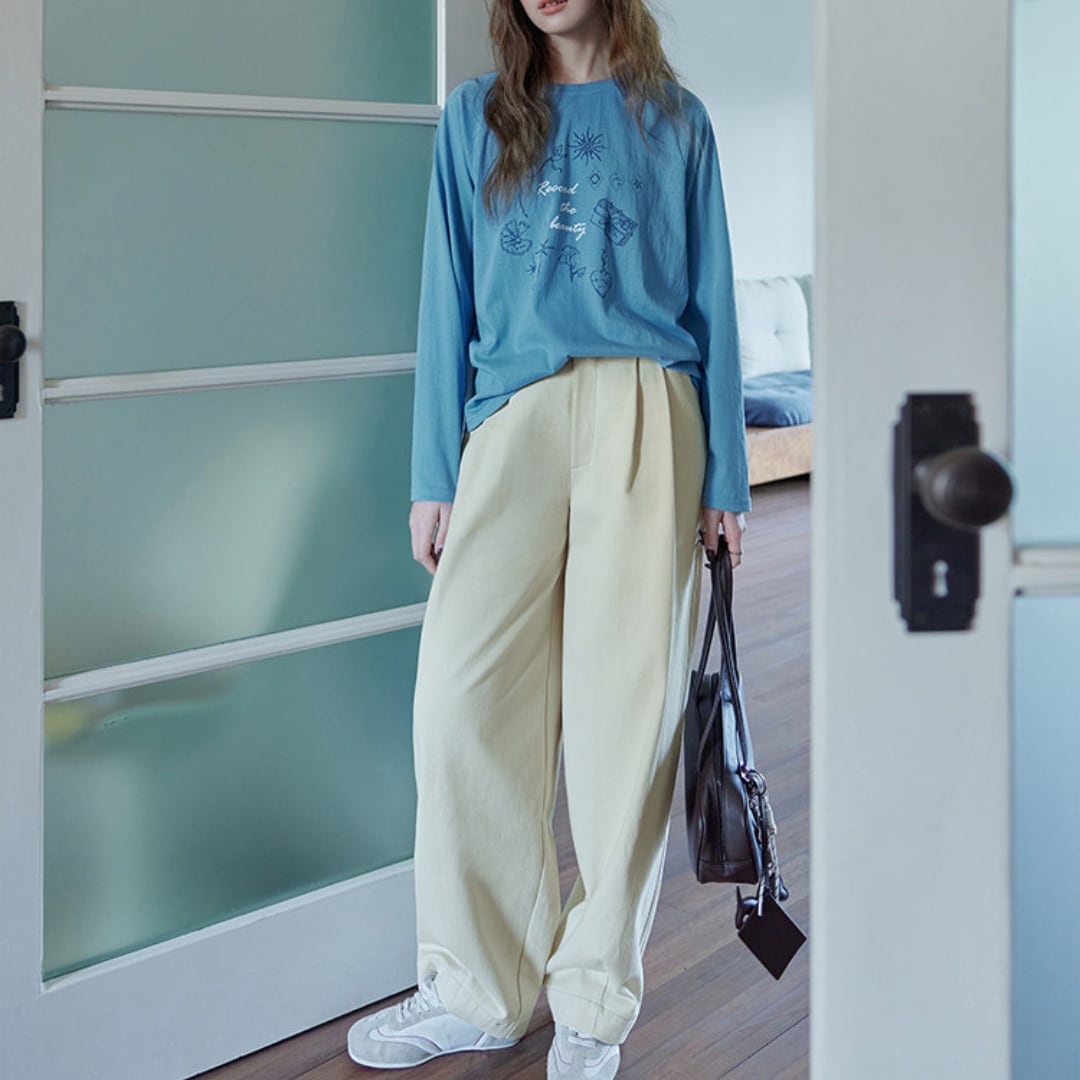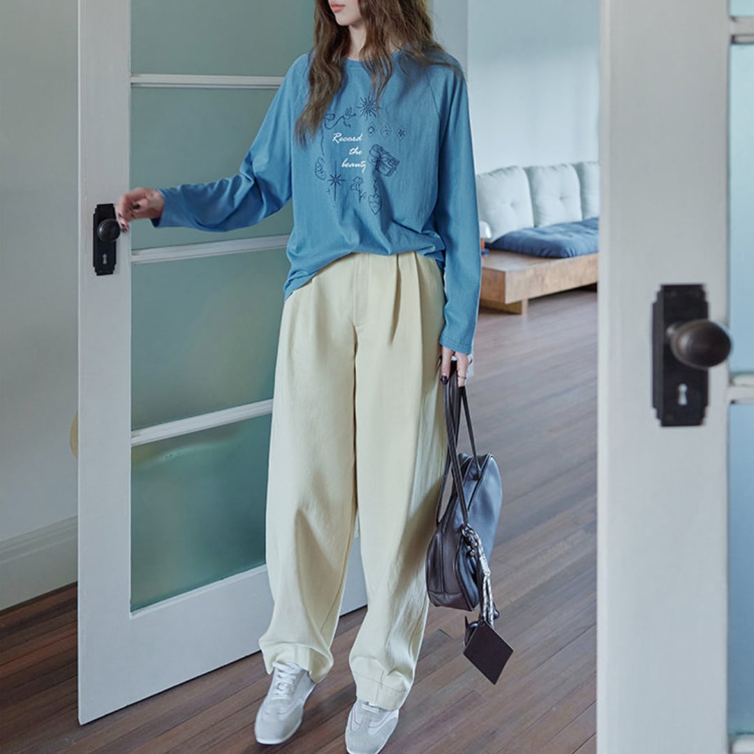 ゆったりとしたワイドシルエットと高めのウエスト設計が特徴の、リラックス感あふれるコットンパンツです。