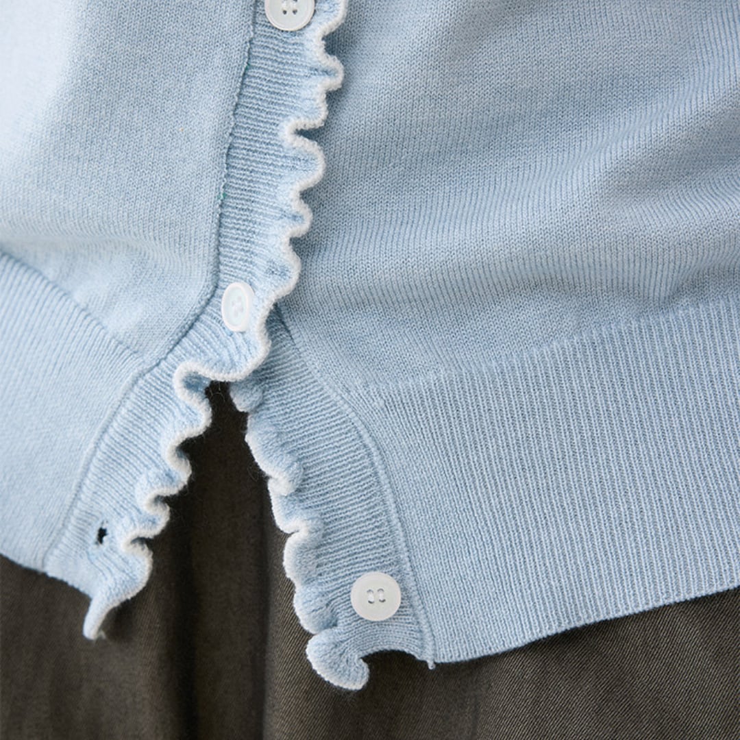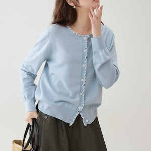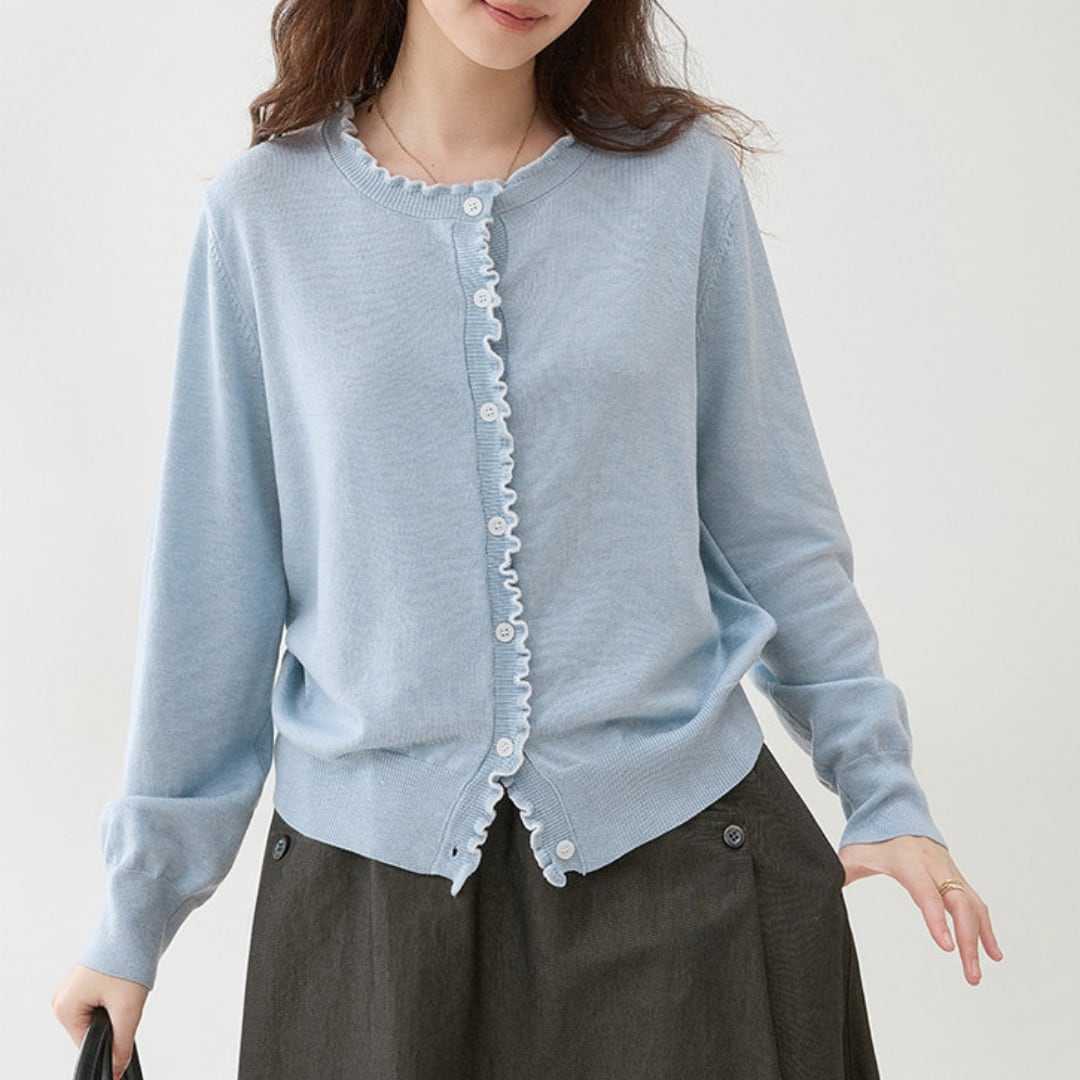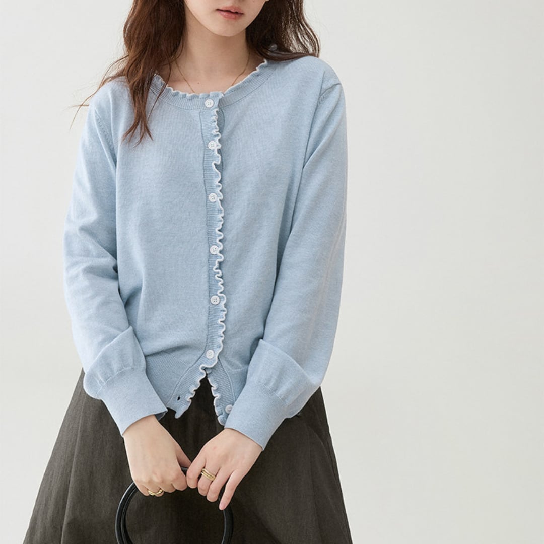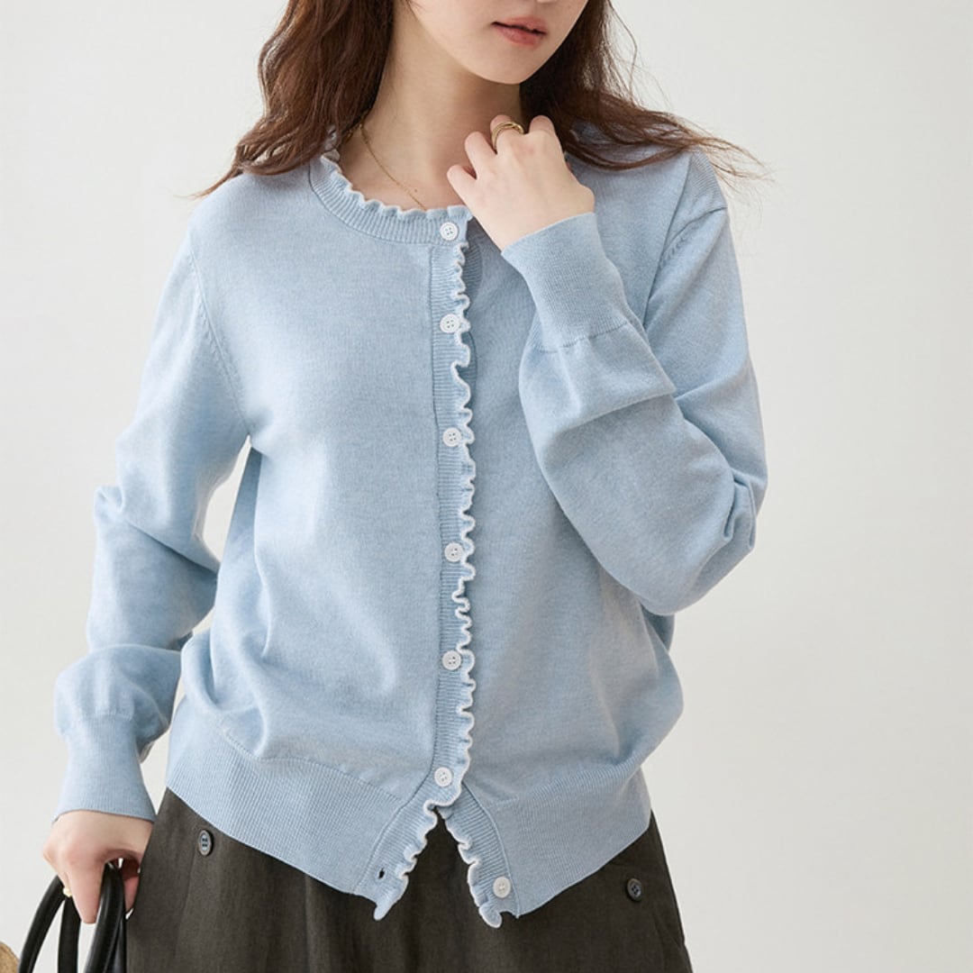 フロントにあしらわれた繊細なフリルディテールが目を引く、やわらかな印象のラウンドネックカーディガンです。
