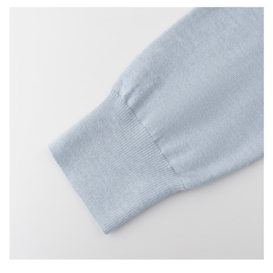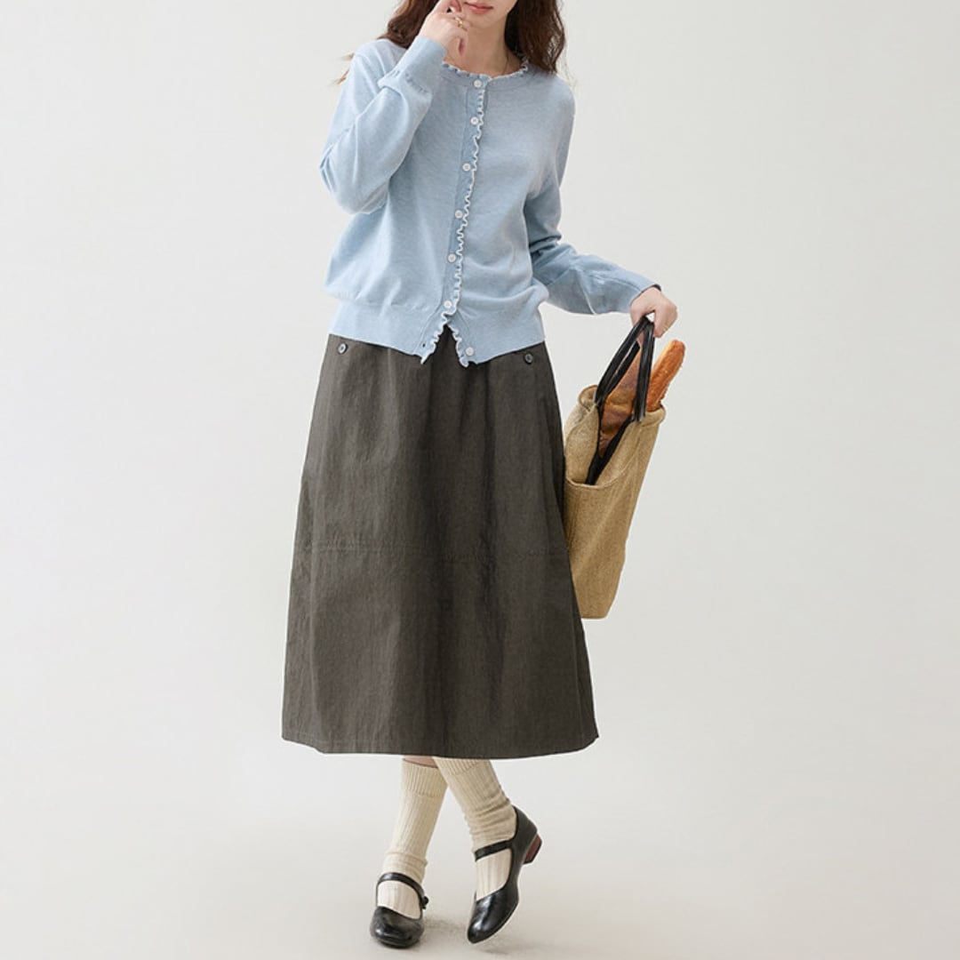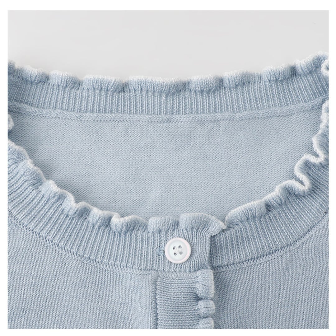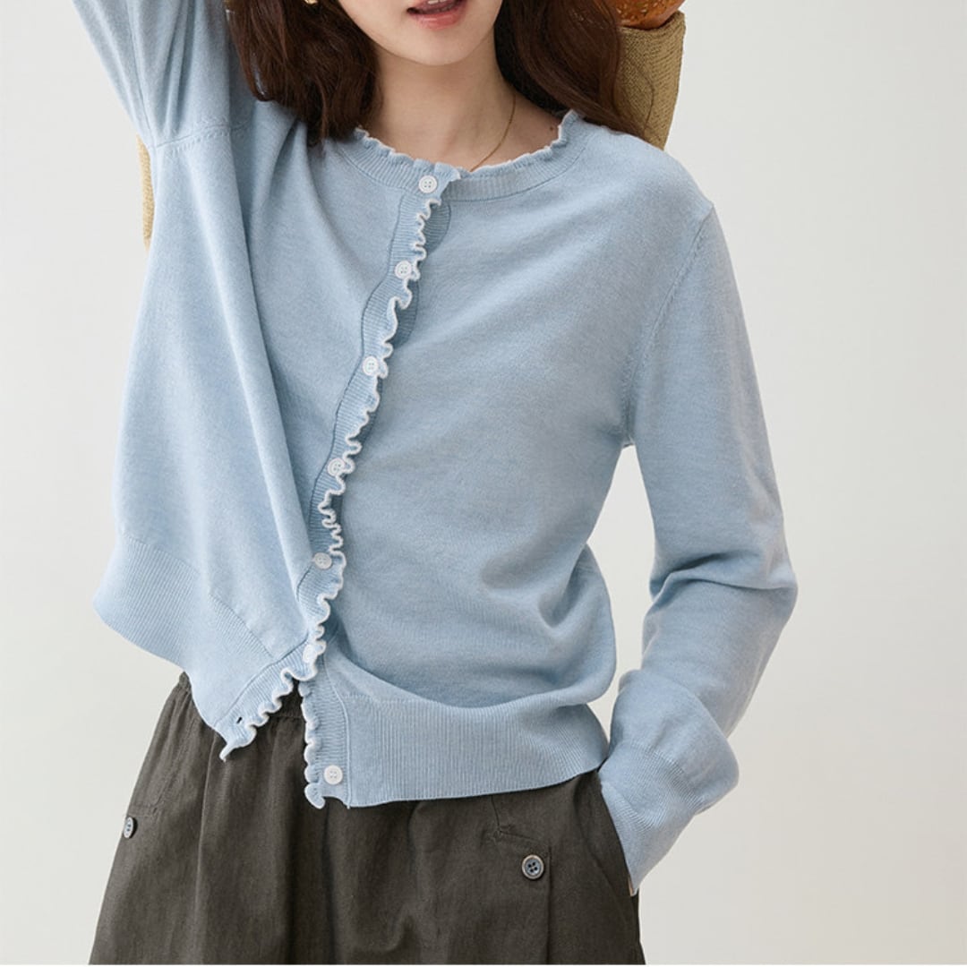 フロントにあしらわれた繊細なフリルディテールが目を引く、やわらかな印象のラウンドネックカーディガンです。