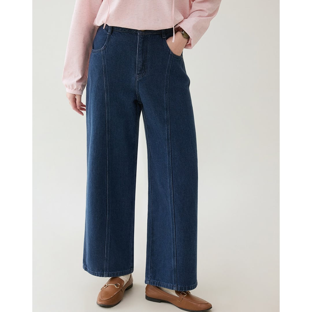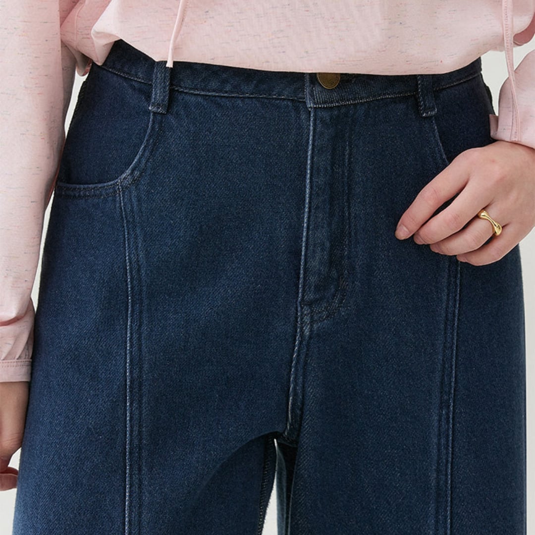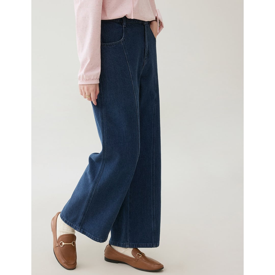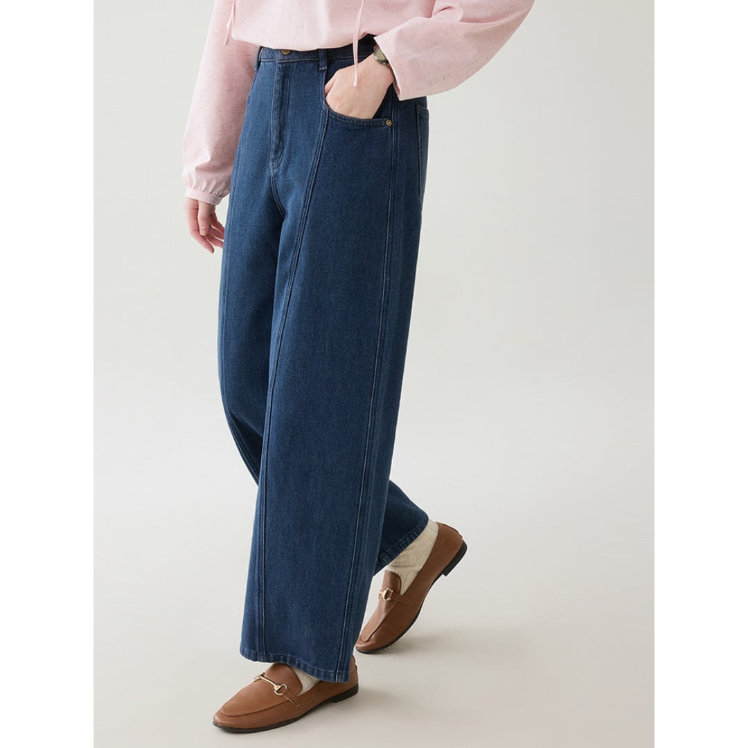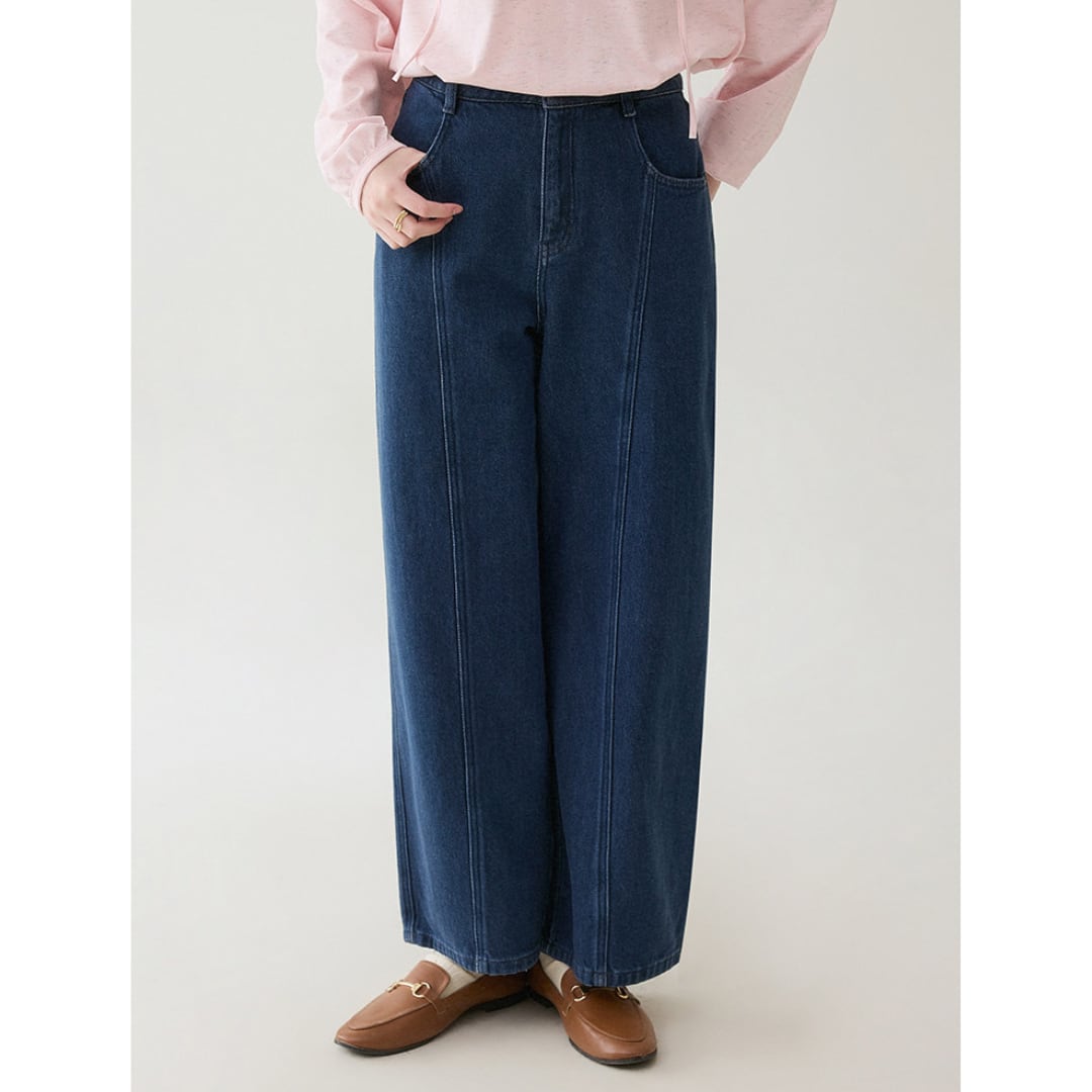 縦の切り替えラインがすっきりとした印象を与える、程よく広がるワイドシルエットのデニムパンツです。