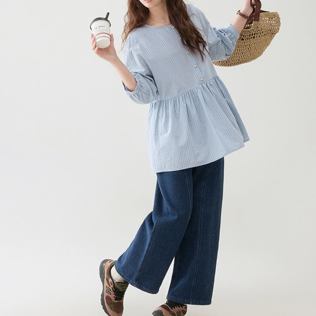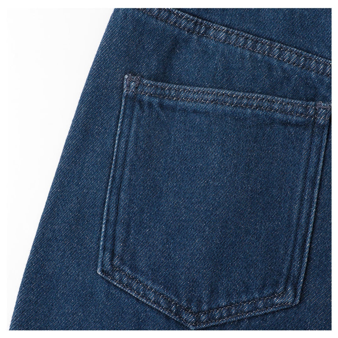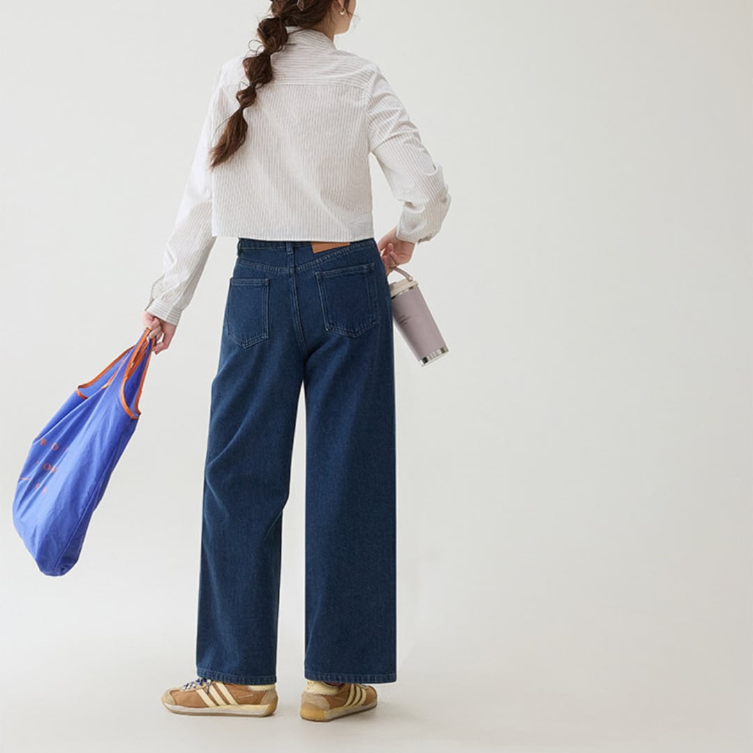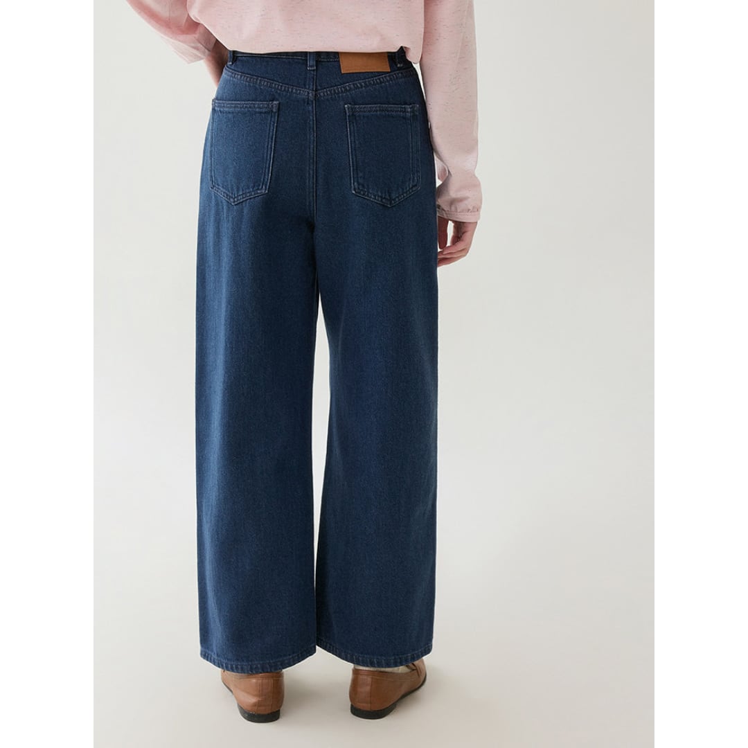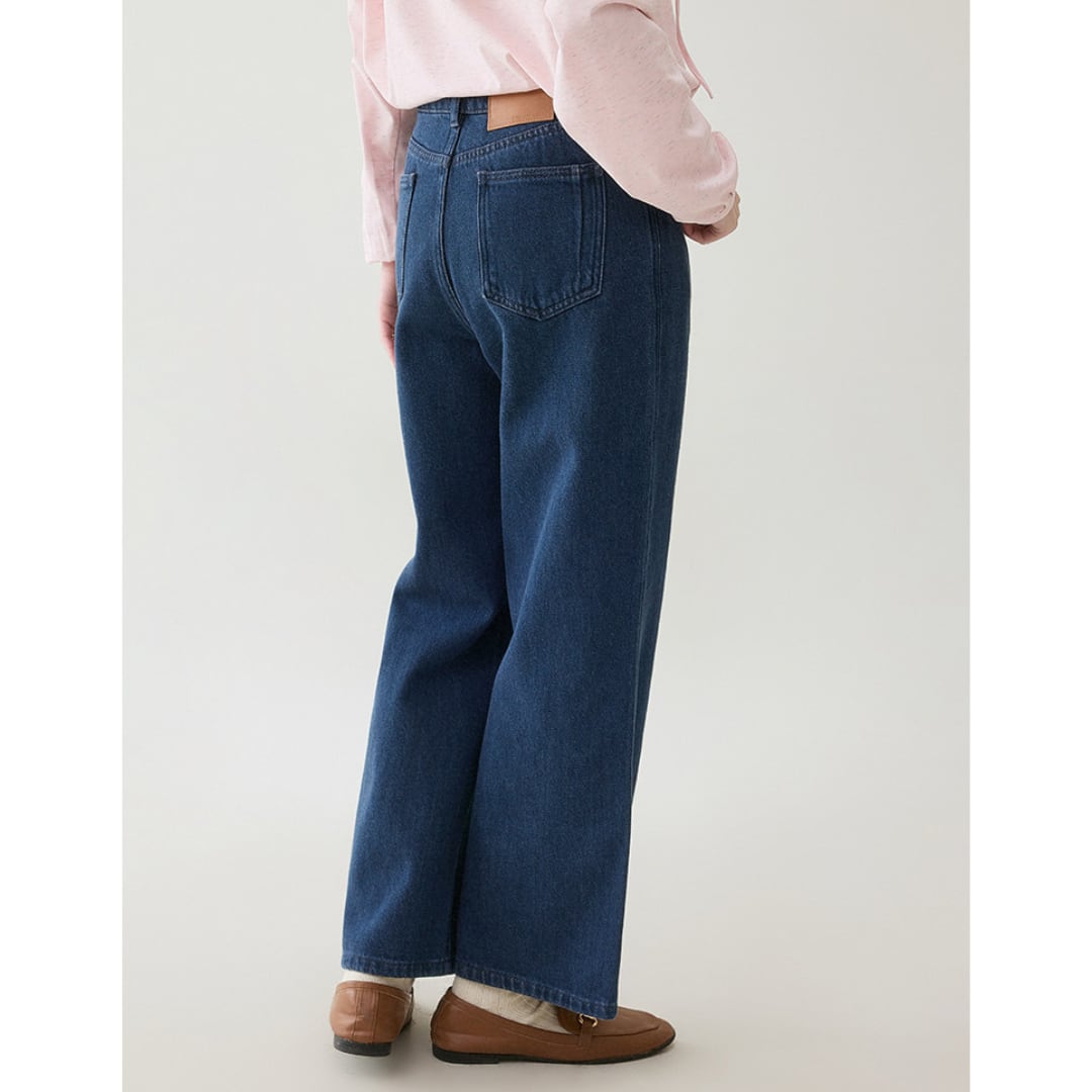 縦の切り替えラインがすっきりとした印象を与える、程よく広がるワイドシルエットのデニムパンツです。