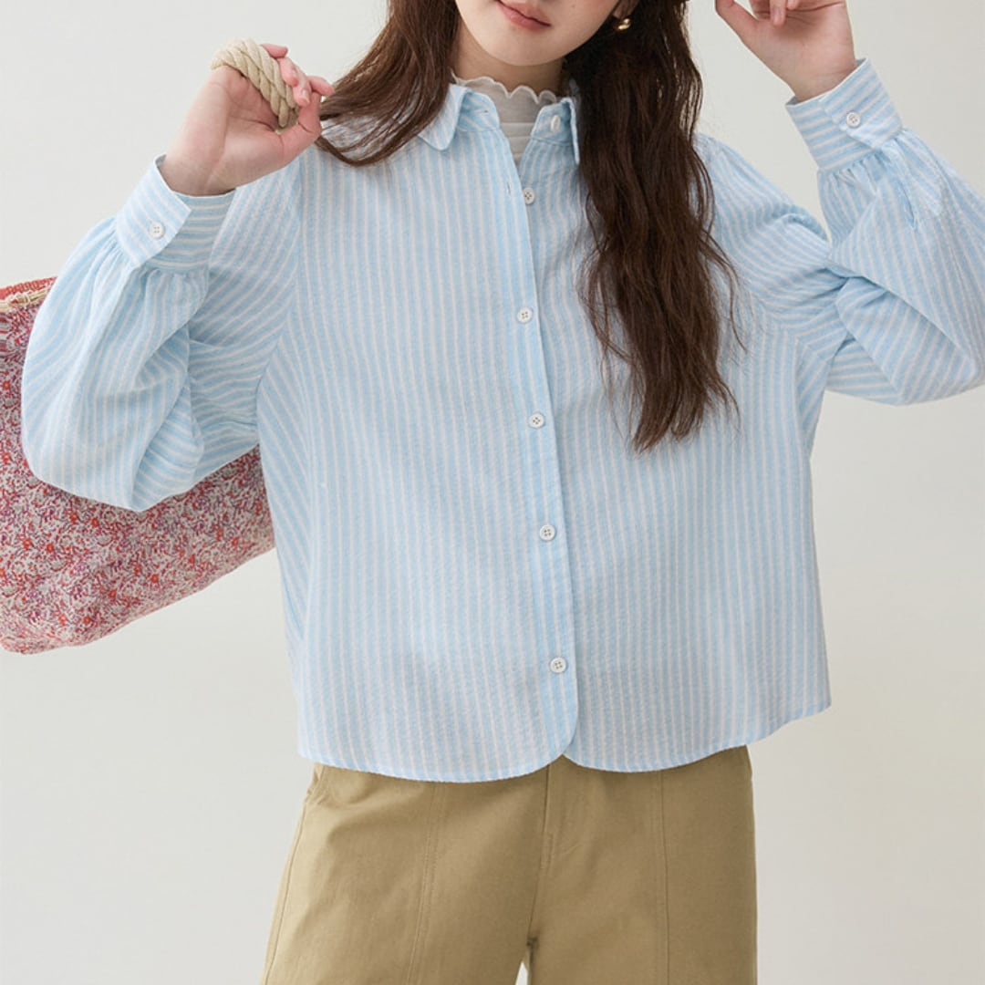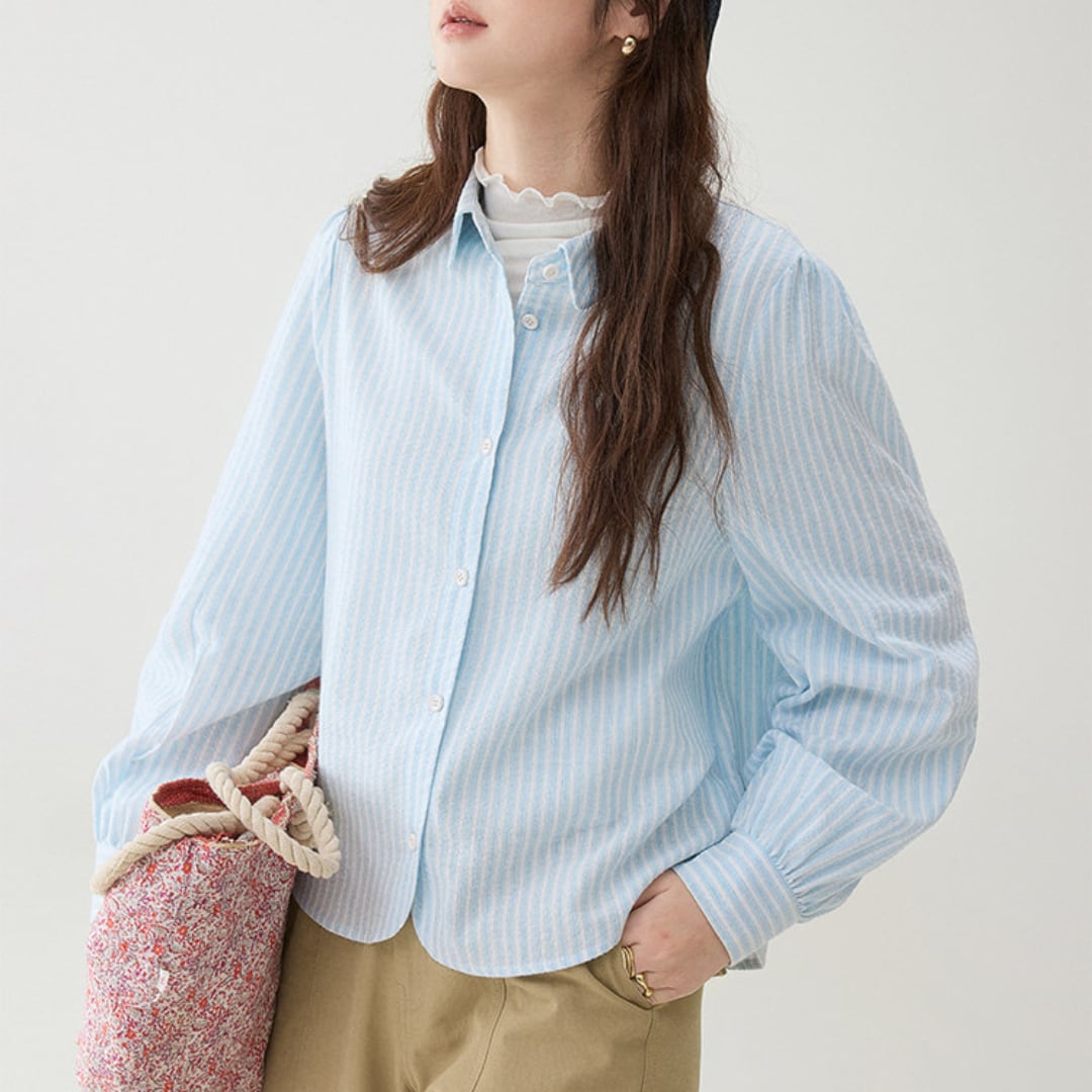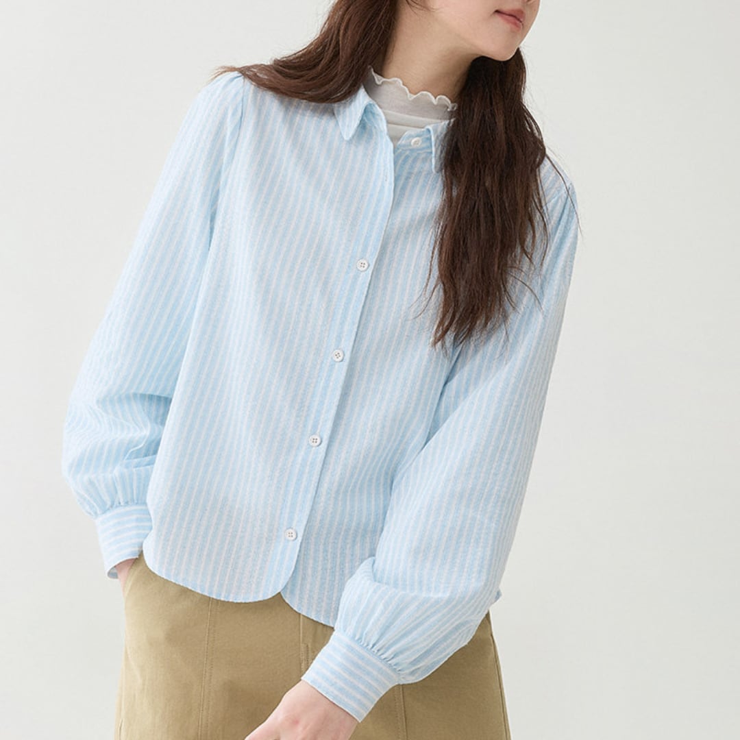 細めのストライプ柄とゆったりとしたシルエットが印象的な、軽やかな雰囲気のボタンシャツブラウス。丸みのある裾ラインと柔らかな生地感が、シンプルながら女性らしいやさしい印象を演出します。