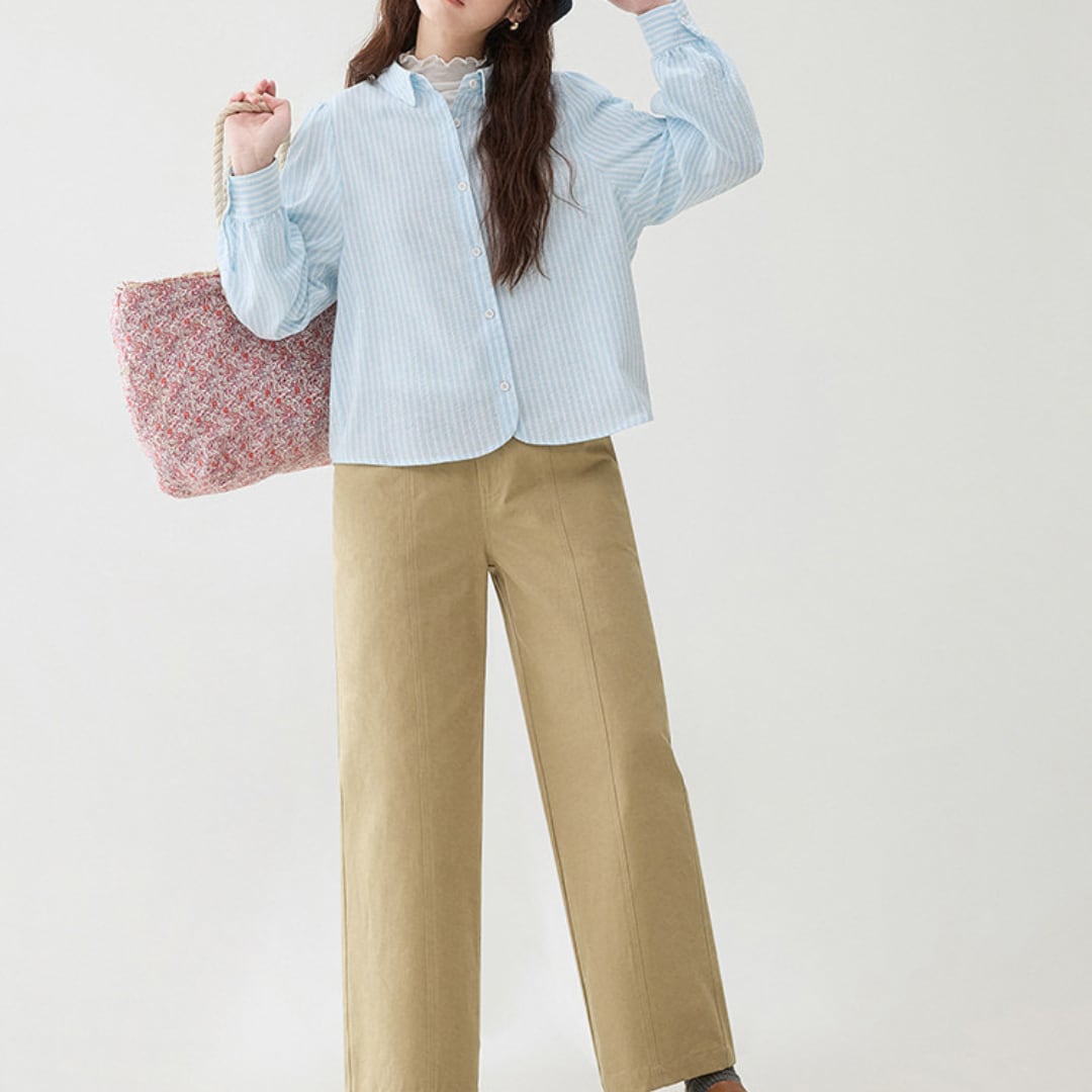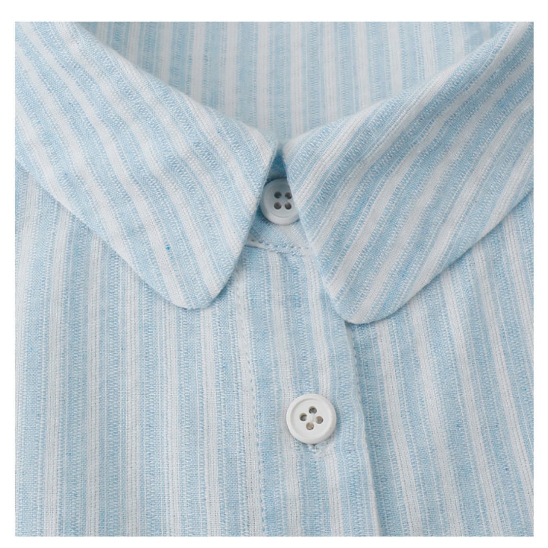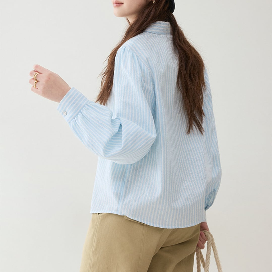 細めのストライプ柄とゆったりとしたシルエットが印象的な、軽やかな雰囲気のボタンシャツブラウス。丸みのある裾ラインと柔らかな生地感が、シンプルながら女性らしいやさしい印象を演出します。