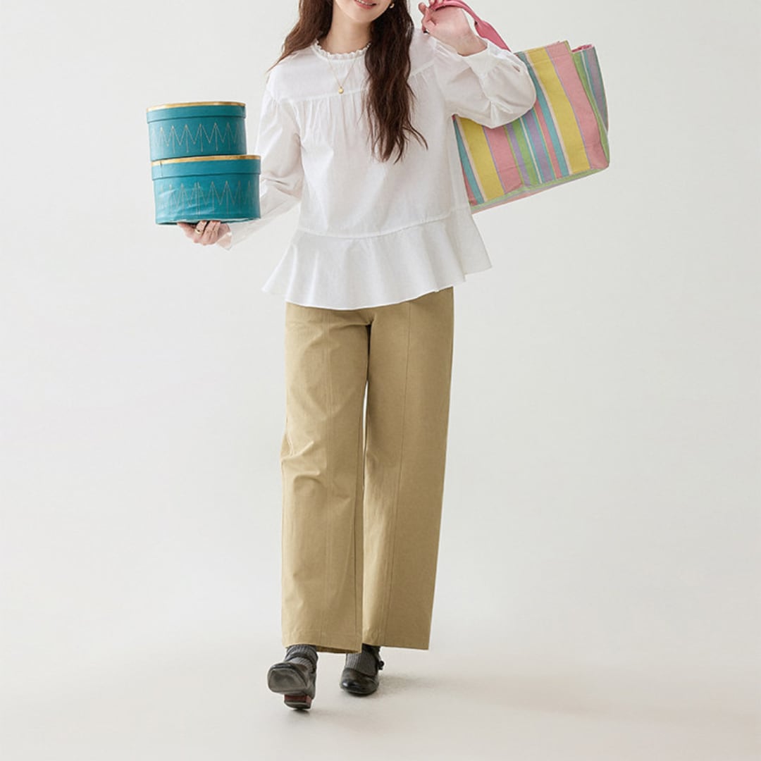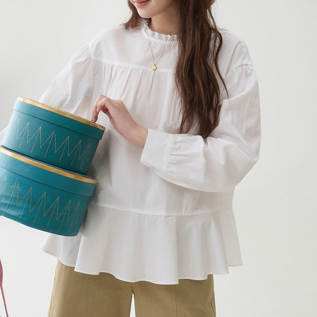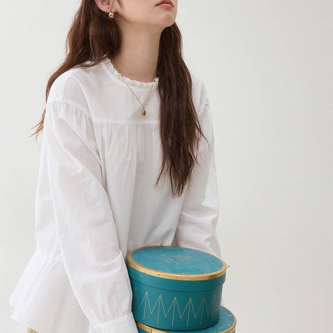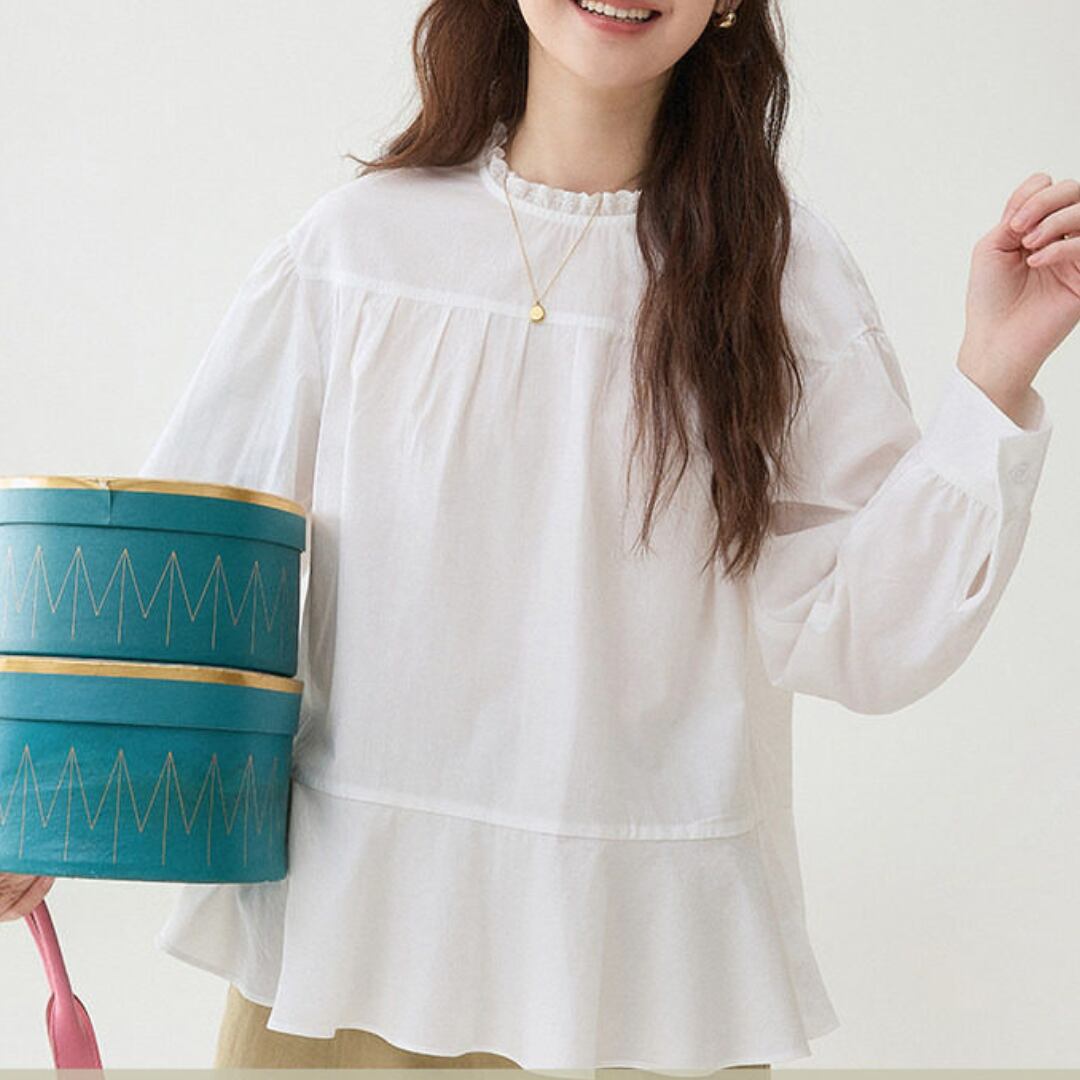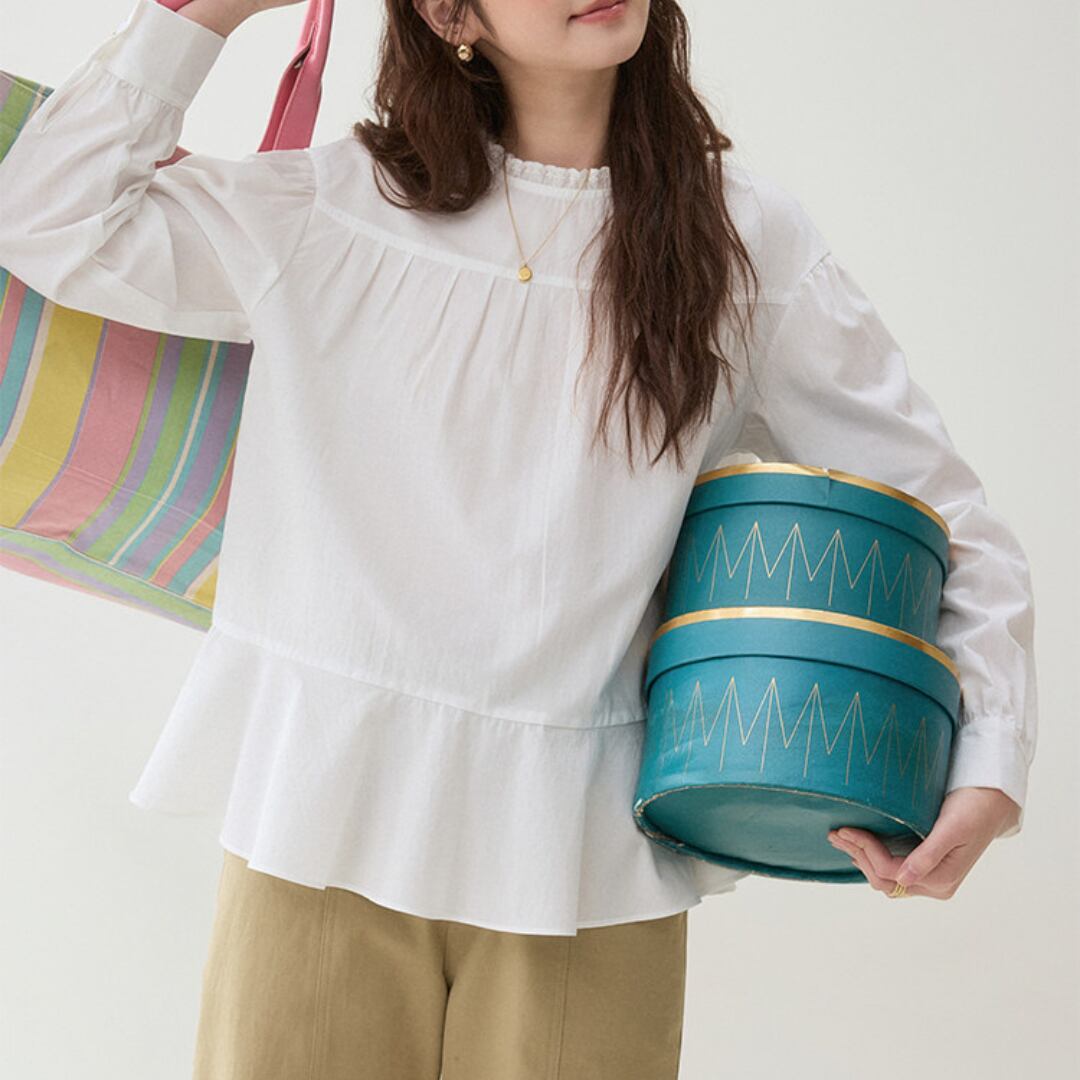 首元のさりげないフリルデザインと胸元のギャザー切り替えがやわらかな雰囲気を演出するブラウス。ゆったりとしたシルエットと軽やかな生地感が、ナチュラルで上品な印象を引き立てます。