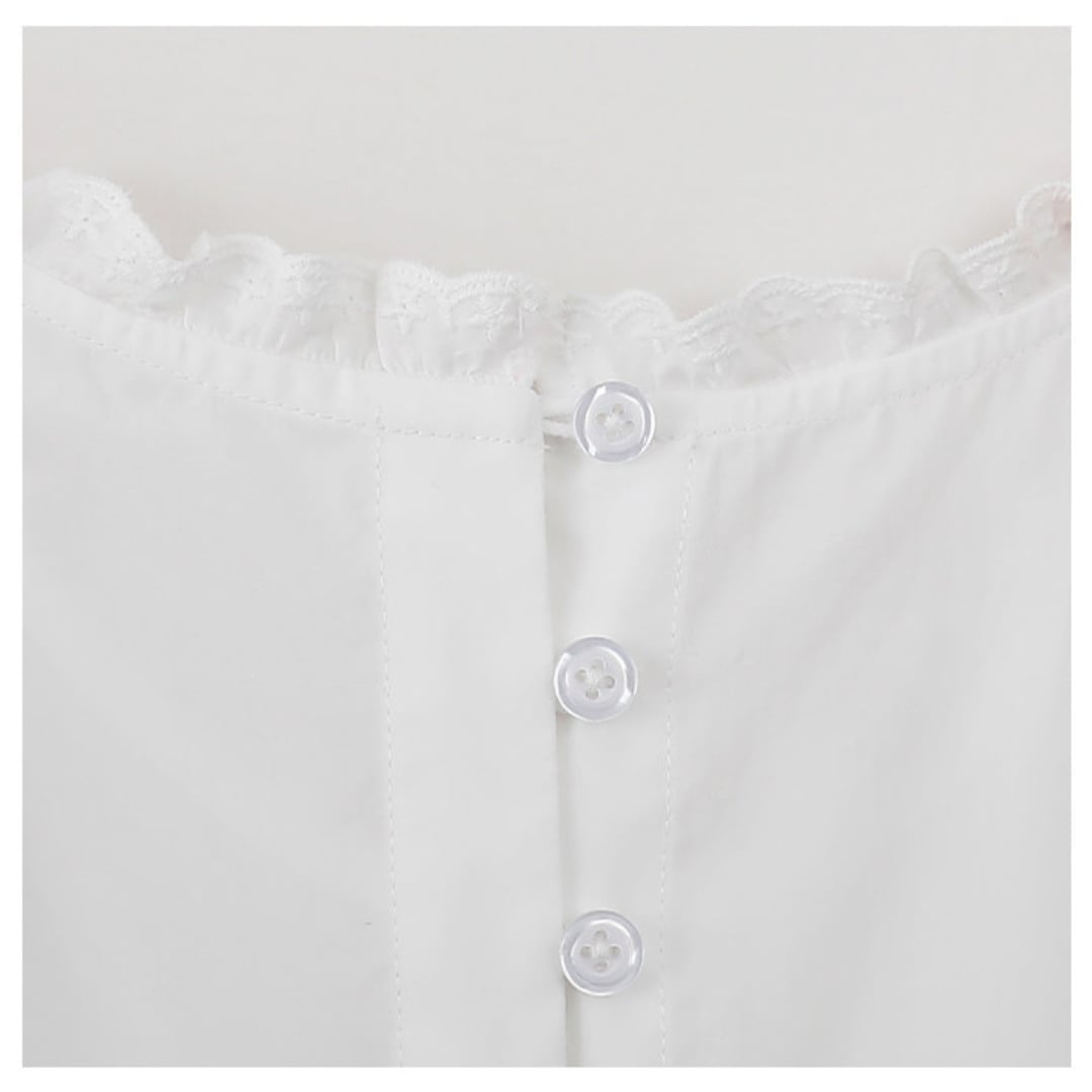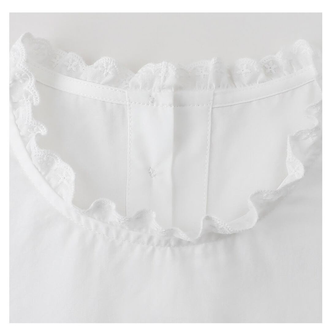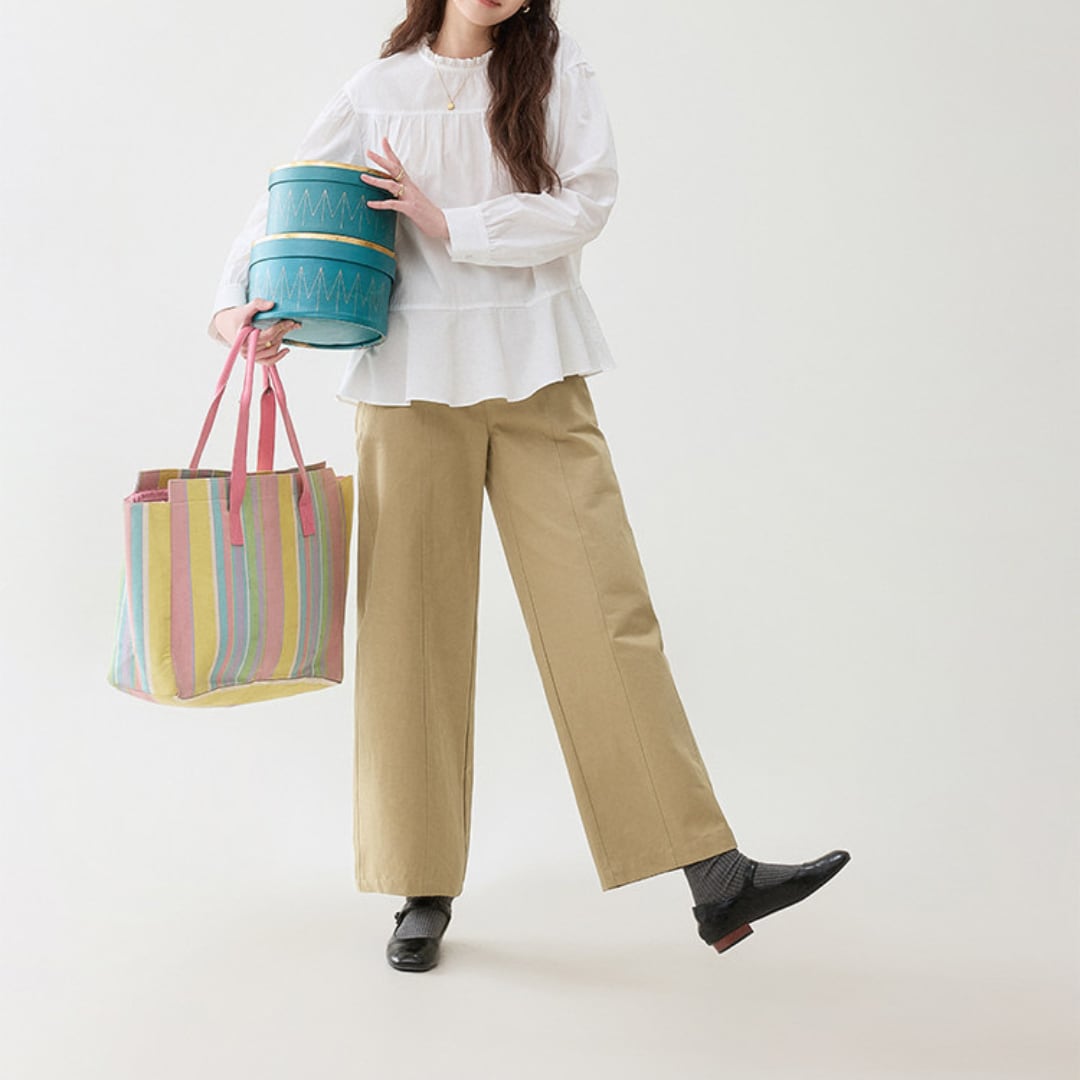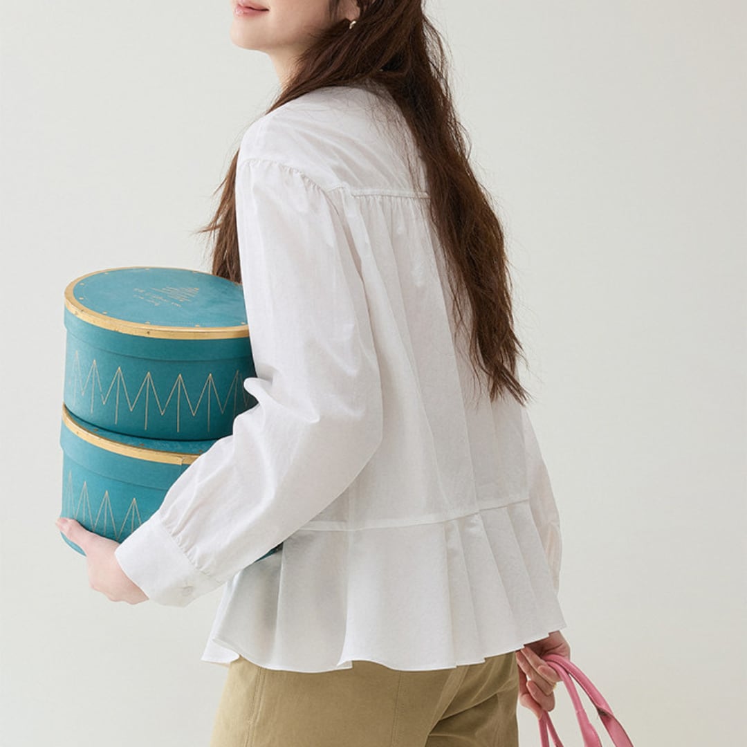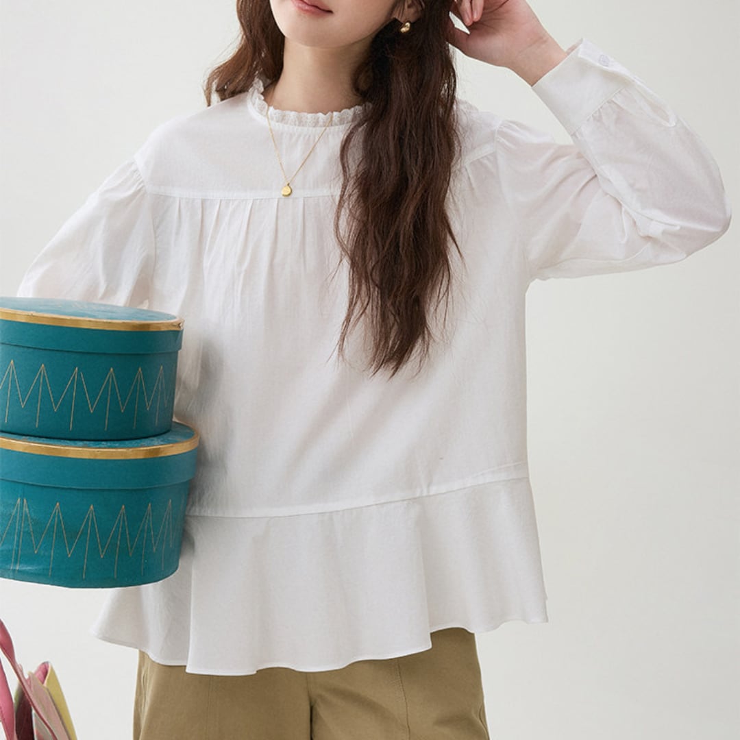 首元のさりげないフリルデザインと胸元のギャザー切り替えがやわらかな雰囲気を演出するブラウス。ゆったりとしたシルエットと軽やかな生地感が、ナチュラルで上品な印象を引き立てます。