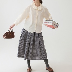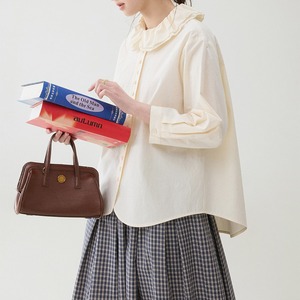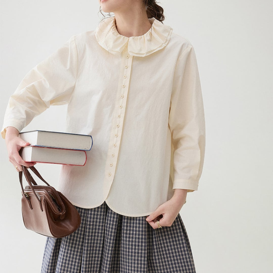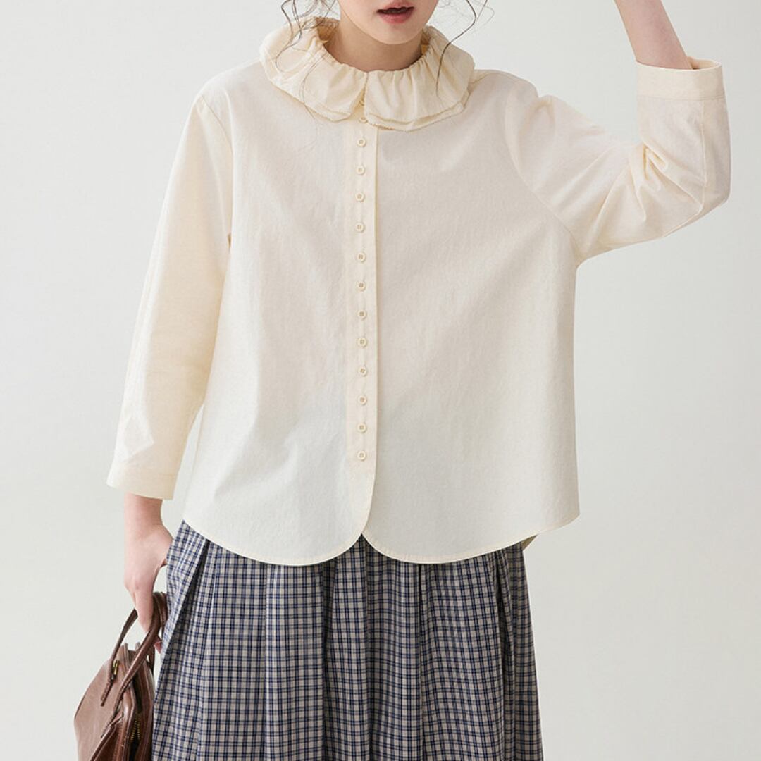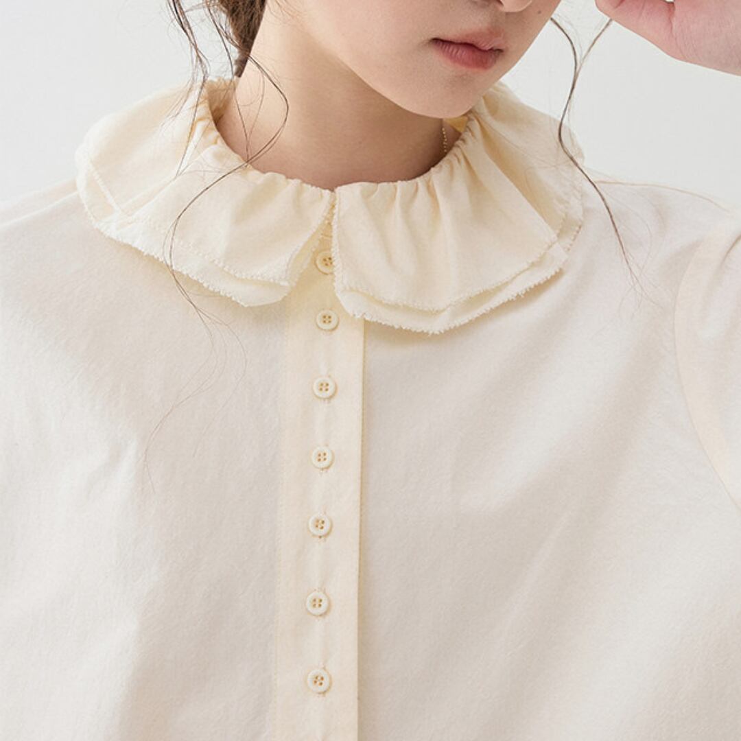 首元のやわらかなフリルカラーが印象的な、上品でやさしい雰囲気のブラウス。
