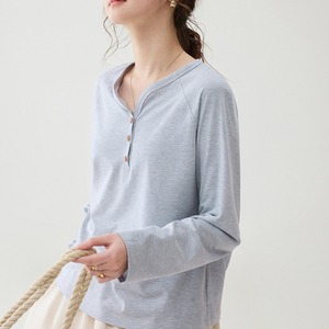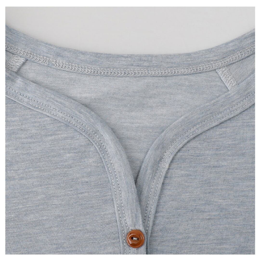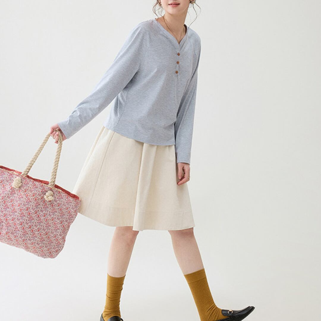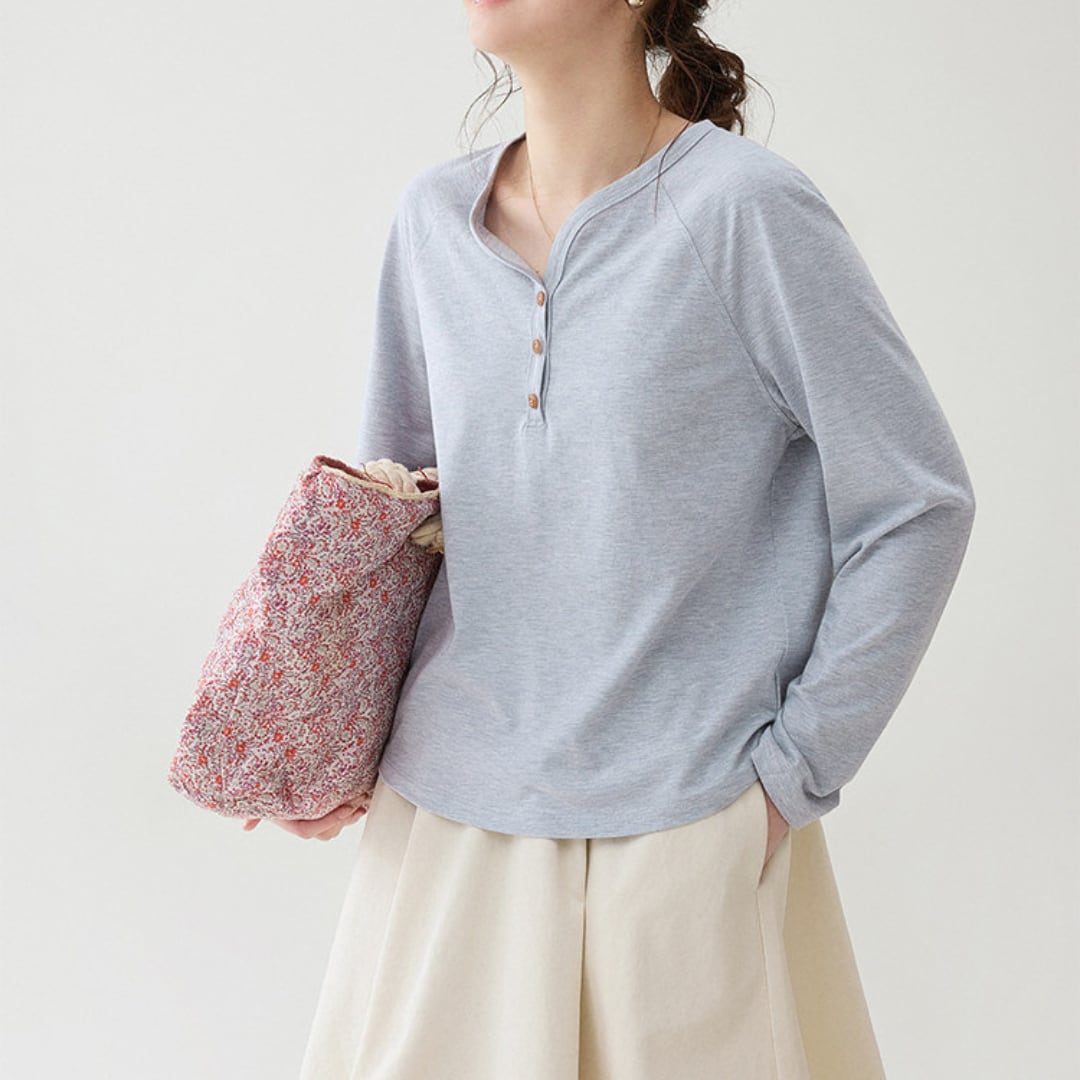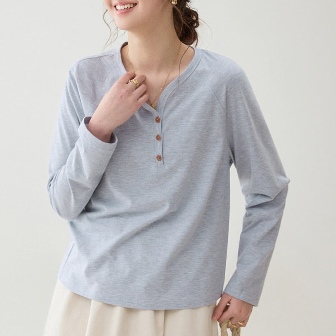 フロントのボタンデザインがさりげないアクセントになった、シンプルで着回しやすいヘンリーネックの長袖トップス。