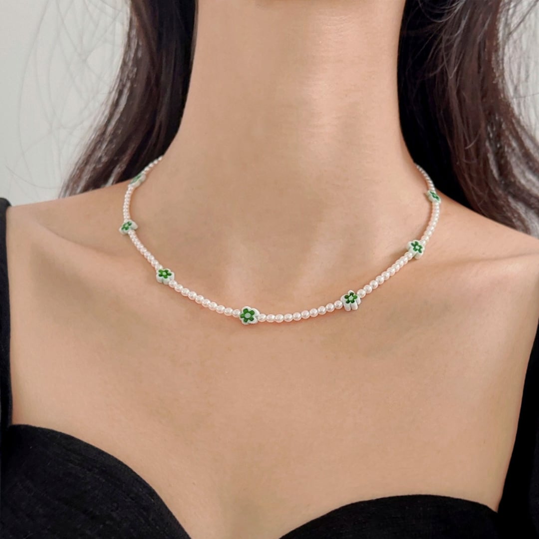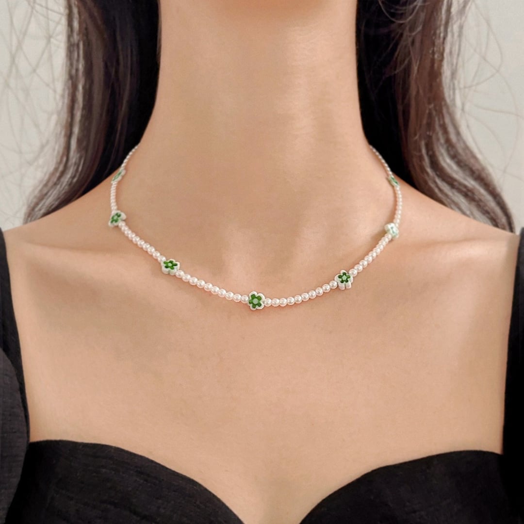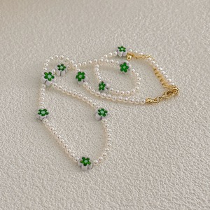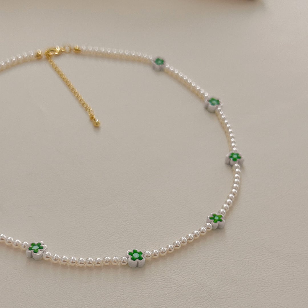 小粒のパールを連ねた繊細なチェーンに、可憐なフラワーモチーフをアクセントとしてあしらった上品なデザインのネックレス。