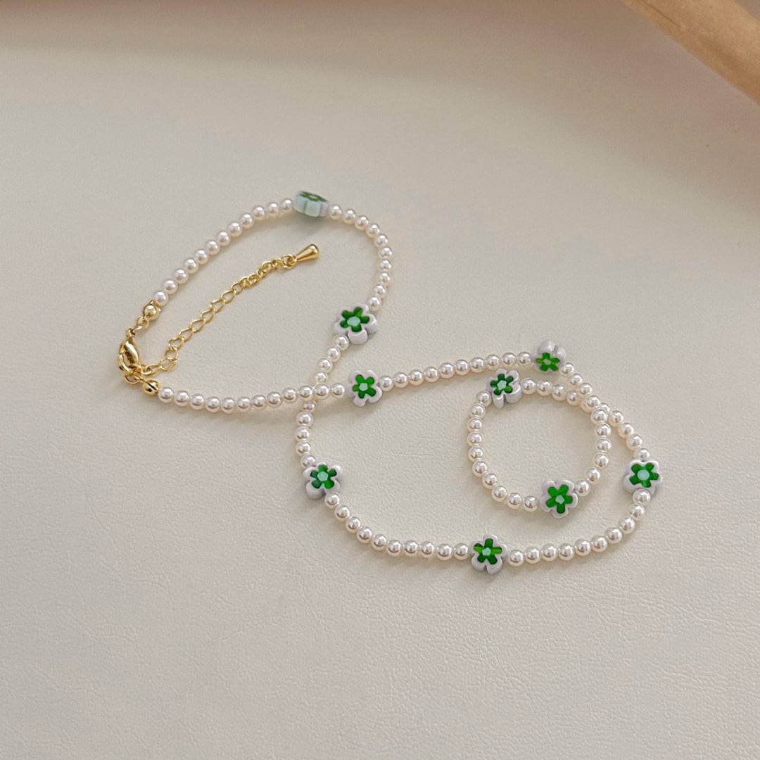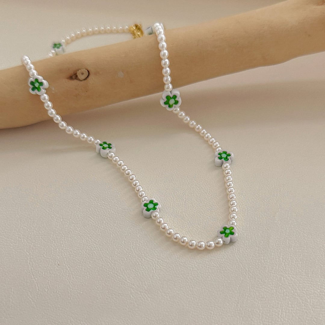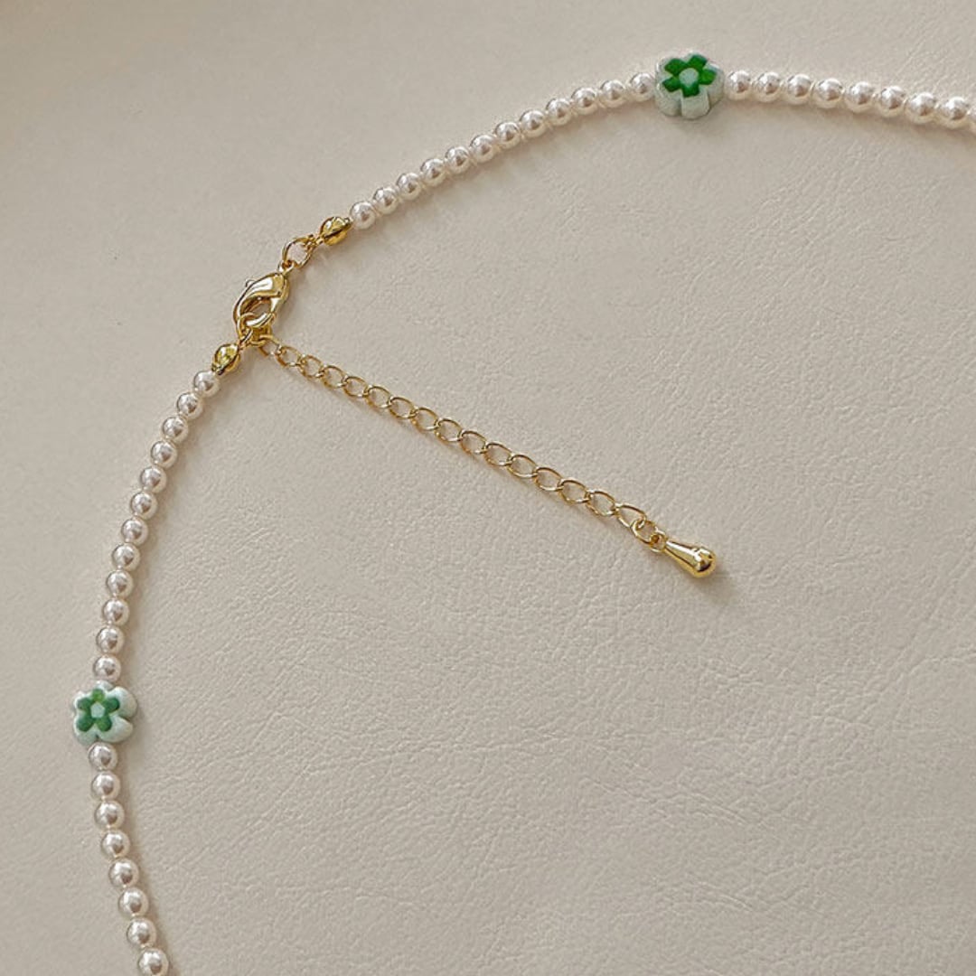 小粒のパールを連ねた繊細なチェーンに、可憐なフラワーモチーフをアクセントとしてあしらった上品なデザインのネックレス。