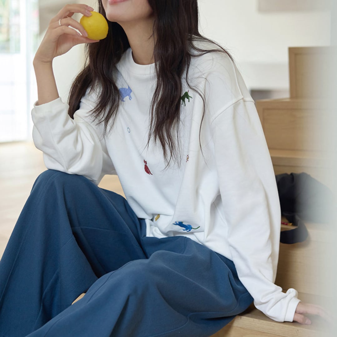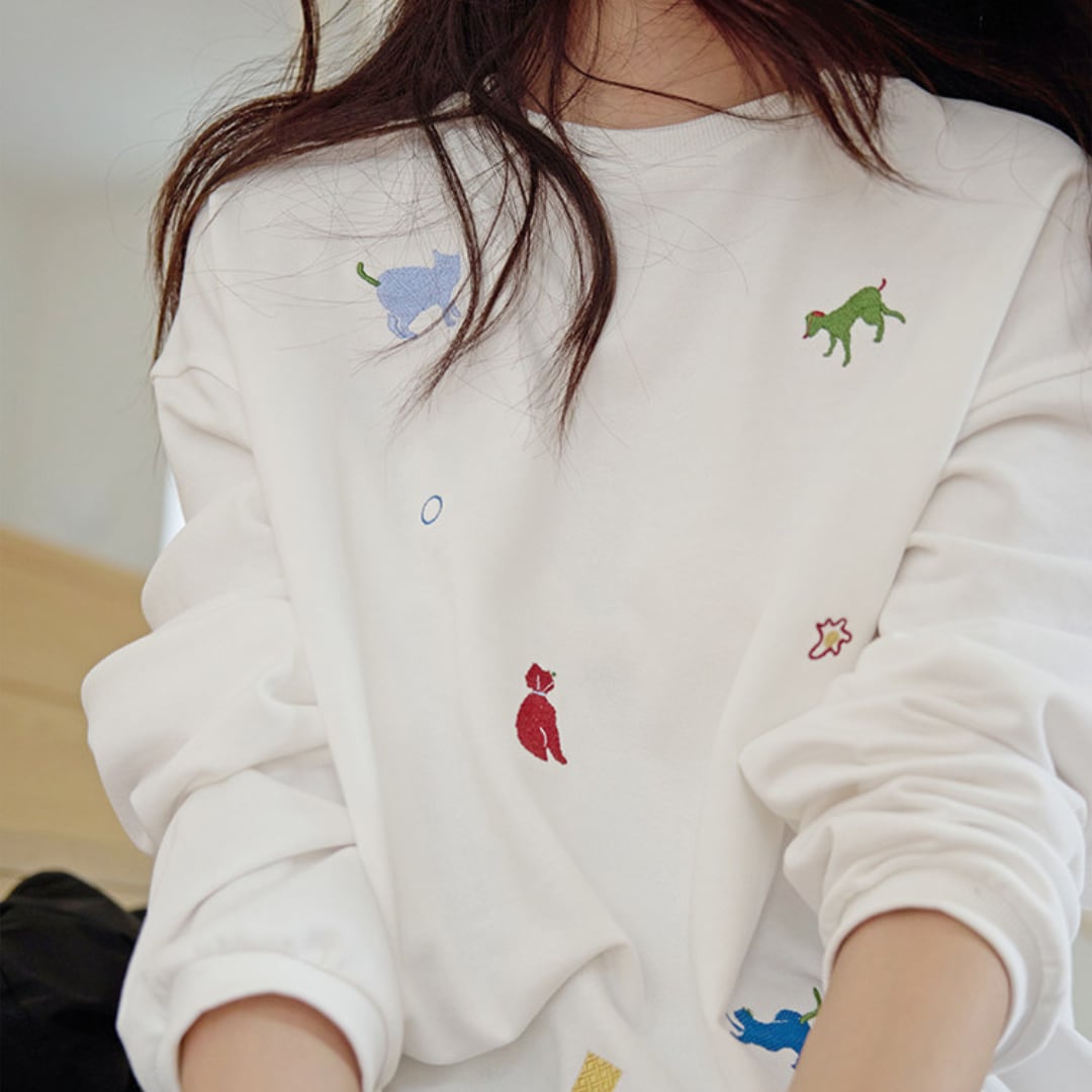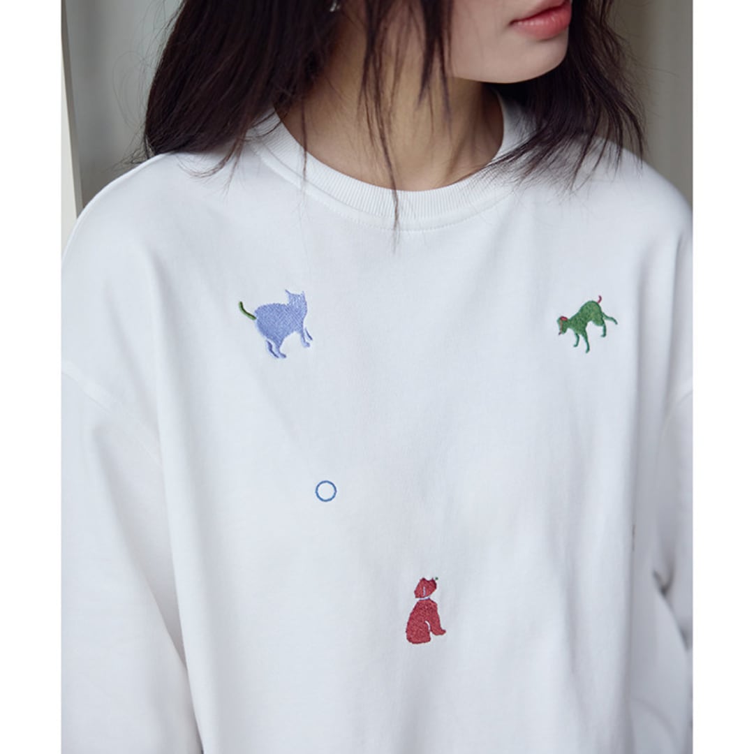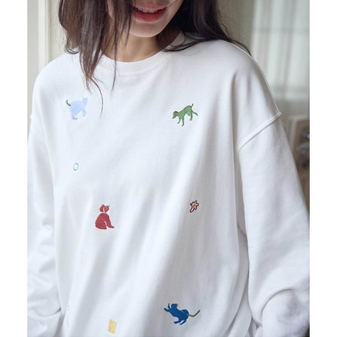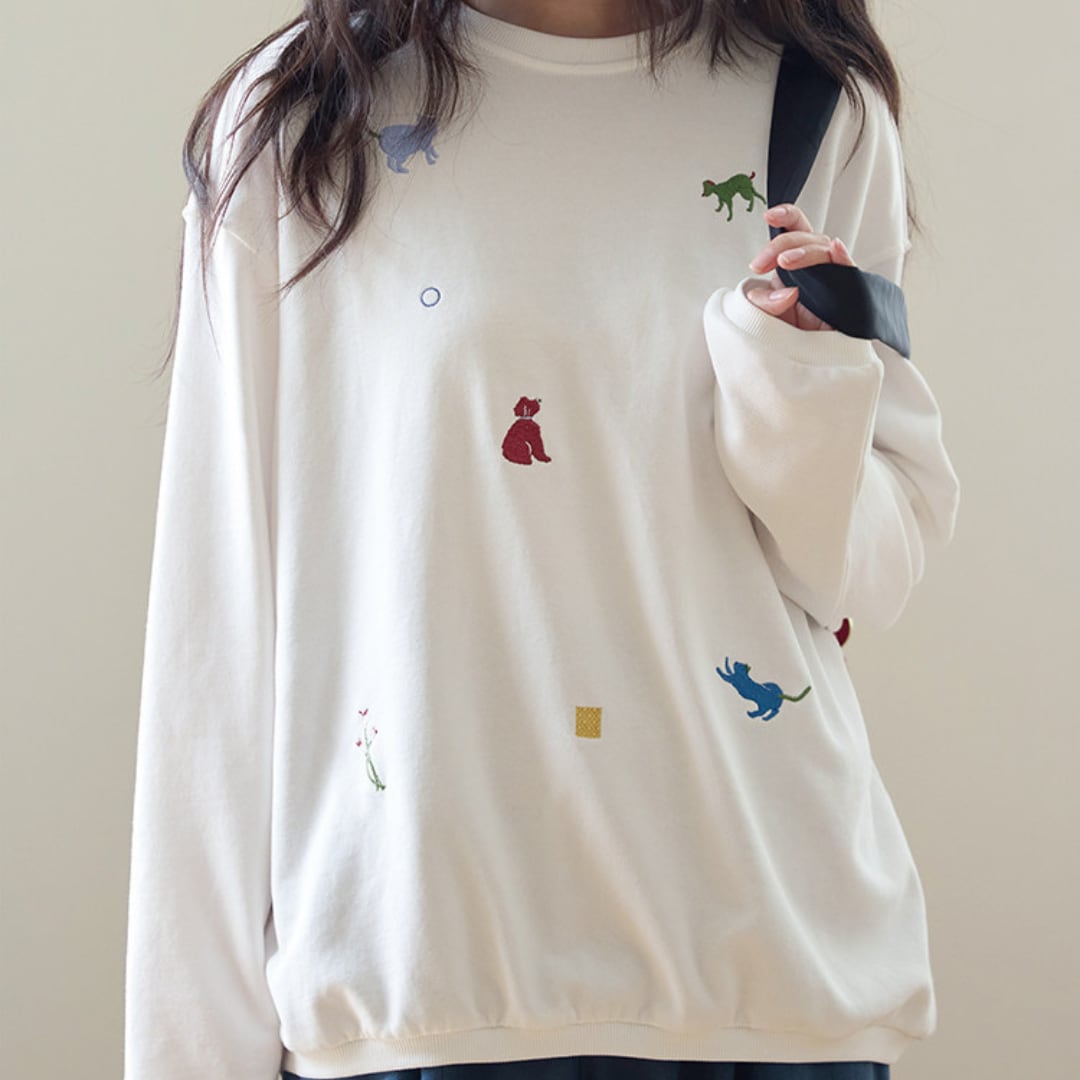 さまざまなアニマルモチーフの刺繍を散りばめた、遊び心のあるデザインが魅力のルーズシルエットスウェット。シンプルなベースにカラフルな刺繍がアクセントとなり、程よくゆとりのあるシルエットでリラックス感のある着こなしを楽しめる一着。